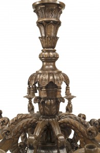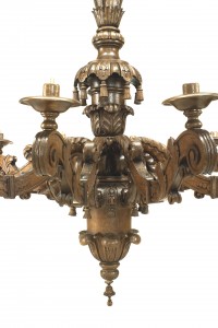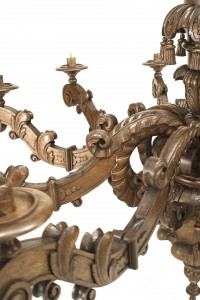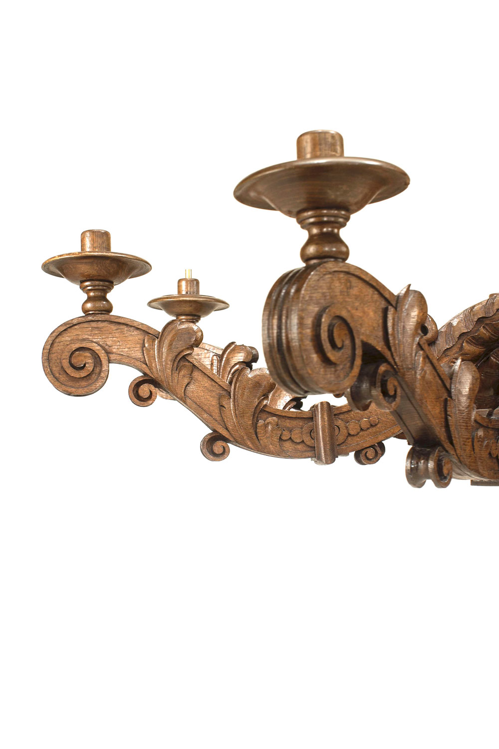 2 Italian Rococo style (19th Century) large carved oak chandeliers with 10 scroll arms emanating from a carved center post with carved tassel trim. (PRICED EACH)