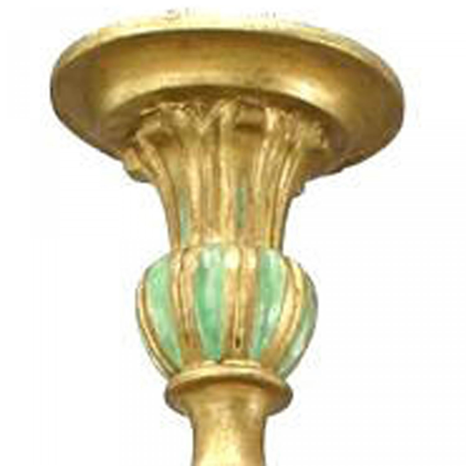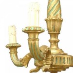 Italian Rococo style gold painted wood 3 arm chandelier with green trim and carved tassel finial bottom.