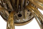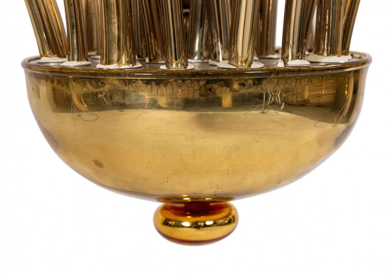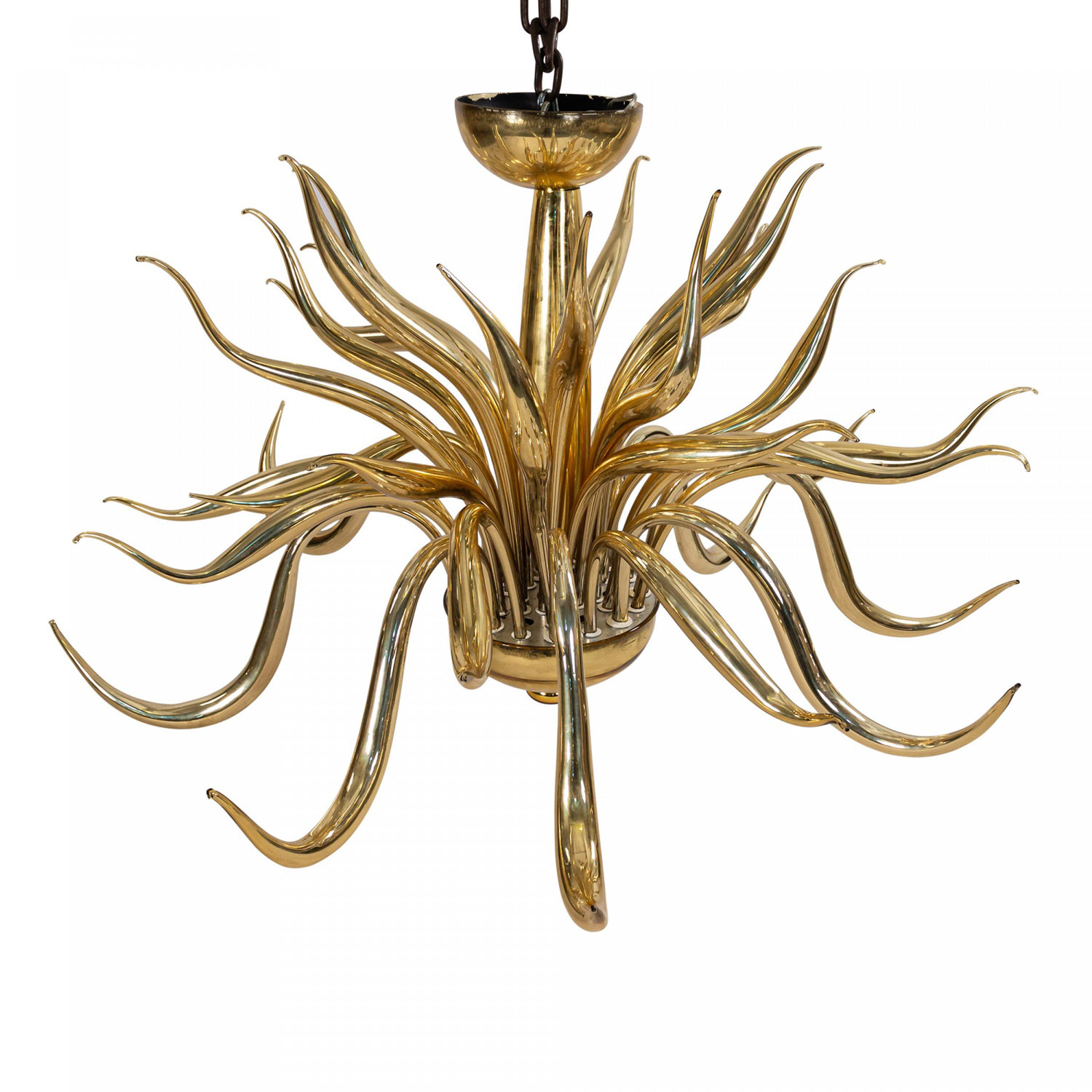 Post-War Italian Venetian Murano gilt glass chandelier with multiple scroll arms emanating from a center shaft with a bowl bottom..