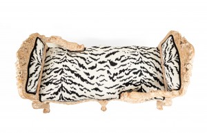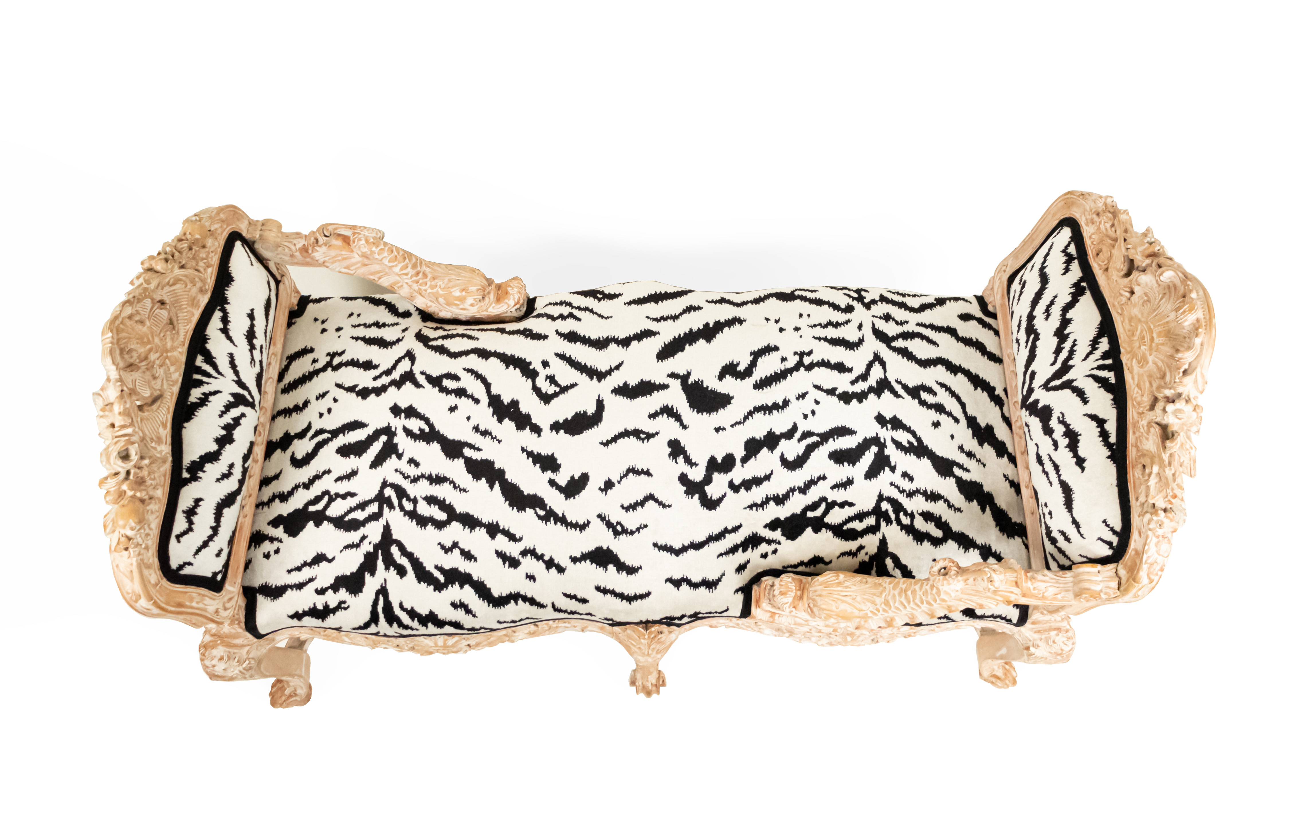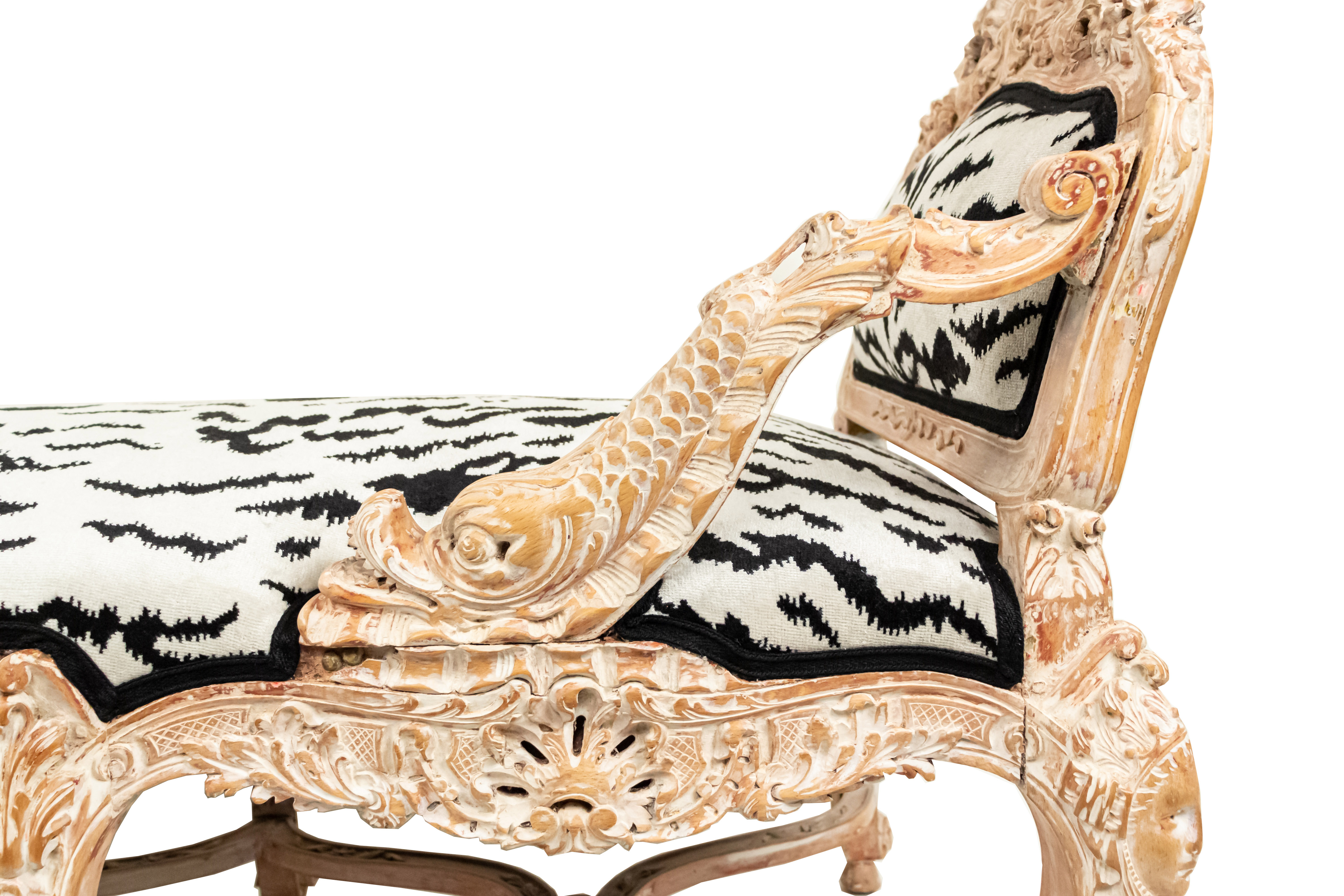Italian Venetian style (19th Century) bleached tete-a-tete conversation seat with carved and upholstered black and white zebra print sides and dolphin arms..