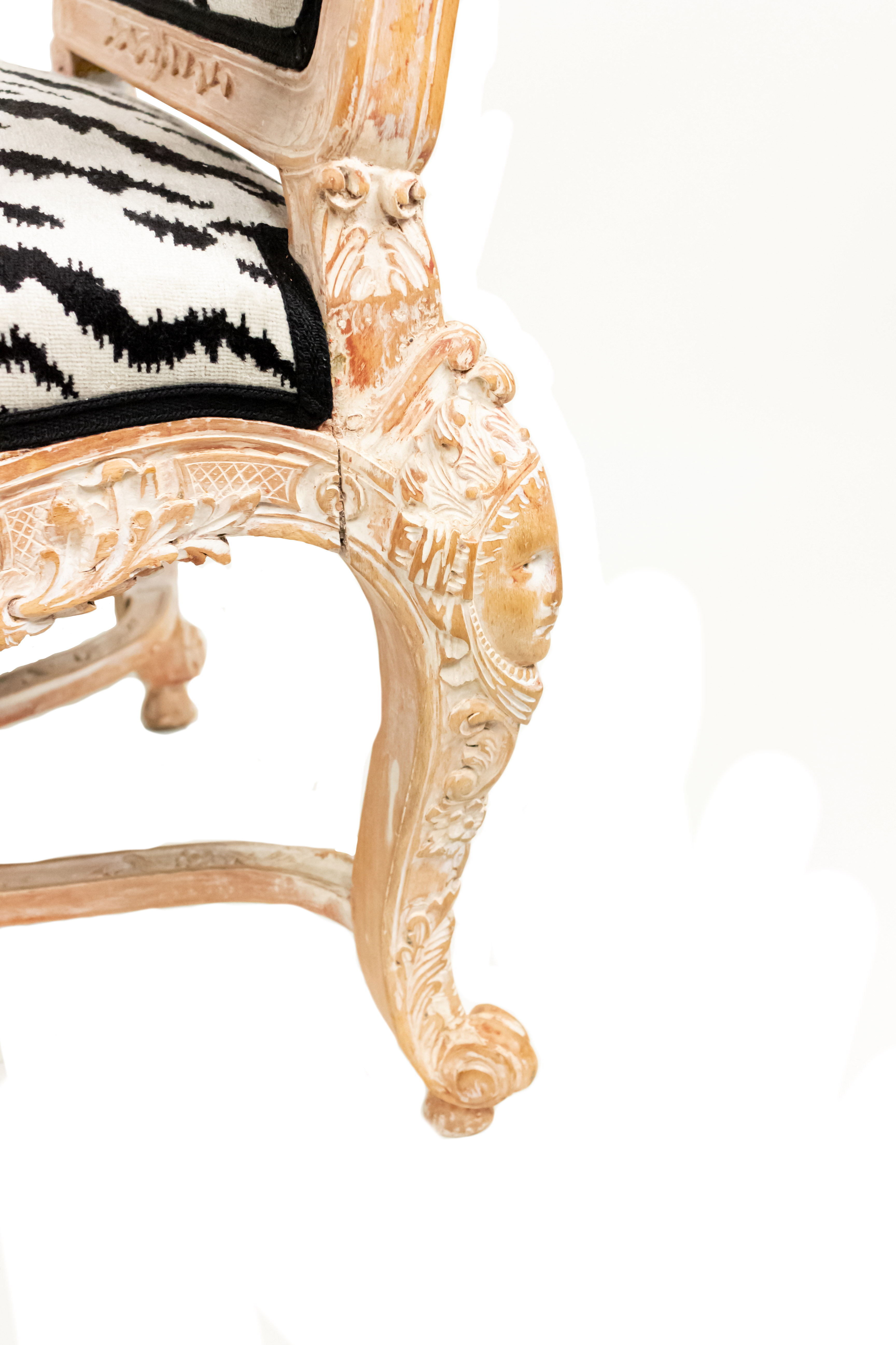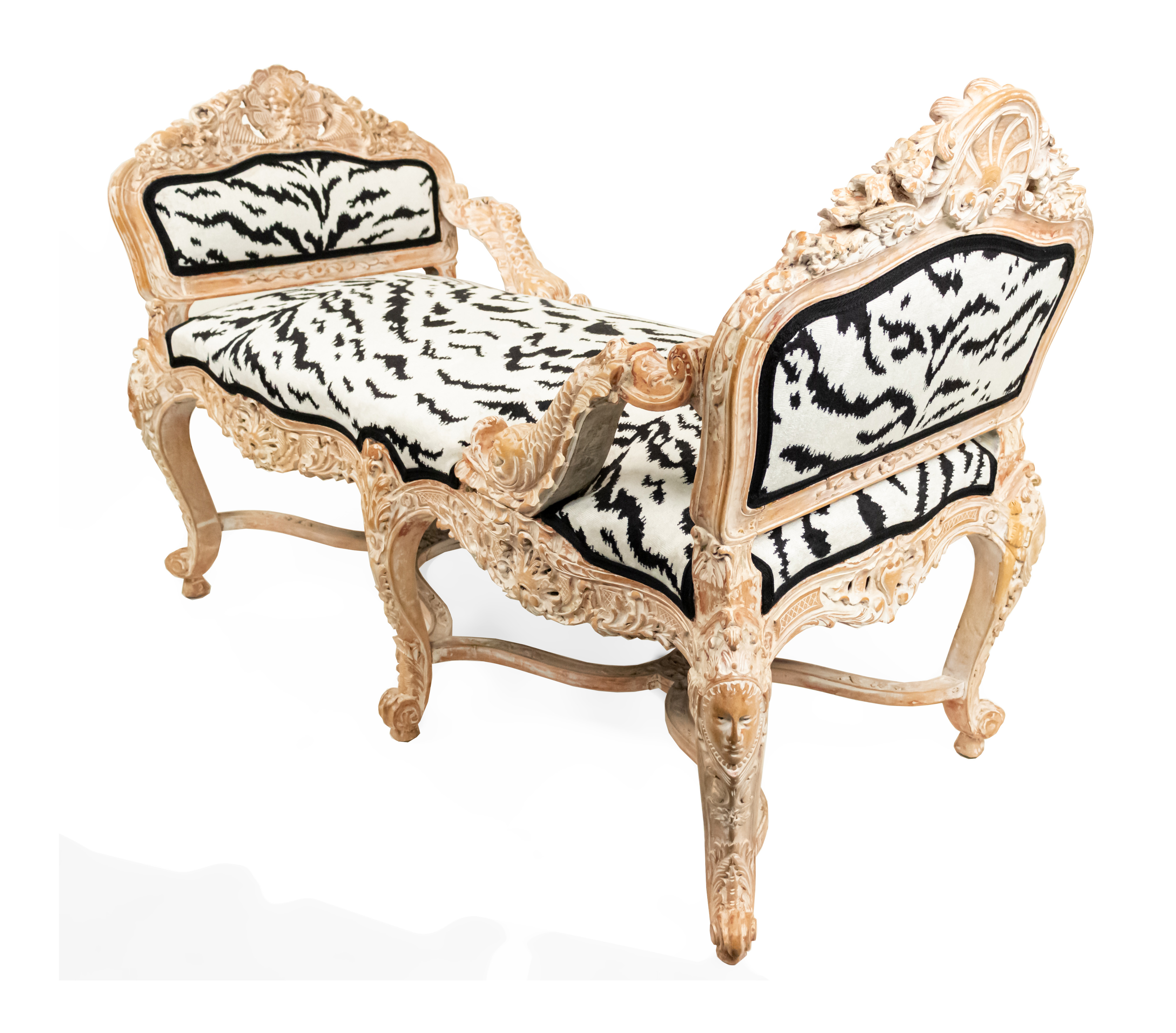 Italian Venetian style (19th Century) bleached tete-a-tete conversation seat with carved and upholstered black and white zebra print sides and dolphin arms.