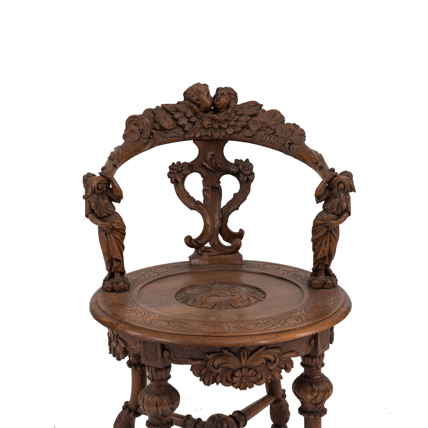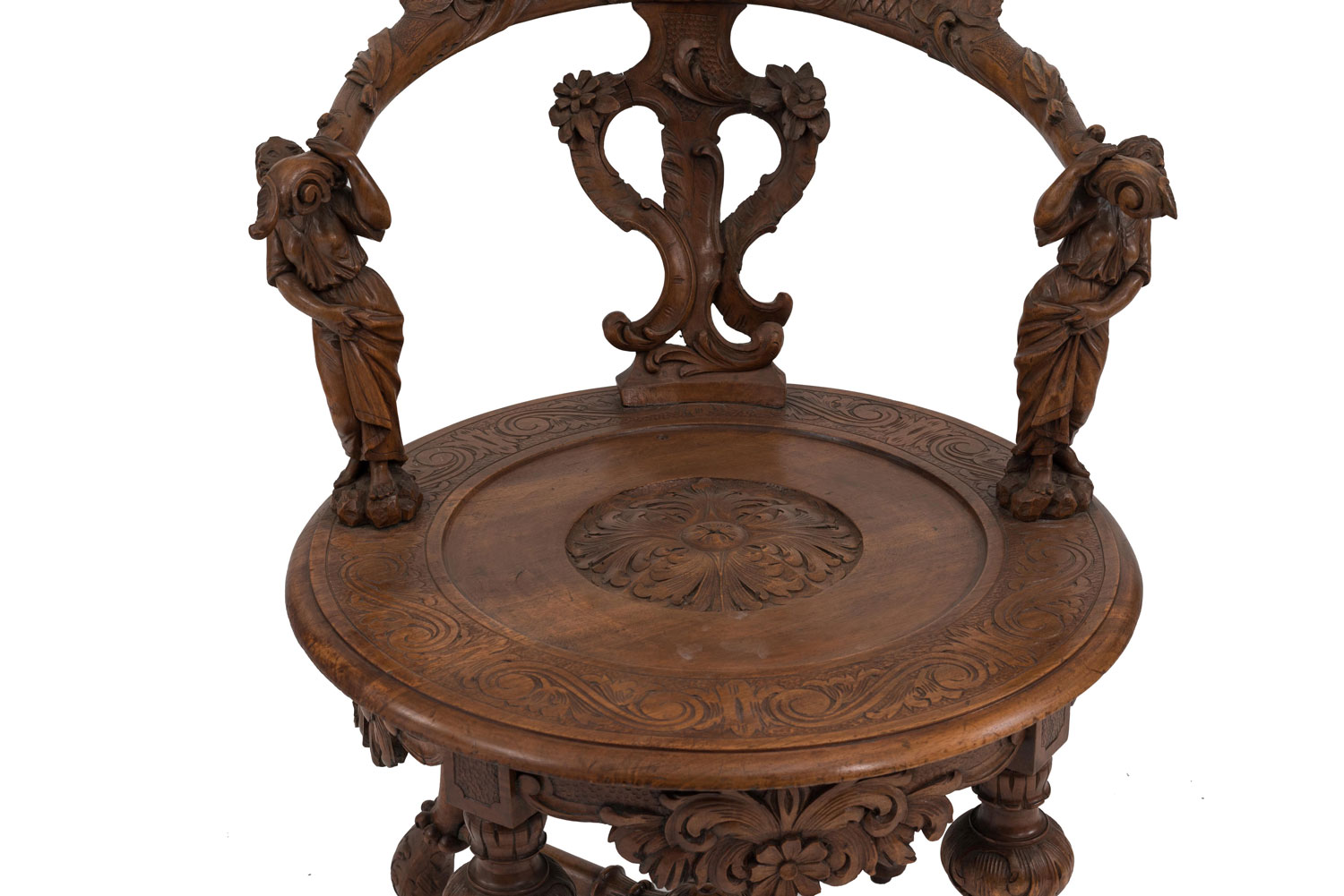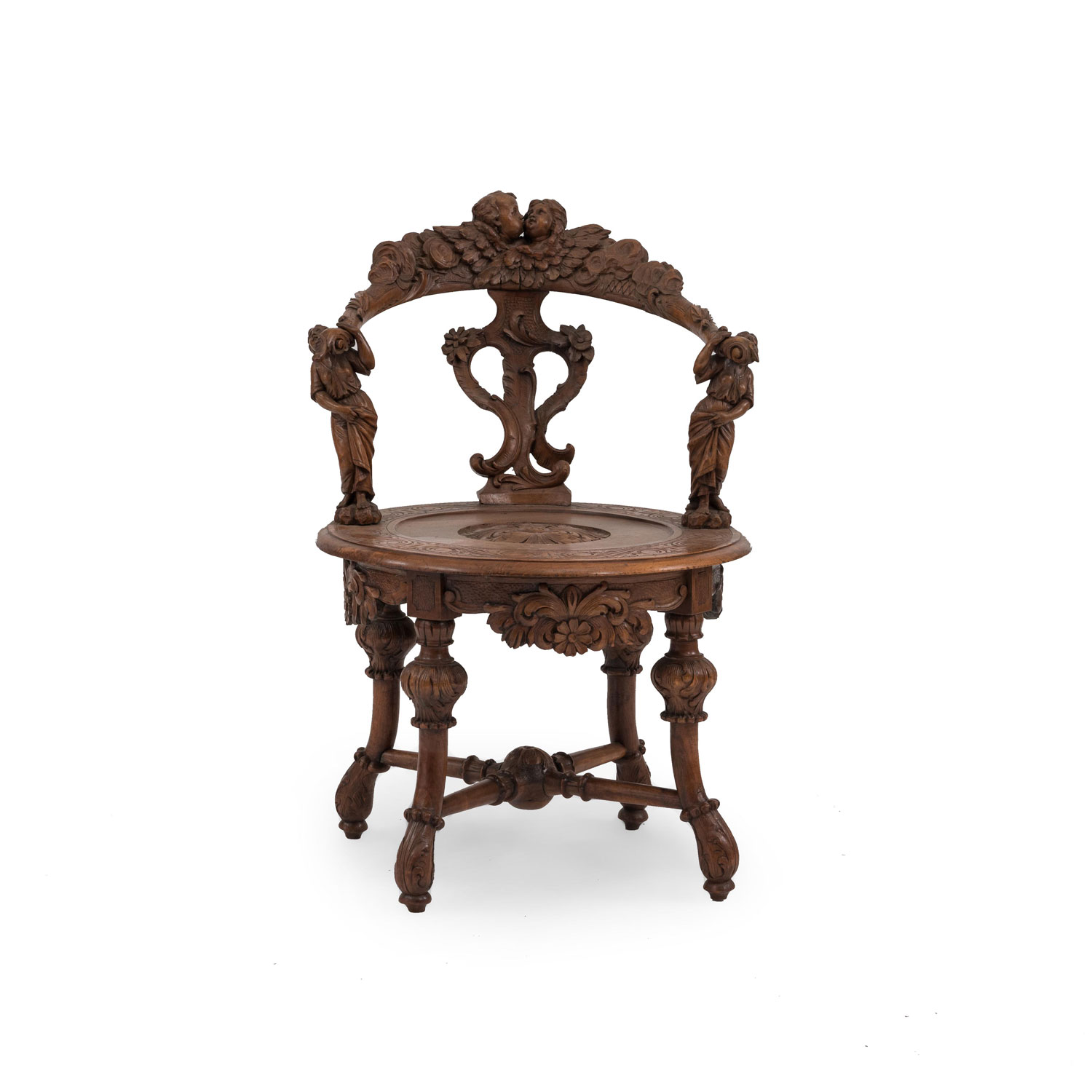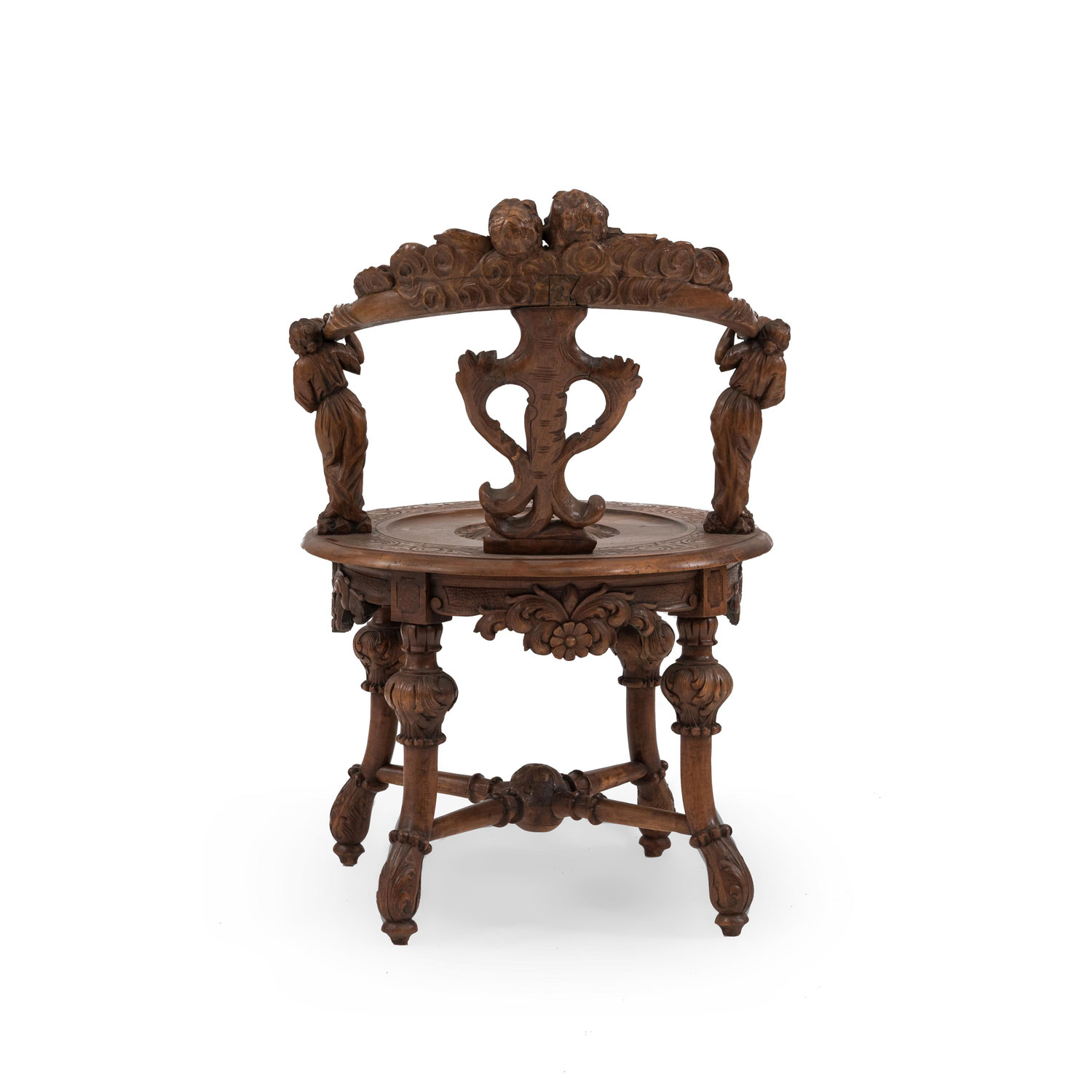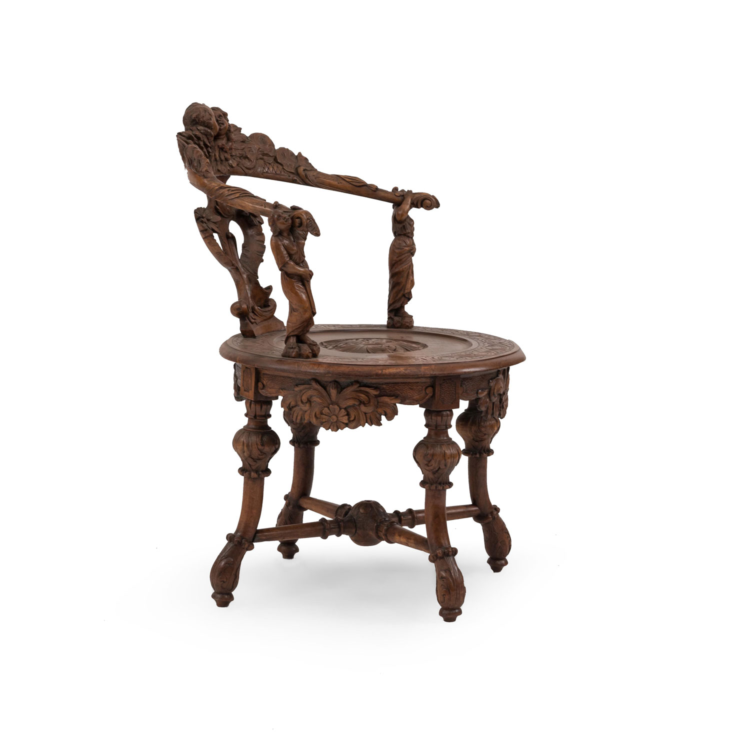 Italian Venetian-style (19th Century) stripped and carved round back armchair with carved figures supporting the arms..