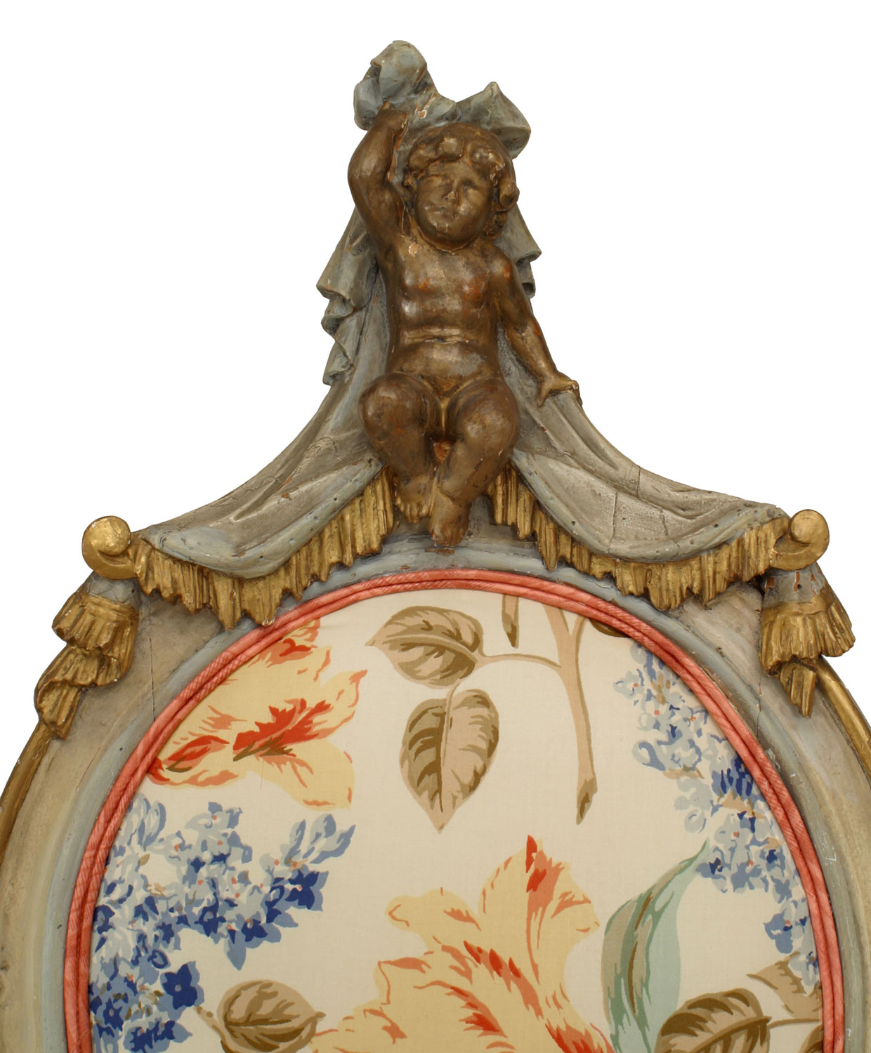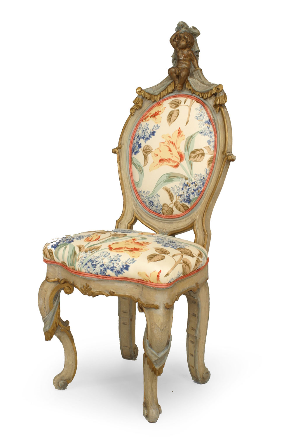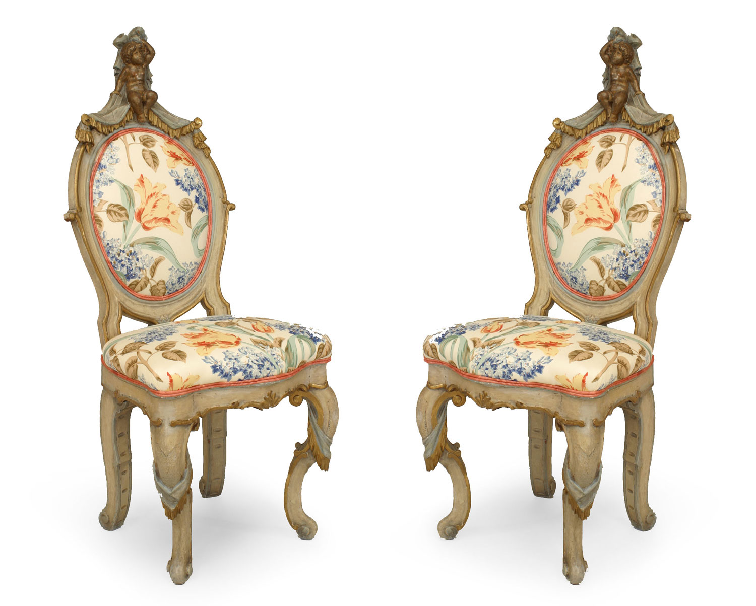 PAIR of Italian Venetian style (19th Cent) white and blue painted and gilt trimmed side chairs with drape and cupid carved back