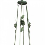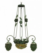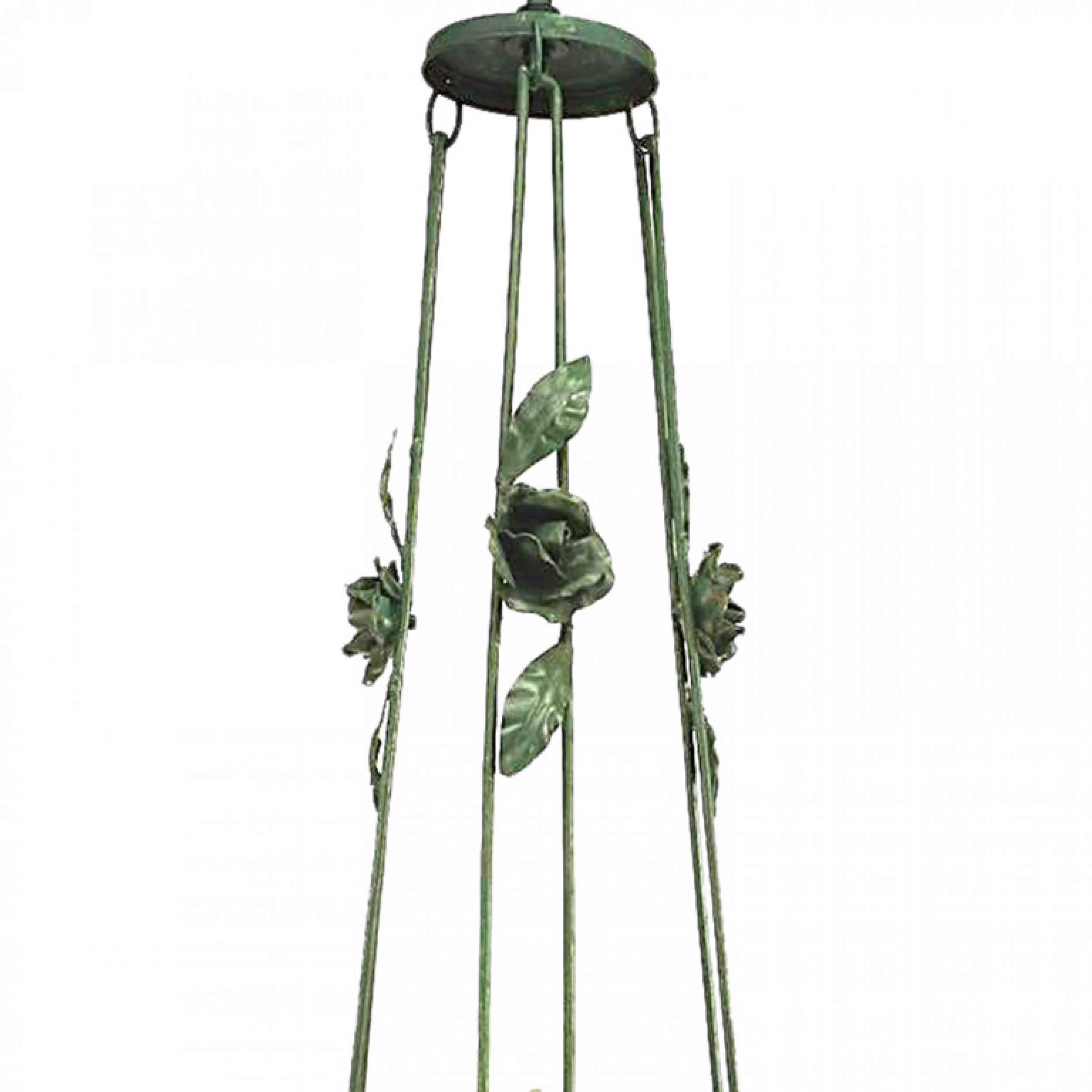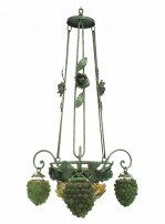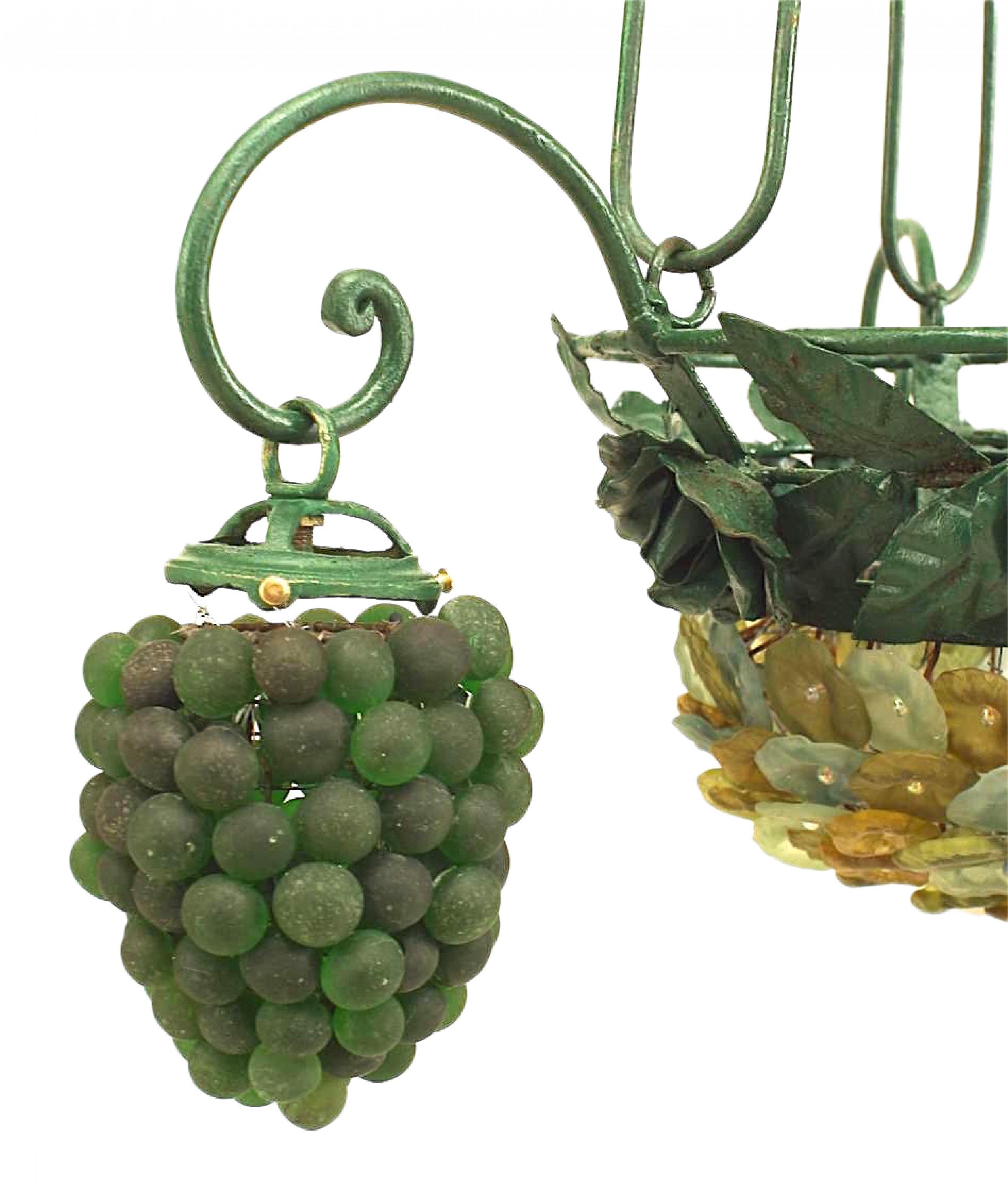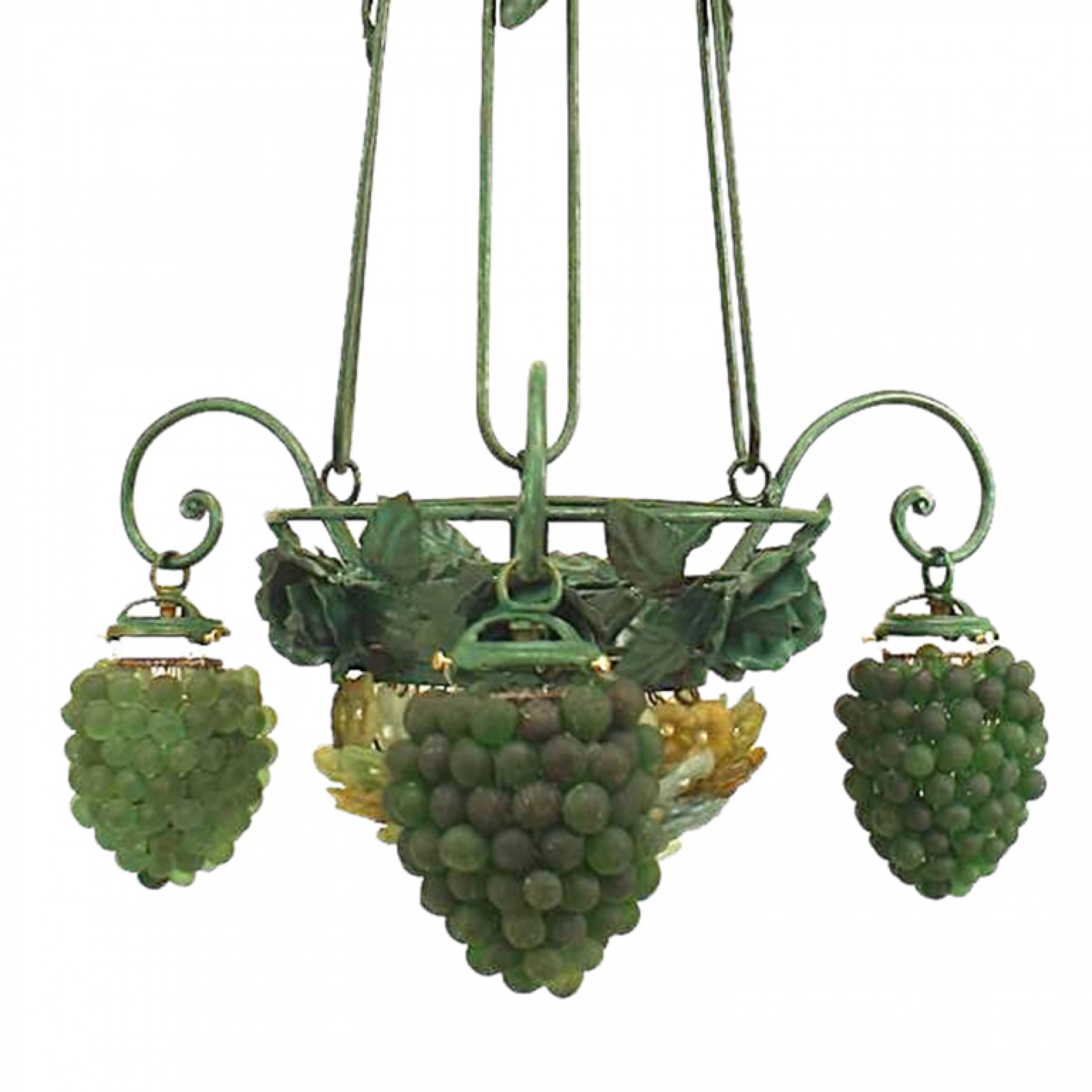 Italian Venetian 3 arm chandelier with green painted metal flowers and leaf design with a bowl base of glass flowers and 3 Murano green glass grape design shades..