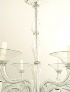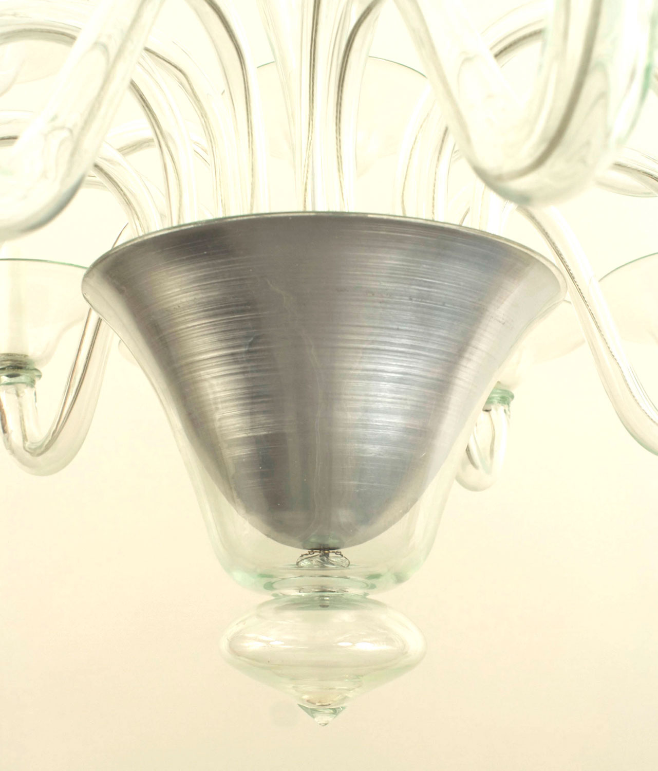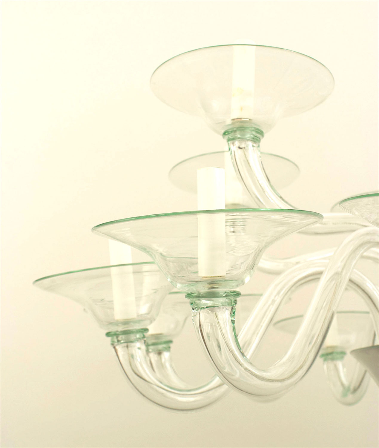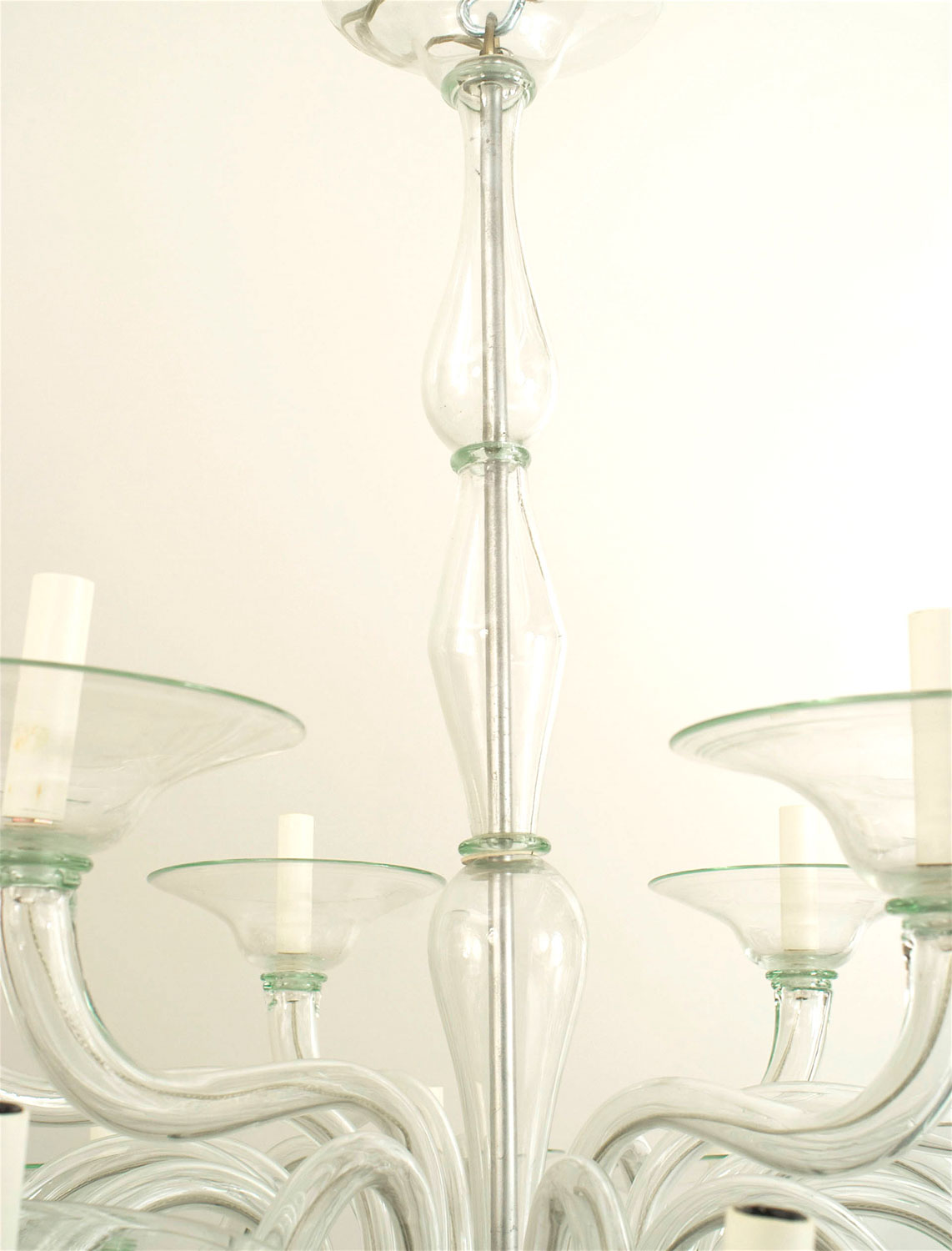 Italian Venetian (1940's) style Murano light green glass chandelier with 2 tiers of 6 and 12 scroll arms emanating from a tiered centerpost with disc form bobeches cups and a finial bottom.