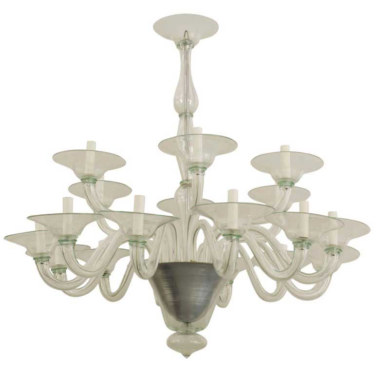 Italian Venetian (1940's) style Murano light green glass chandelier with 2 tiers of 6 and 12 scroll arms emanating from a tiered centerpost with disc form bobeches cups and a finial bottom..