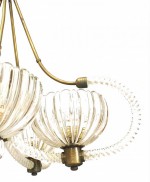 Italian Venetian Murano (1930's) brass and clear glass chandelier with 5 swirl design arms supporting a large fluted and scalloped bowl shaped shade. (att: BAROVIER E TOSO).