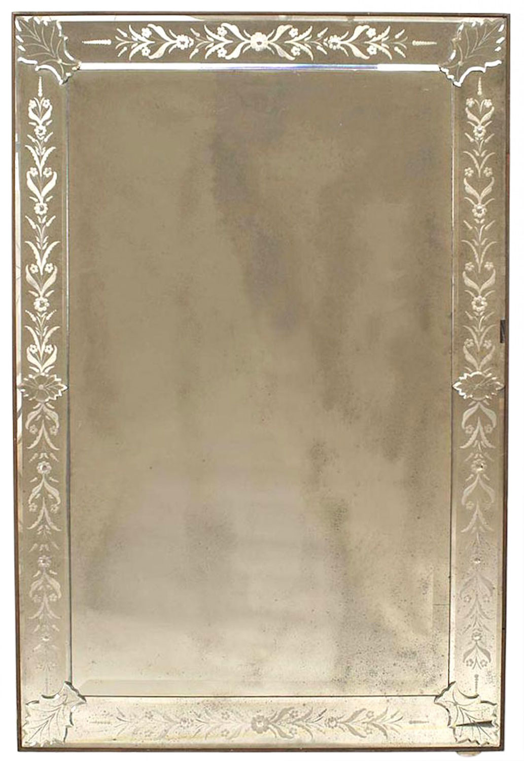 2 Italian Venetian Murano (20th Century) rectangular wall mirrors with beveled and etched floral and scroll design border and beveled central mirror. (ONGARO E FUGA) (PRICED EACH)