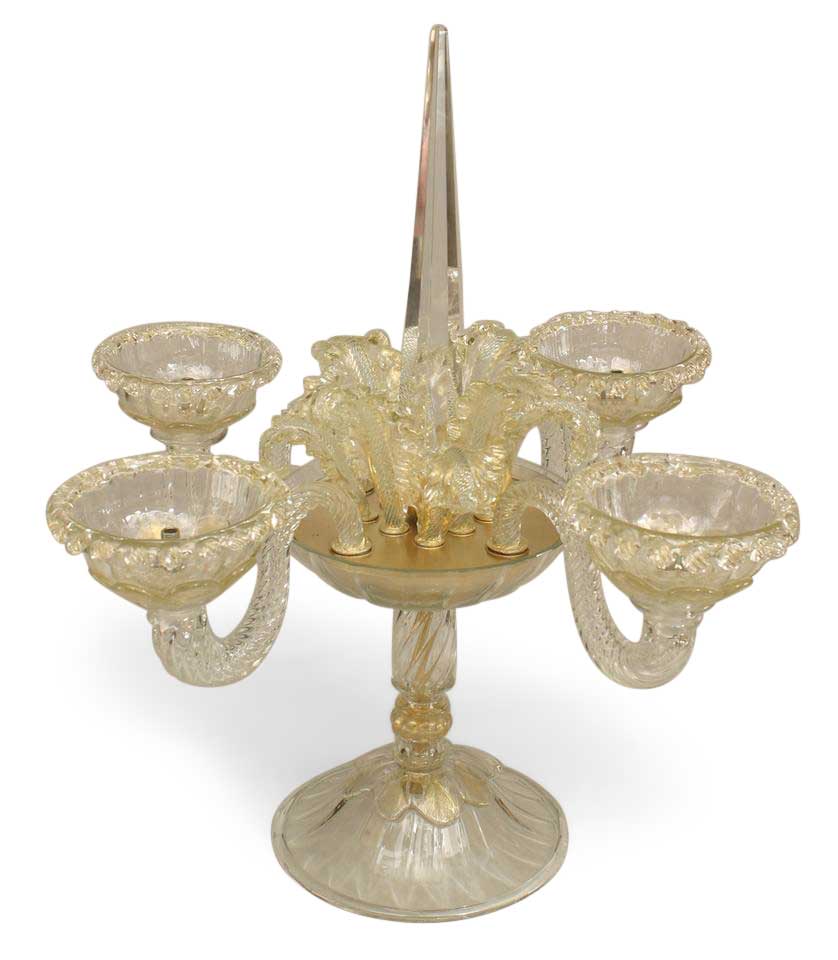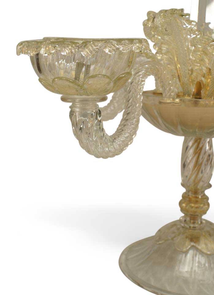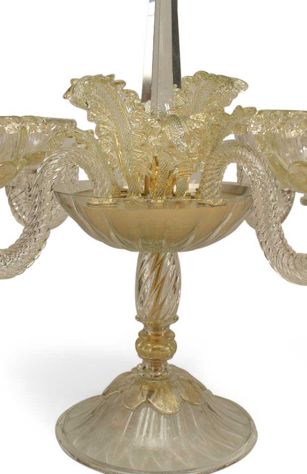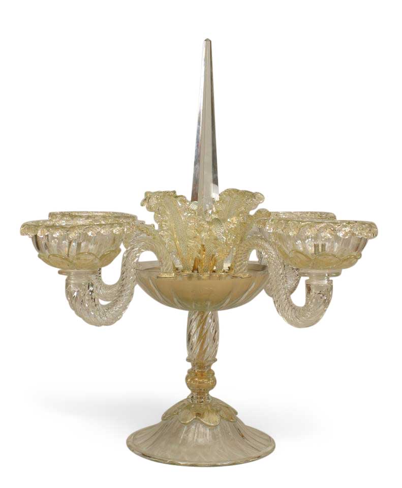 PAIR of Italian Venetian Murano (20th Century) clear and gold dusted glass candelabras with 4 swirl arms and a center obelisk surrounded by glass leaves raised on a pedestal base (after a model designed by ANDRE ARBUS). (PRICED AS PAIR).