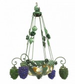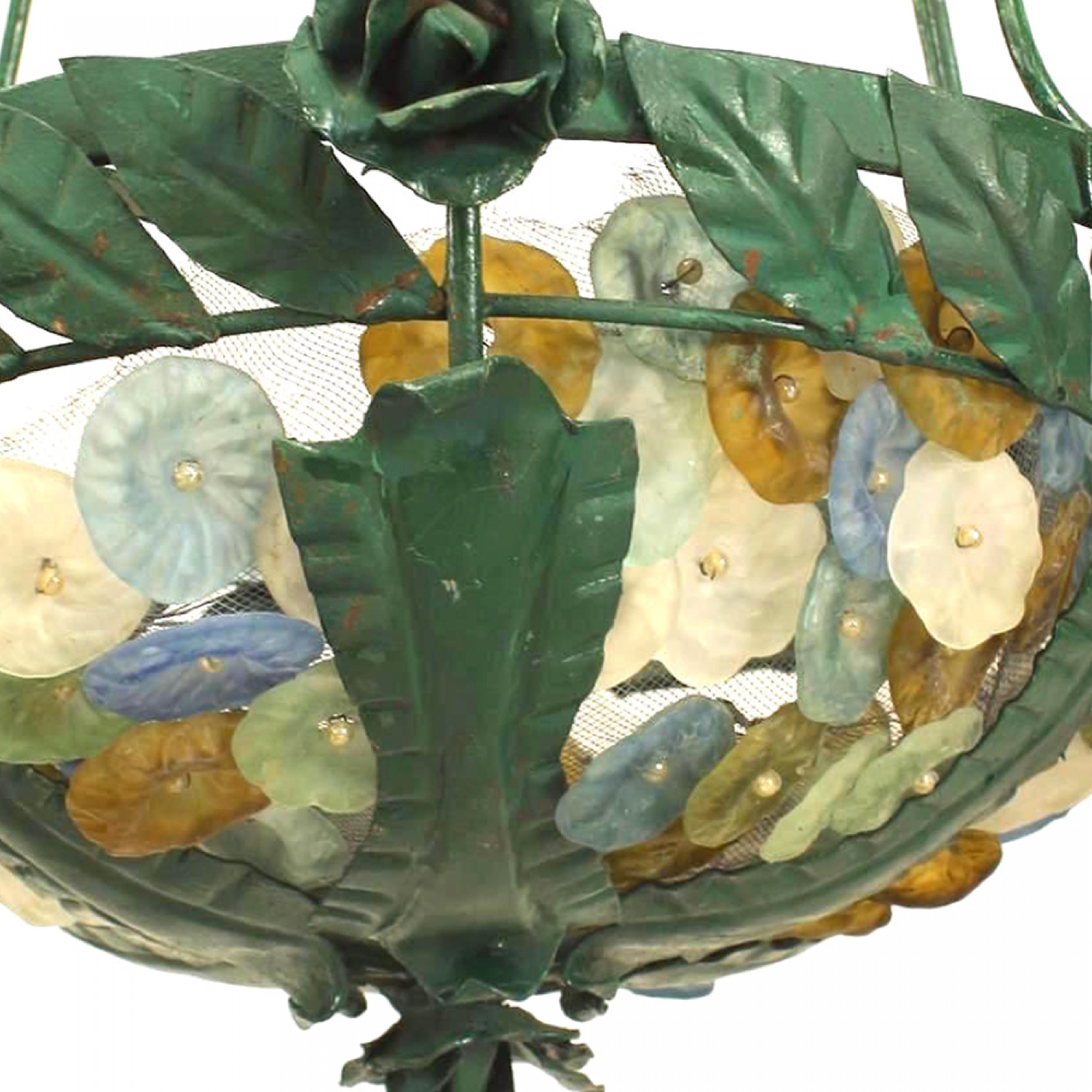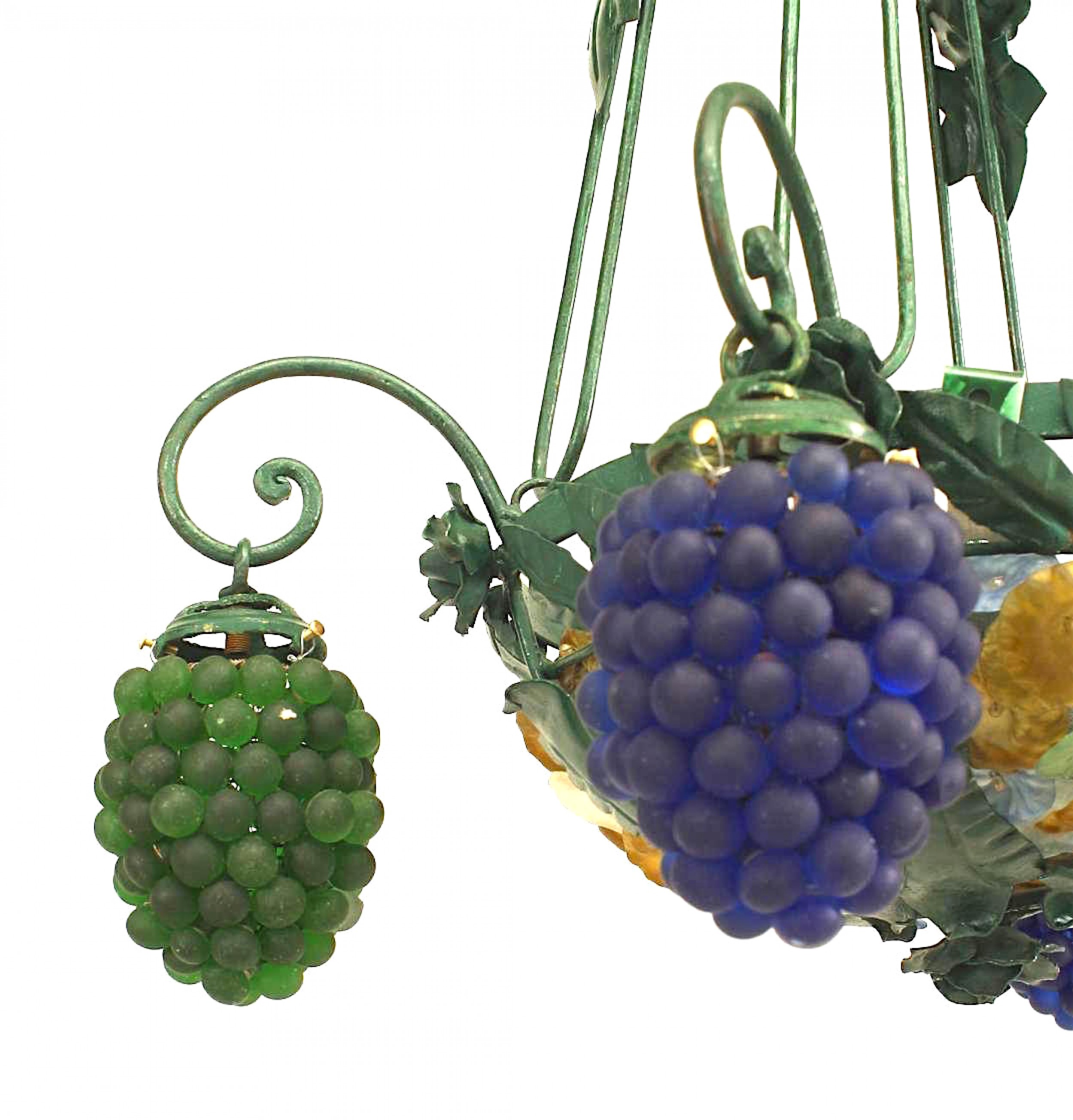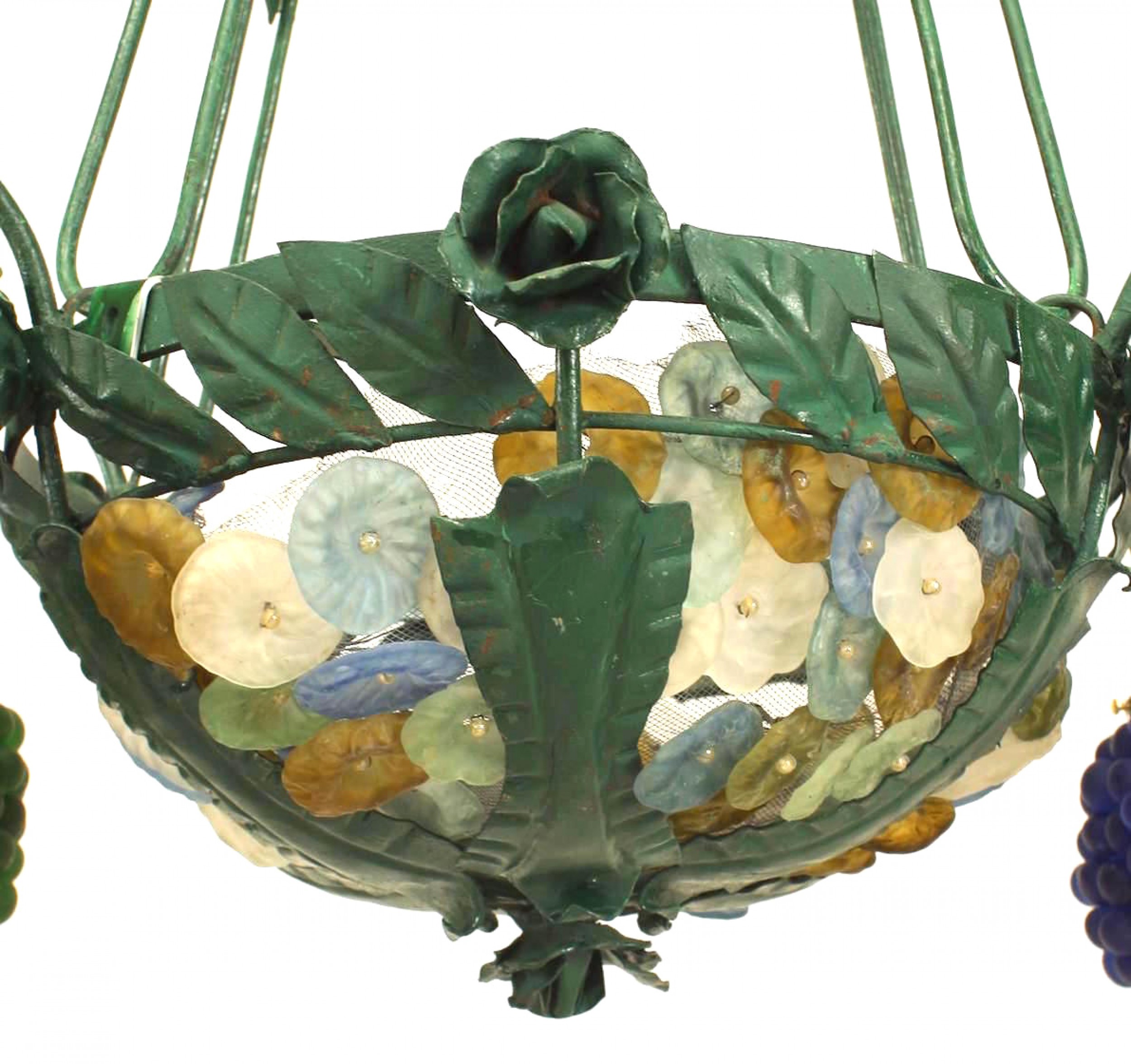 Italian Venetian 4 arm chandelier with green painted metal flowers and leaf design with a bowl base of blue/green flowers and 2 blue & 2 green Murano glass grape design shades..