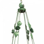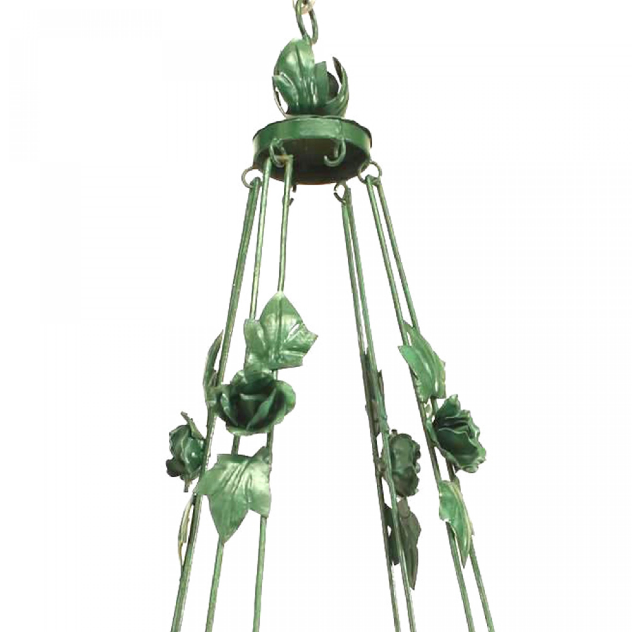 Italian Venetian 4 arm chandelier with green painted metal flowers and leaf design with a bowl base of blue/green flowers and 2 blue & 2 green Murano glass grape design shades.