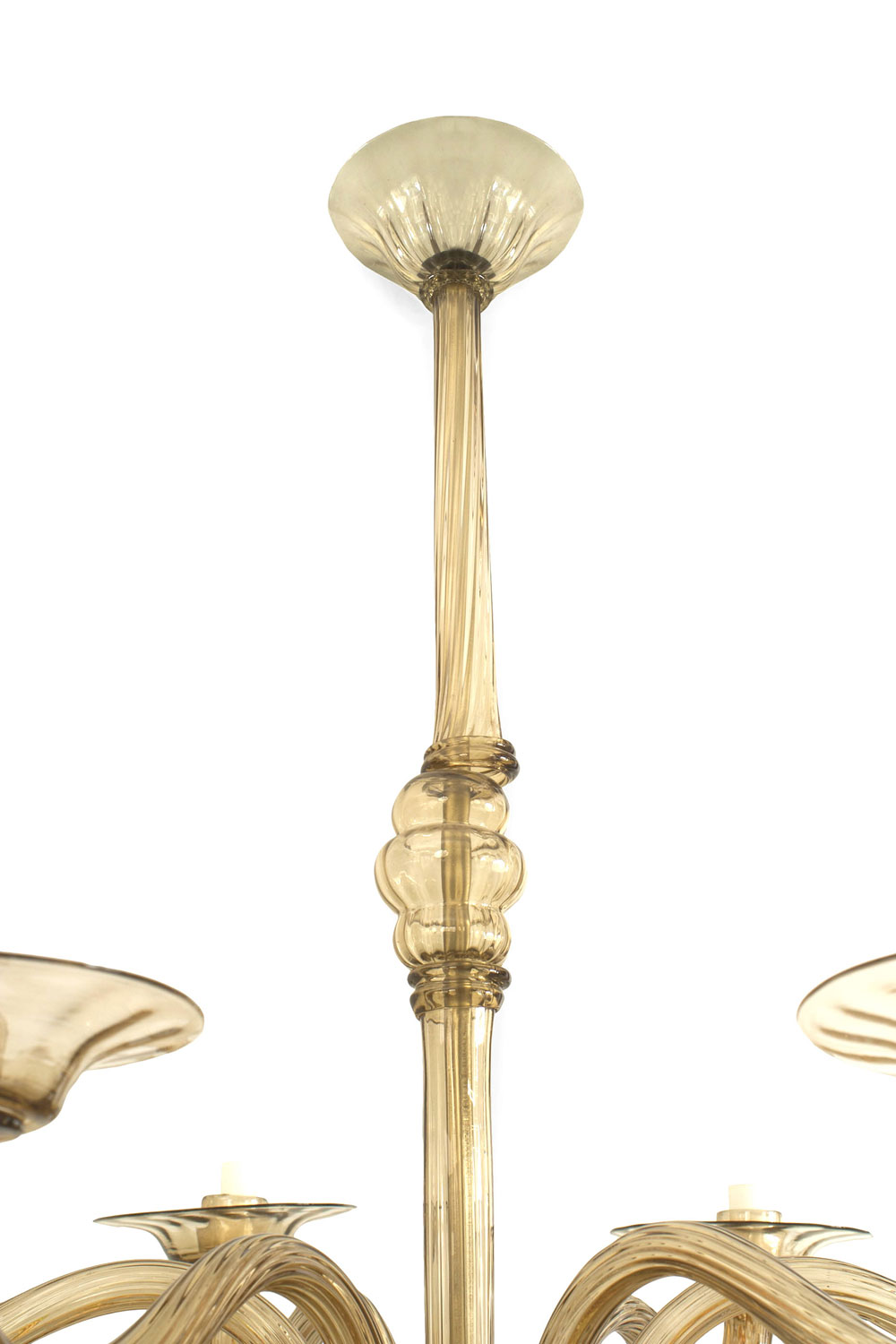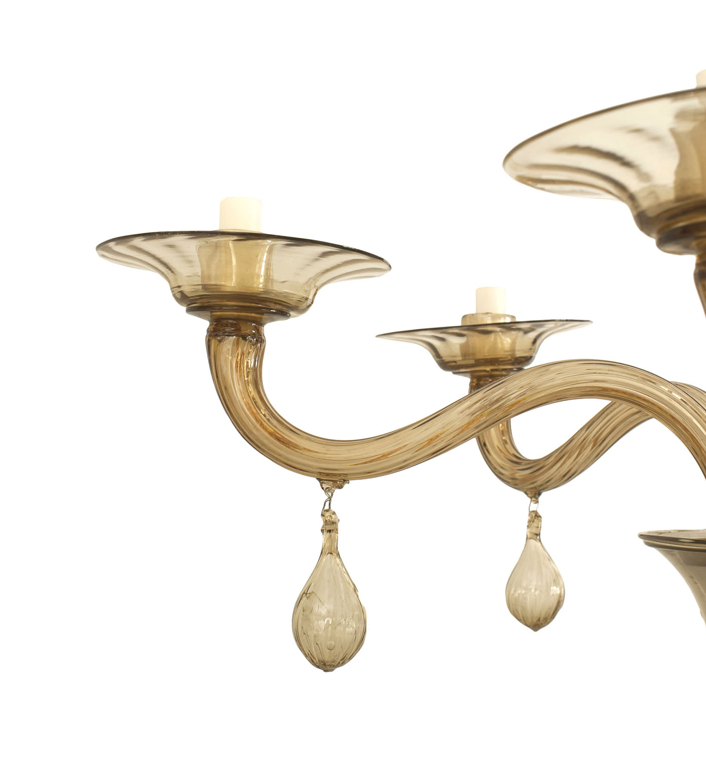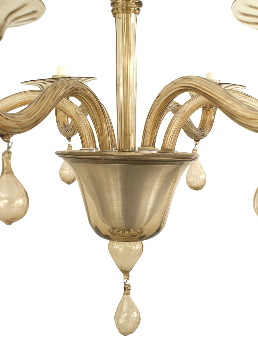 Italian Venetian Murano (1940s) style smoky amber glass chandelier with 6 scroll fluted arms with drops supporting round disc shades emanating from a tiered centerpost & finial bottom.