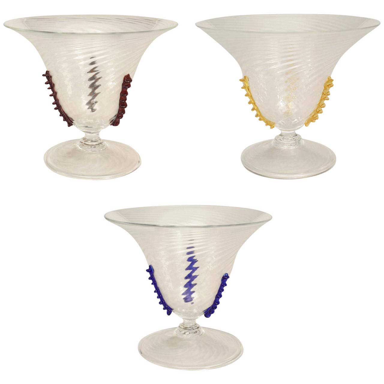 3 Italian Venetian Murano (circa 1920) RIGADIN RITORTO swirl design clear glass compote with 3 applied colored ribbed glass trim (PRICED EACH).