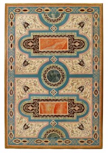 Italian Venetian-style rectangular coffee table with a pair of 18th Century decoratively painted panels inset in a modern off-white and gilt trimmed base with tapered square legs.
