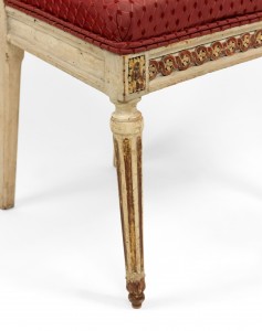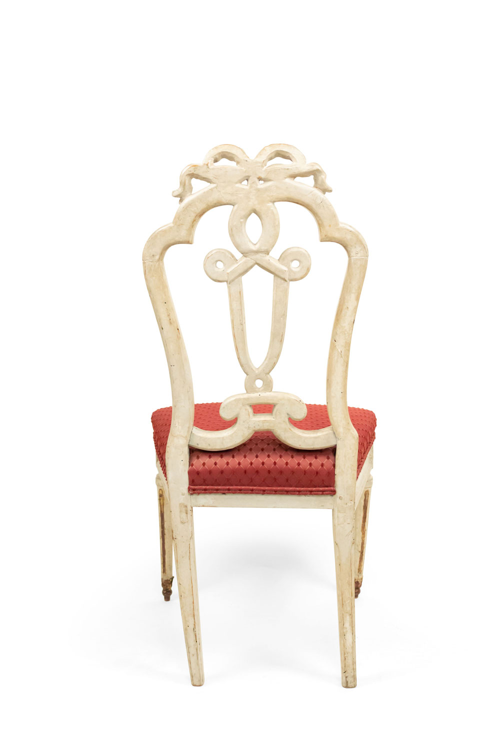 SET of 10 Italian Venetian (18th Century) painted and gilt trimmed side chairs with open carved backs and red upholstered seats supported by fluted legs. (PRICED AS SET).