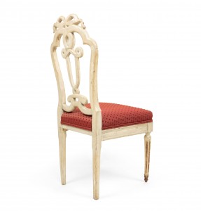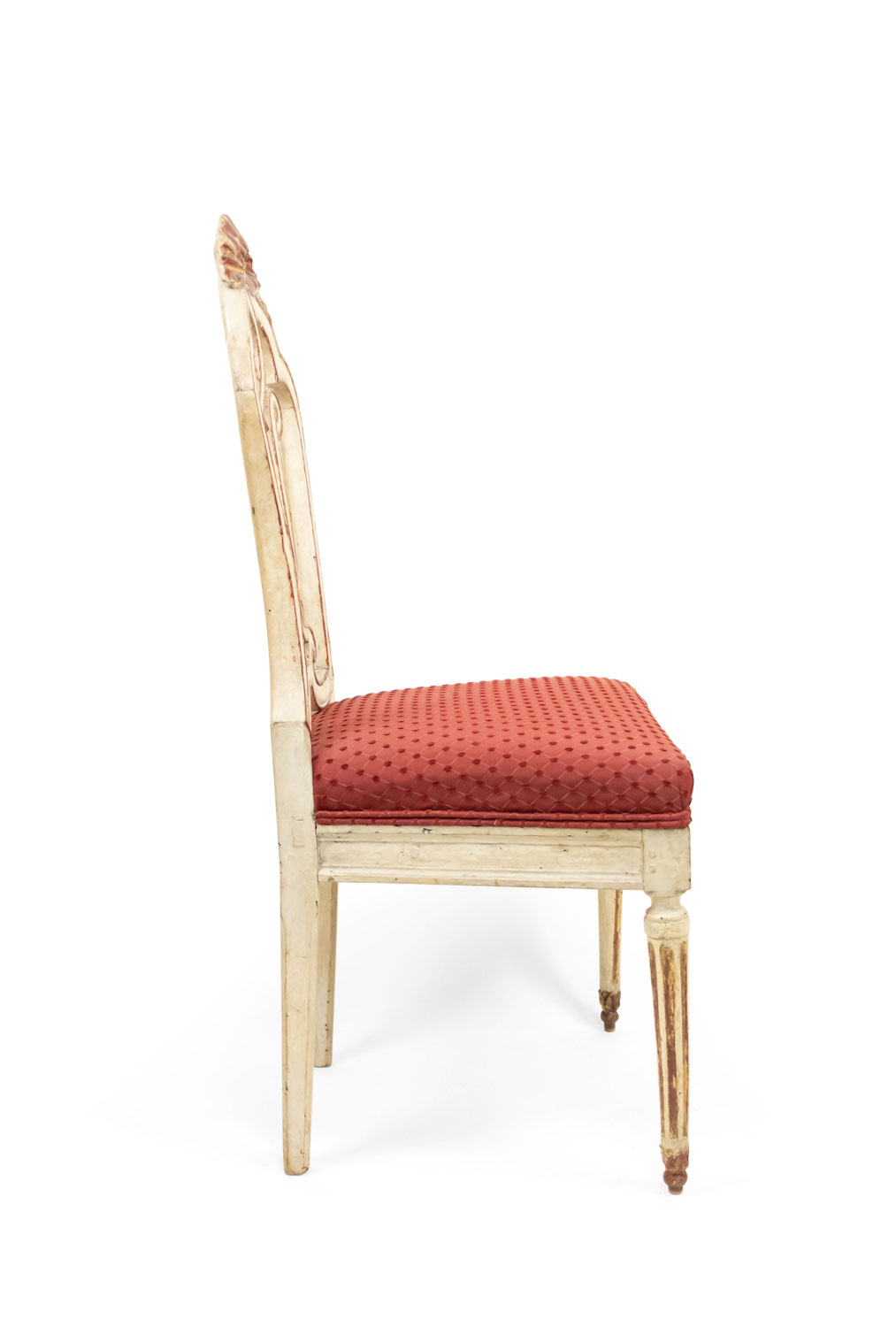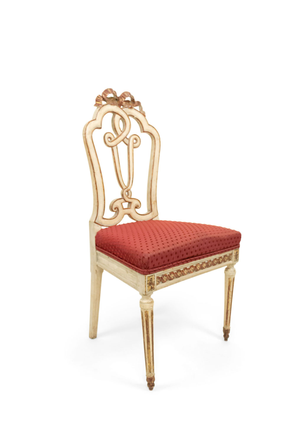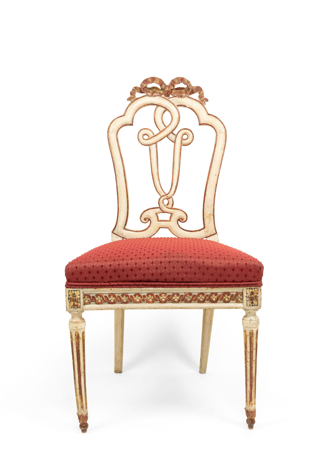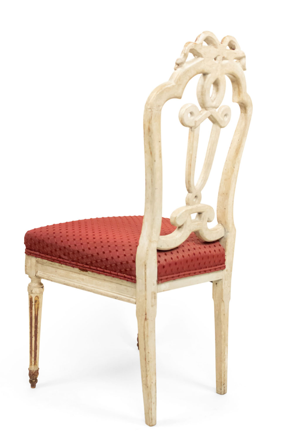 SET of 10 Italian Venetian (18th Century) painted and gilt trimmed side chairs with open carved backs and red upholstered seats supported by fluted legs. (PRICED AS SET)