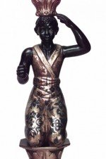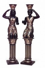 PAIR of Italian Venetian (19th Cent) polychromed and gilt kneeling Blackamoor pedestals with fluted column base.