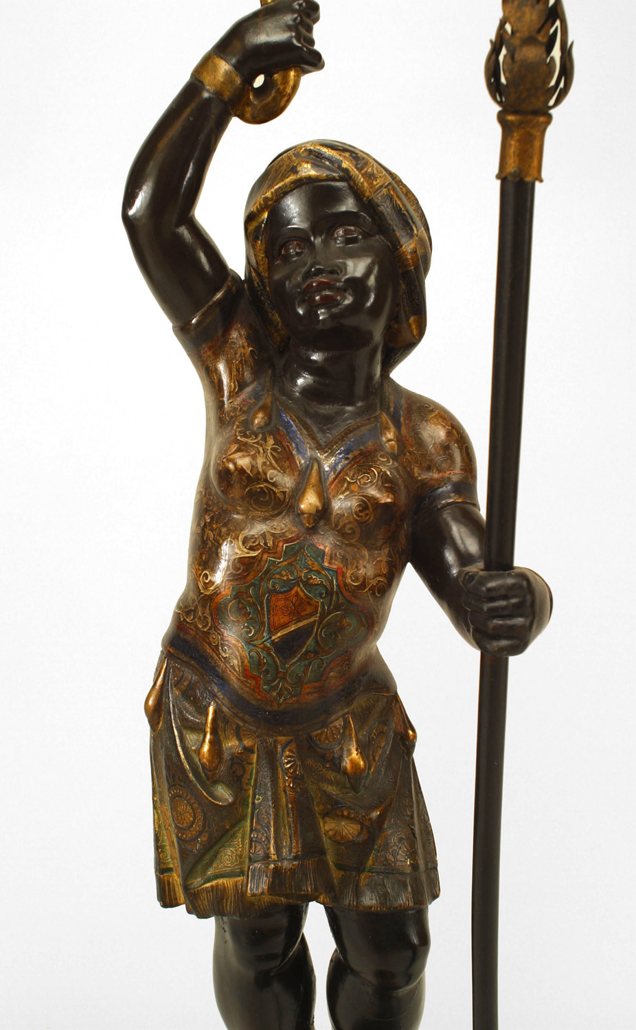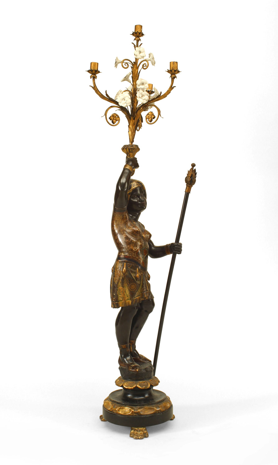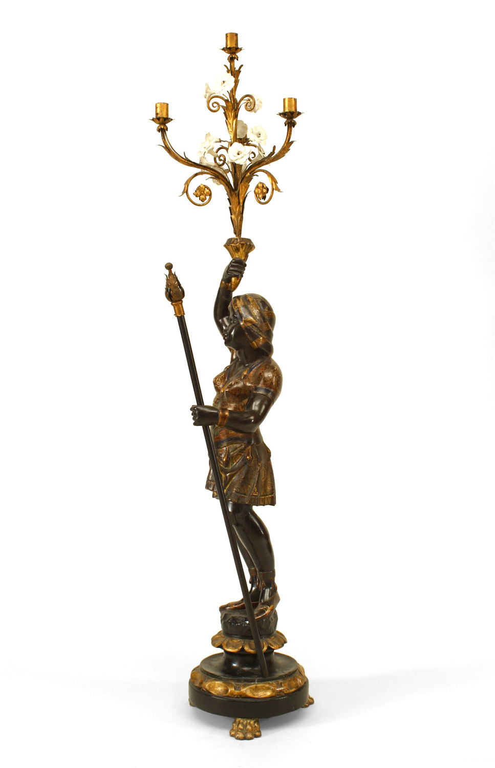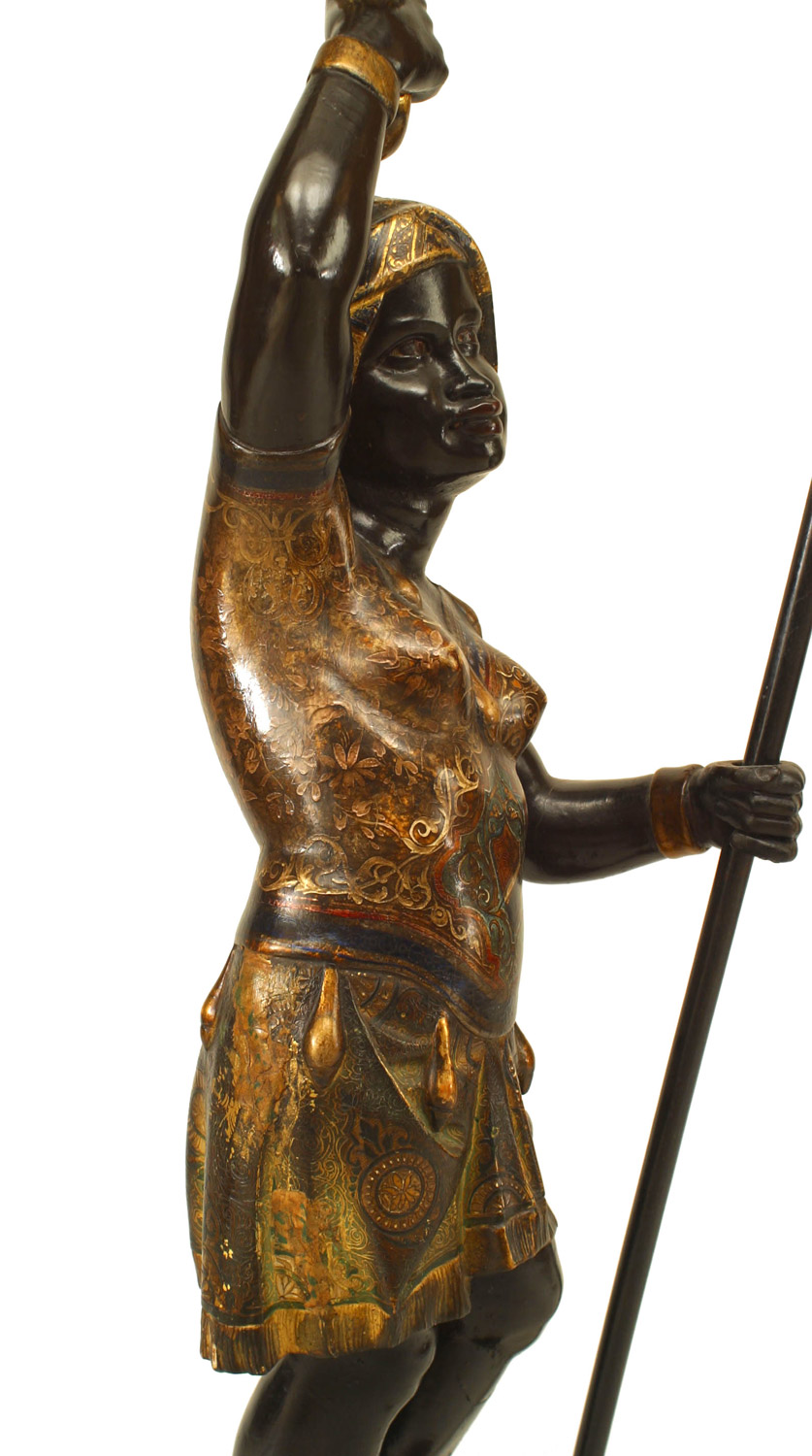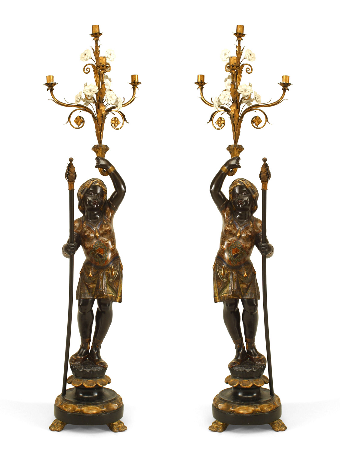 PAIR of Italian Venetian (19th Cent) polychromed large blackamoor figures holding gilt and floral porcelain candelabra