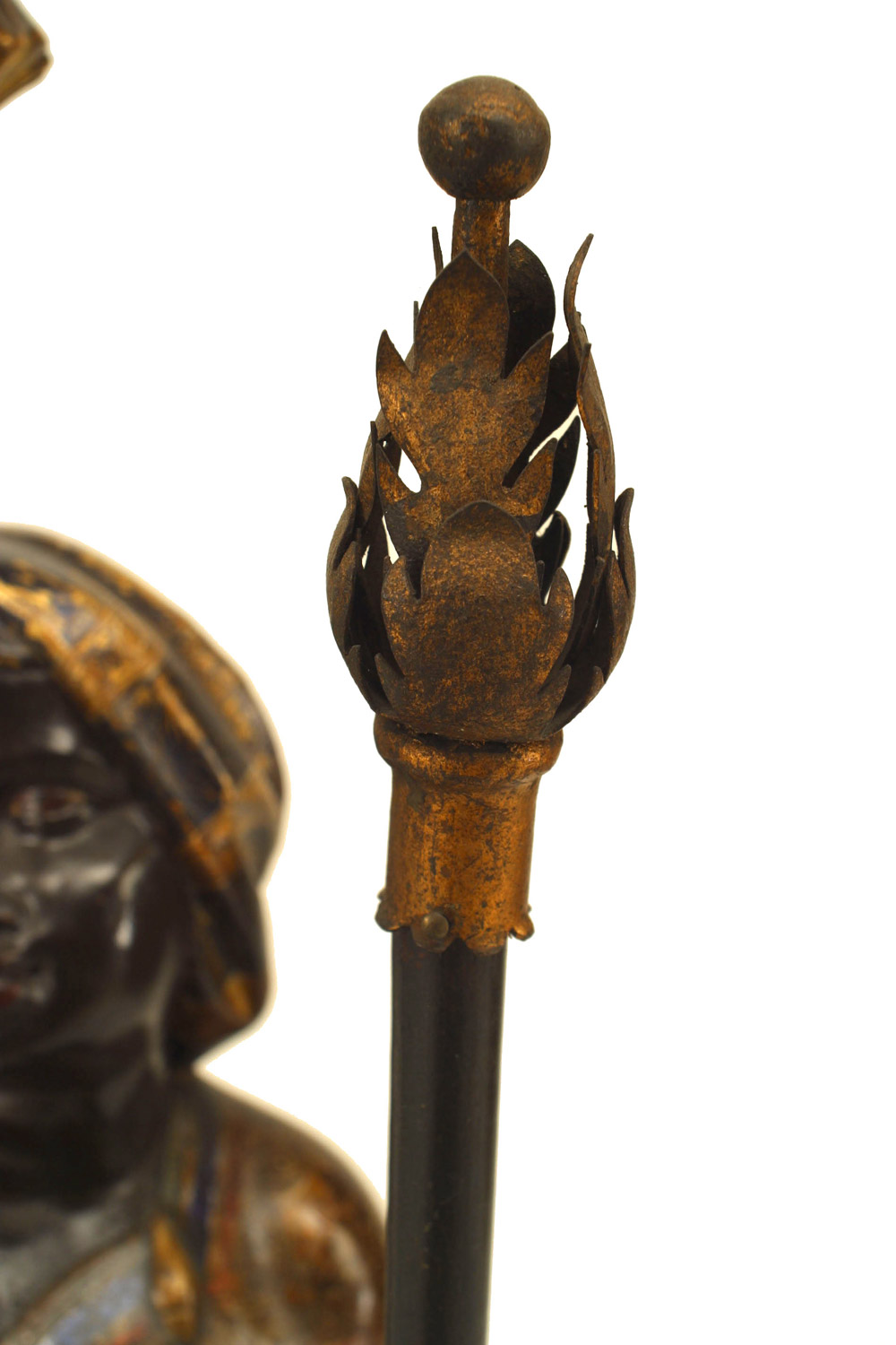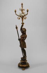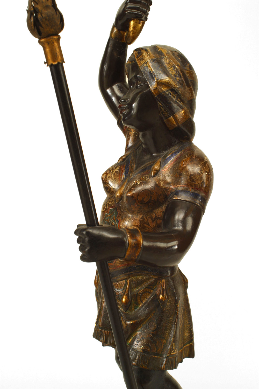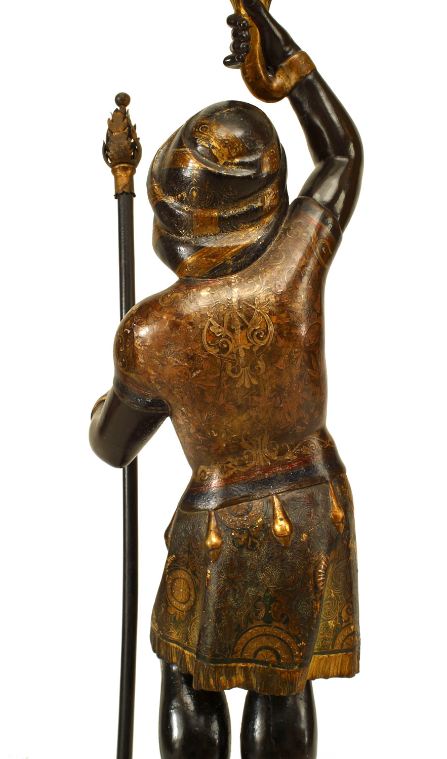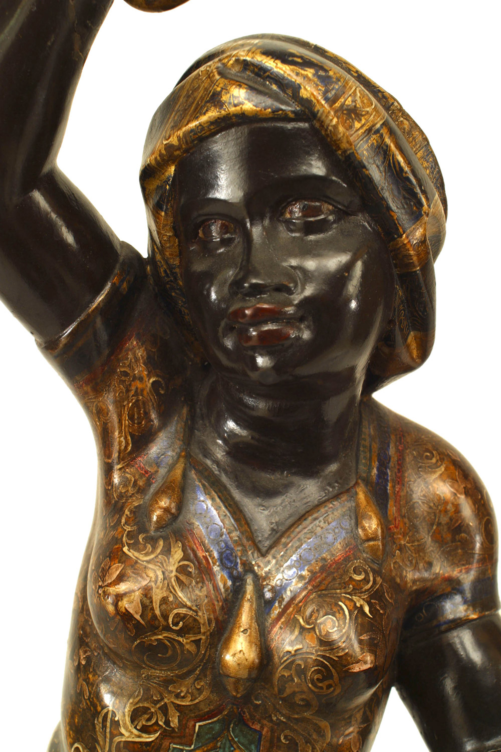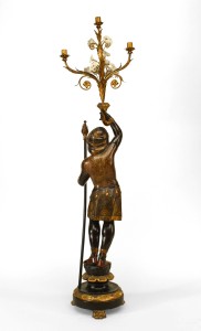 PAIR of Italian Venetian (19th Cent) polychromed large blackamoor figures holding gilt and floral porcelain candelabra