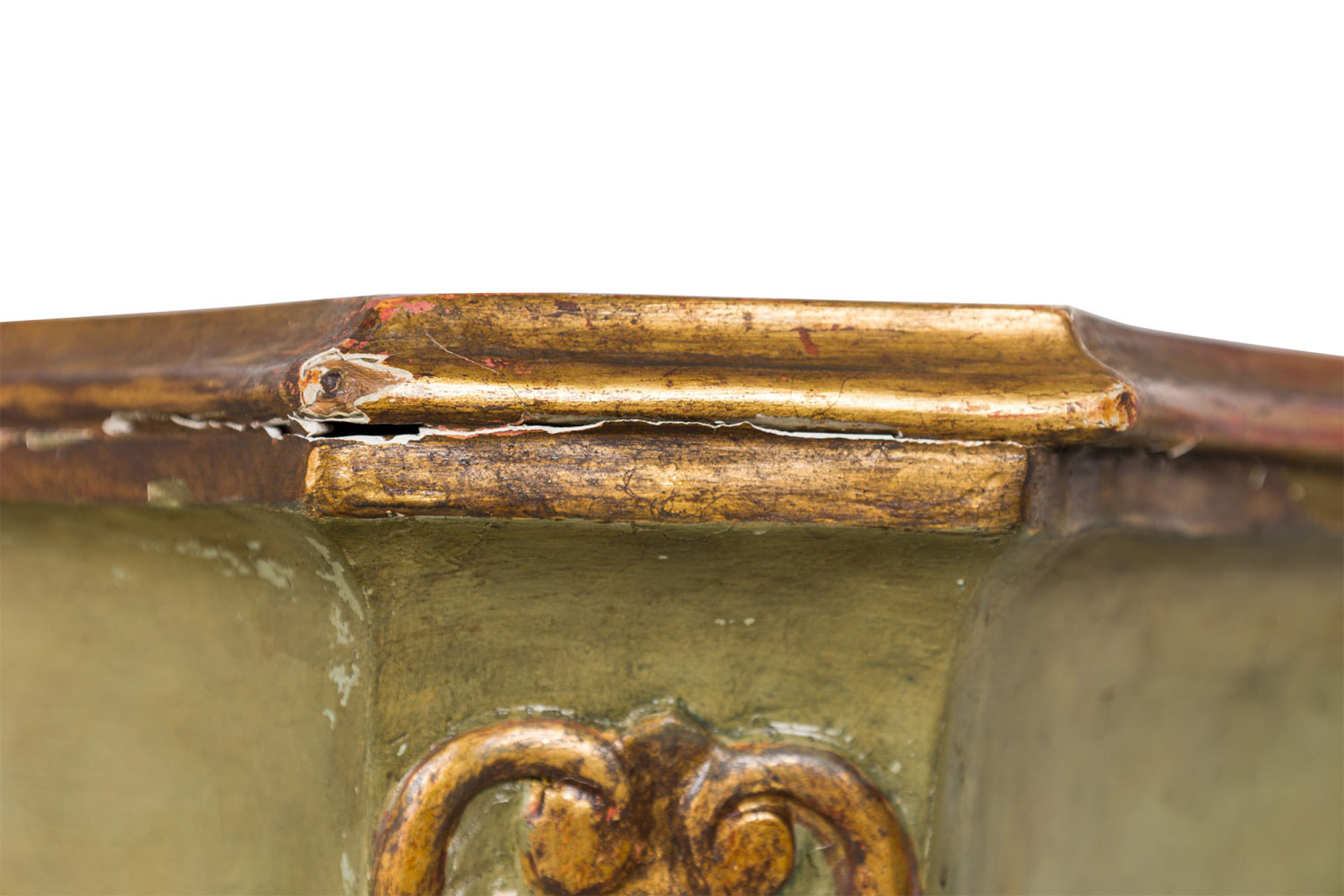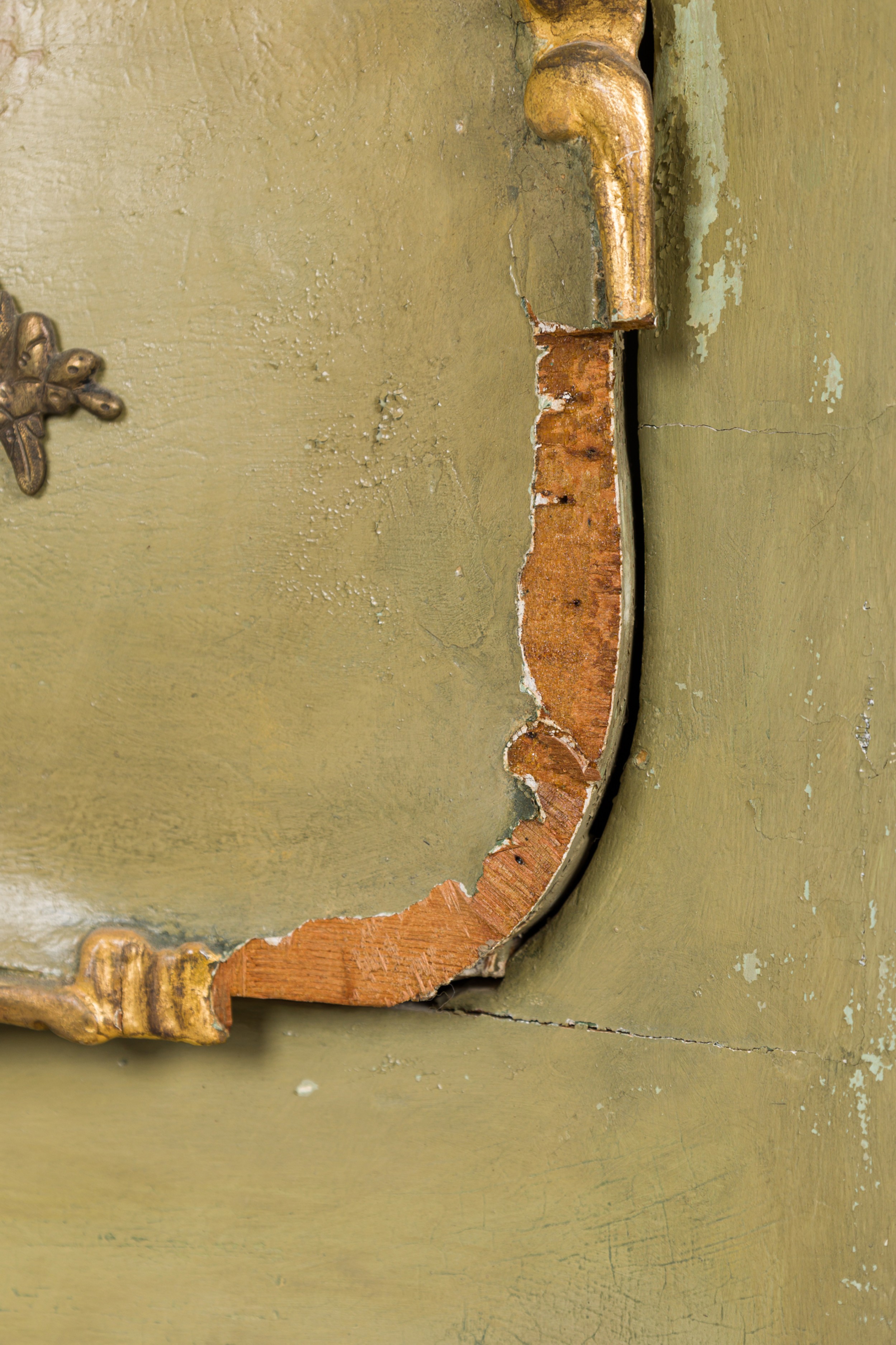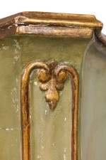 Style: Italian Materials & Techniques: Gilt / giltwood, painted, wood Category: Bedroom Condition: Significant wear to finish, paint losses throughout. Missing marble top. Good; Minor losses