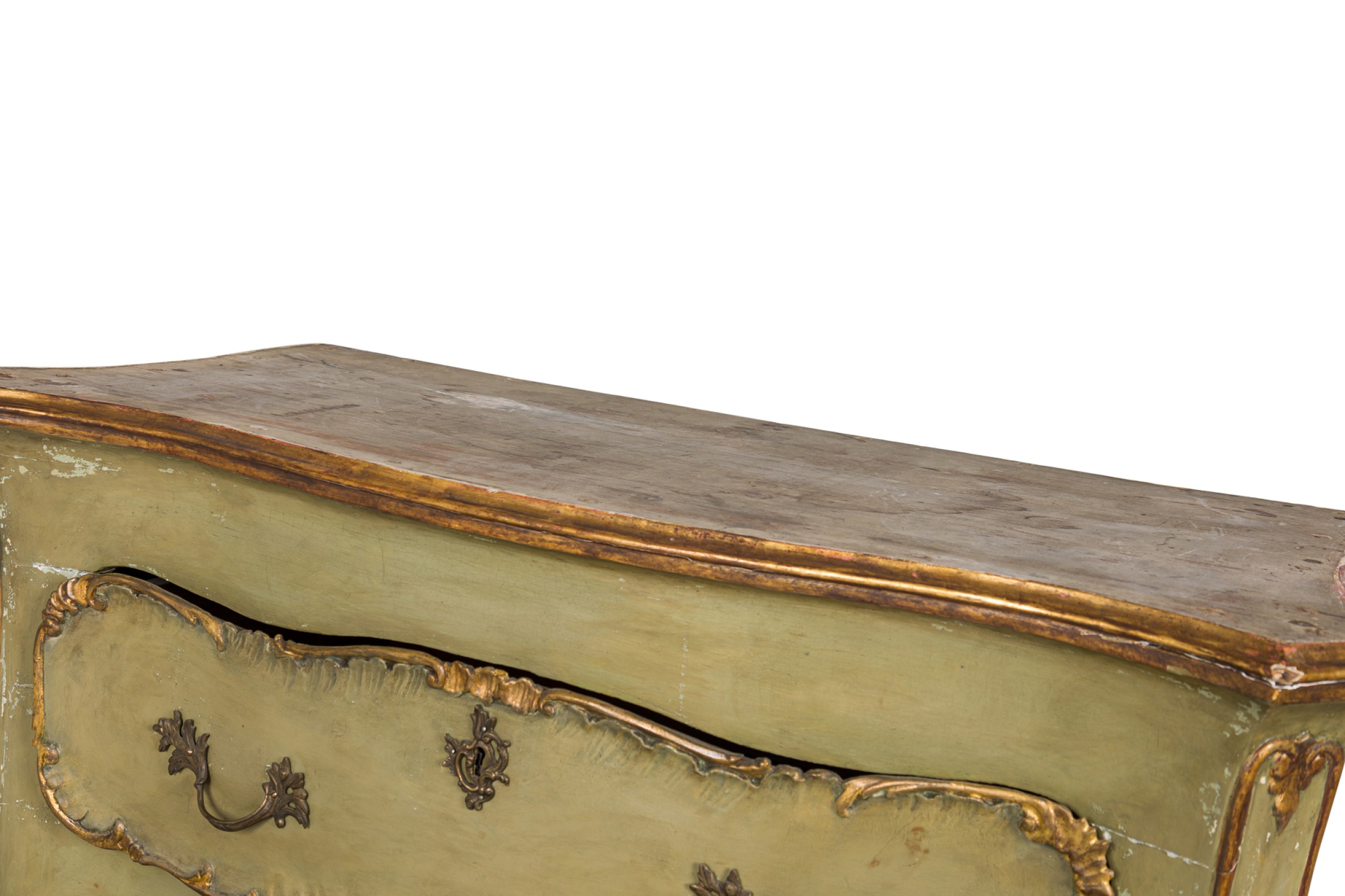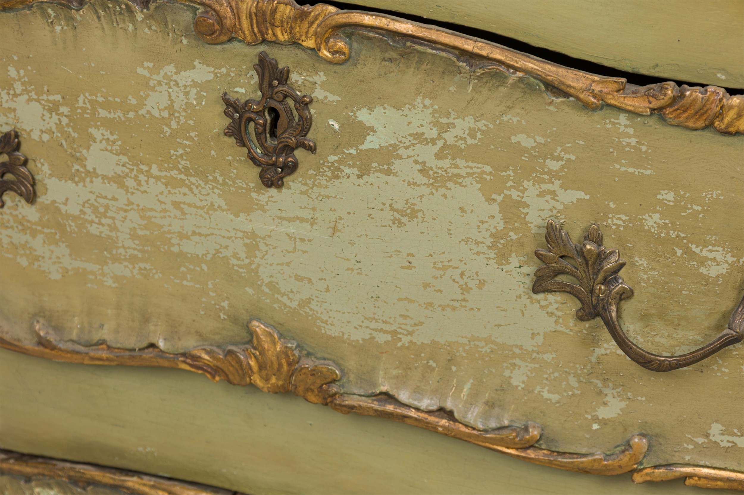Italian Venetian Rococo-style (18th Century) serpentine semainier / dresser having 5 drawers with carved gilt trim and bronze drawer pulls, parcel-gilt and painted in a light green, resting on four carved feet..
