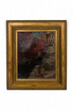Italian Venetian (19/20th Cent) gilt framed oil seascape painting of canal with red sailboat.