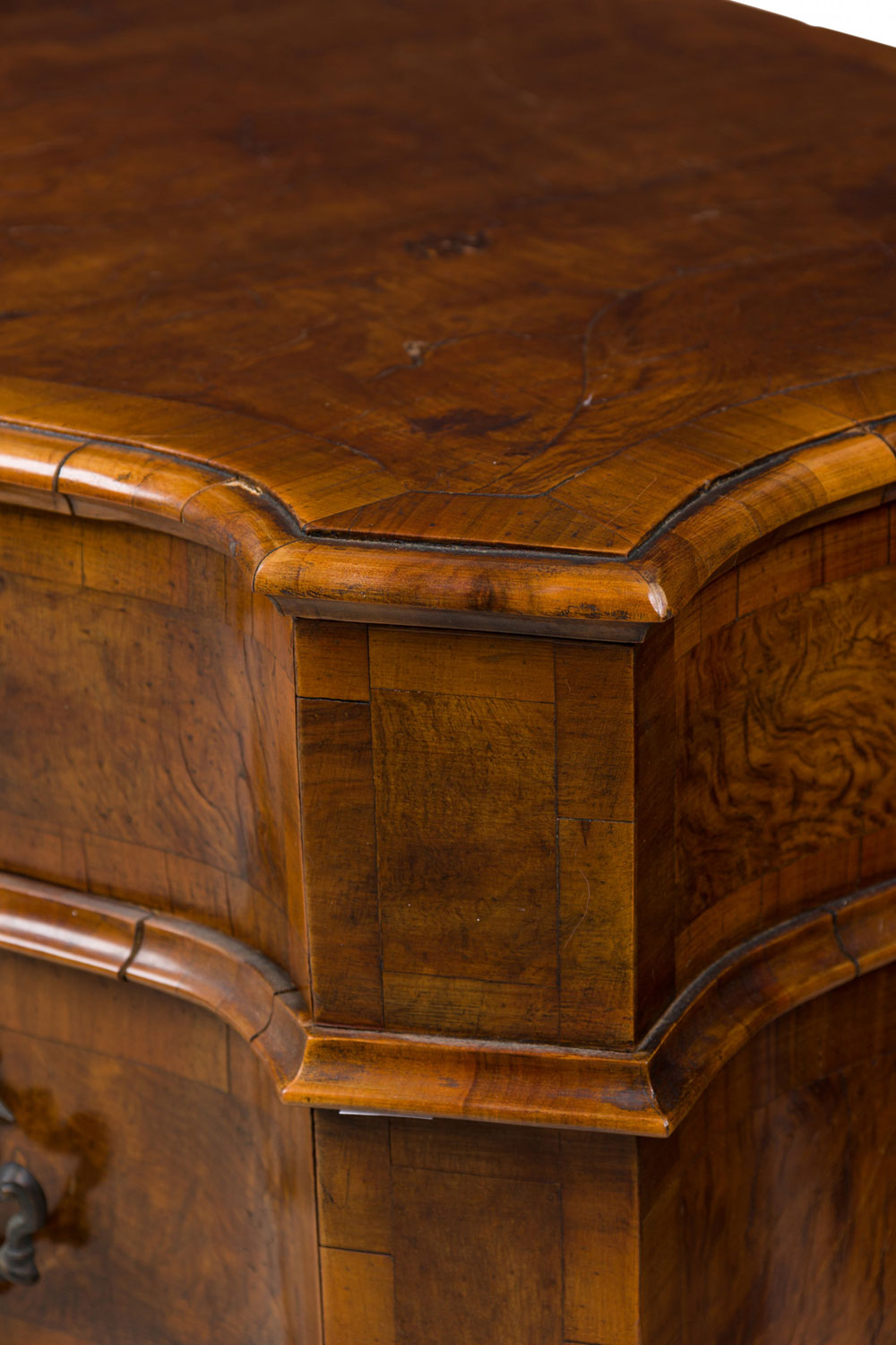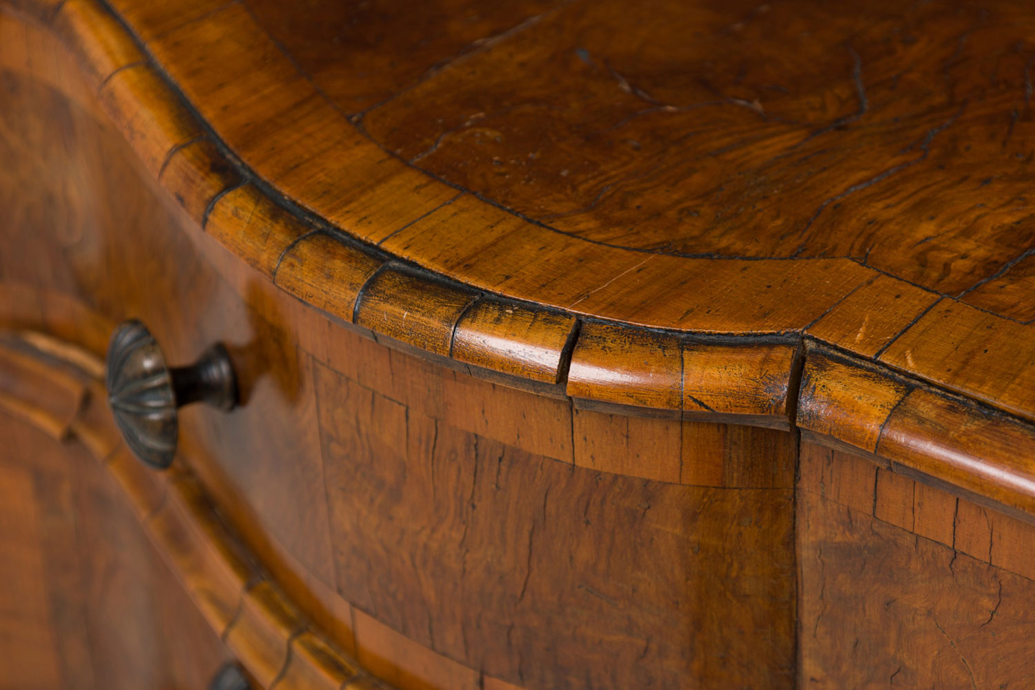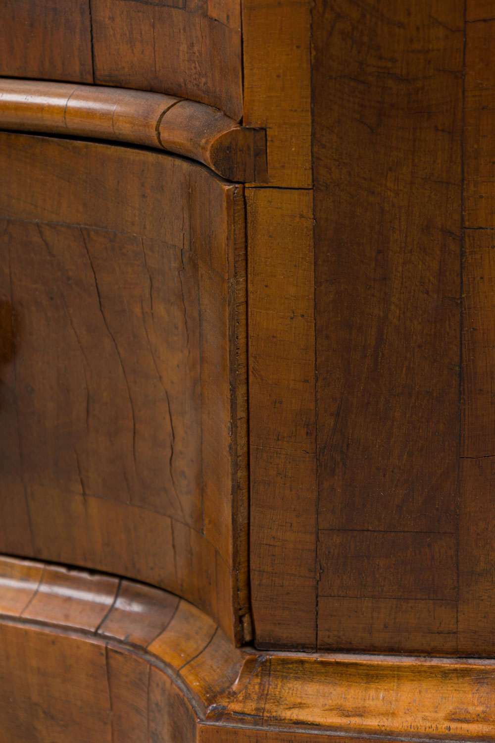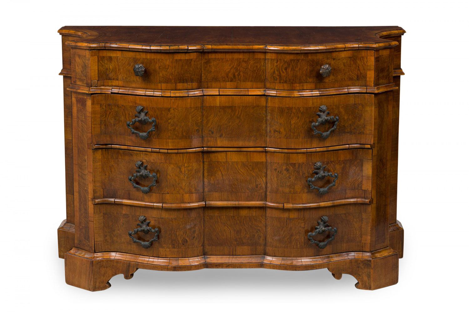 Italian Venetian (18th Century) olive wood chest with a serpentine front and shaped top, containing four drawers with patinated bronze ornater handles on the bottom 3 drawers and 2 knob pulls on the top drawer