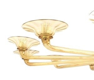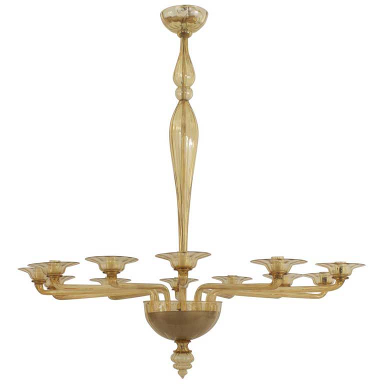 Italian Venetian-Style Murano (1940s) oval shaped amber glass chandelier with 12 arms emanating from a tall center shaft holding fluted round disc bobesches & a tiered finial bottom.