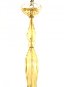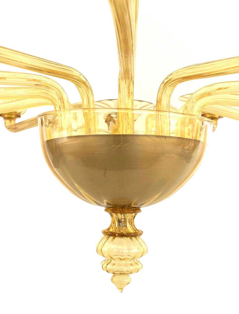 Italian Venetian-Style Murano (1940s) oval shaped amber glass chandelier with 12 arms emanating from a tall center shaft holding fluted round disc bobesches & a tiered finial bottom..