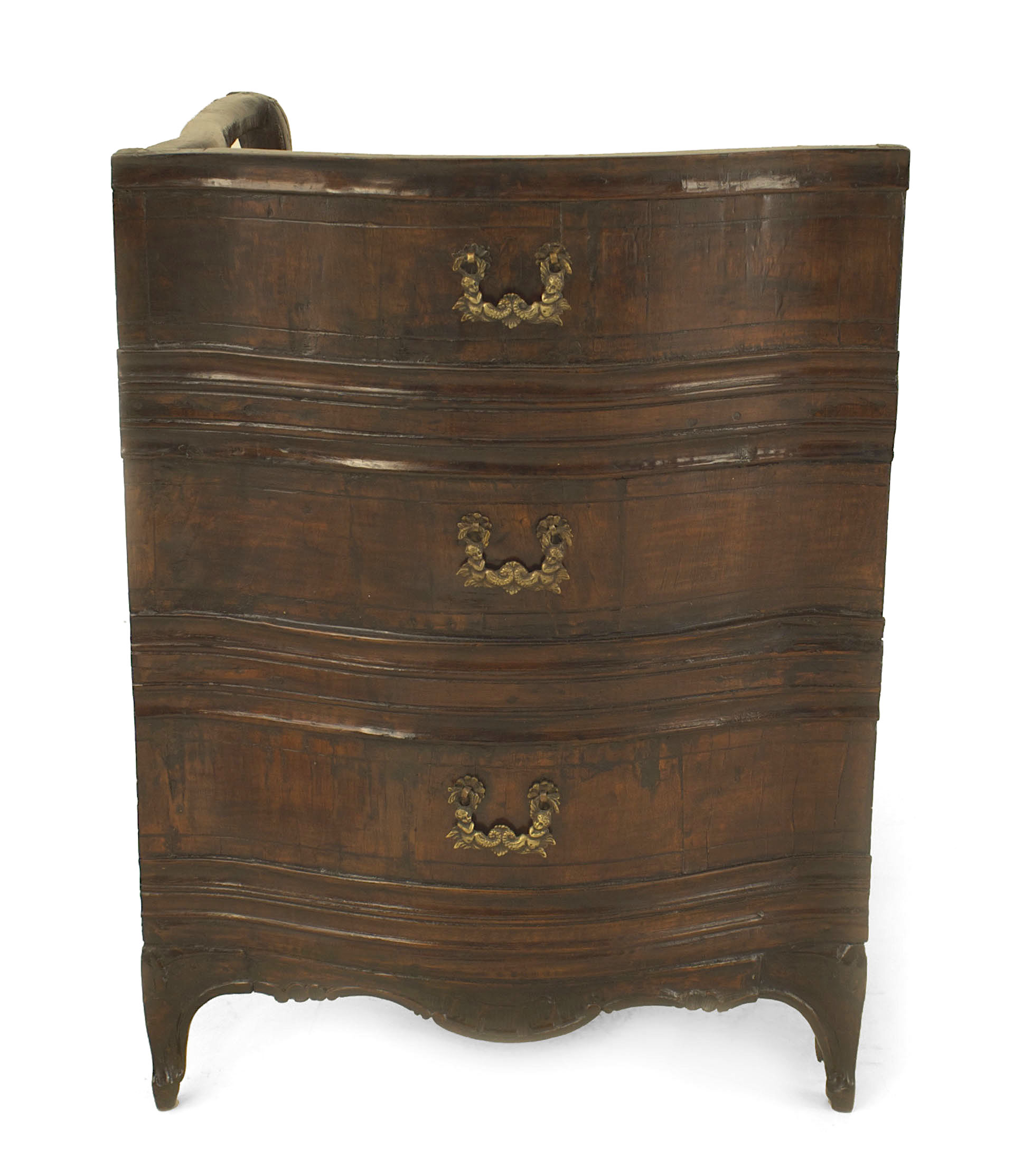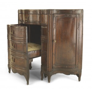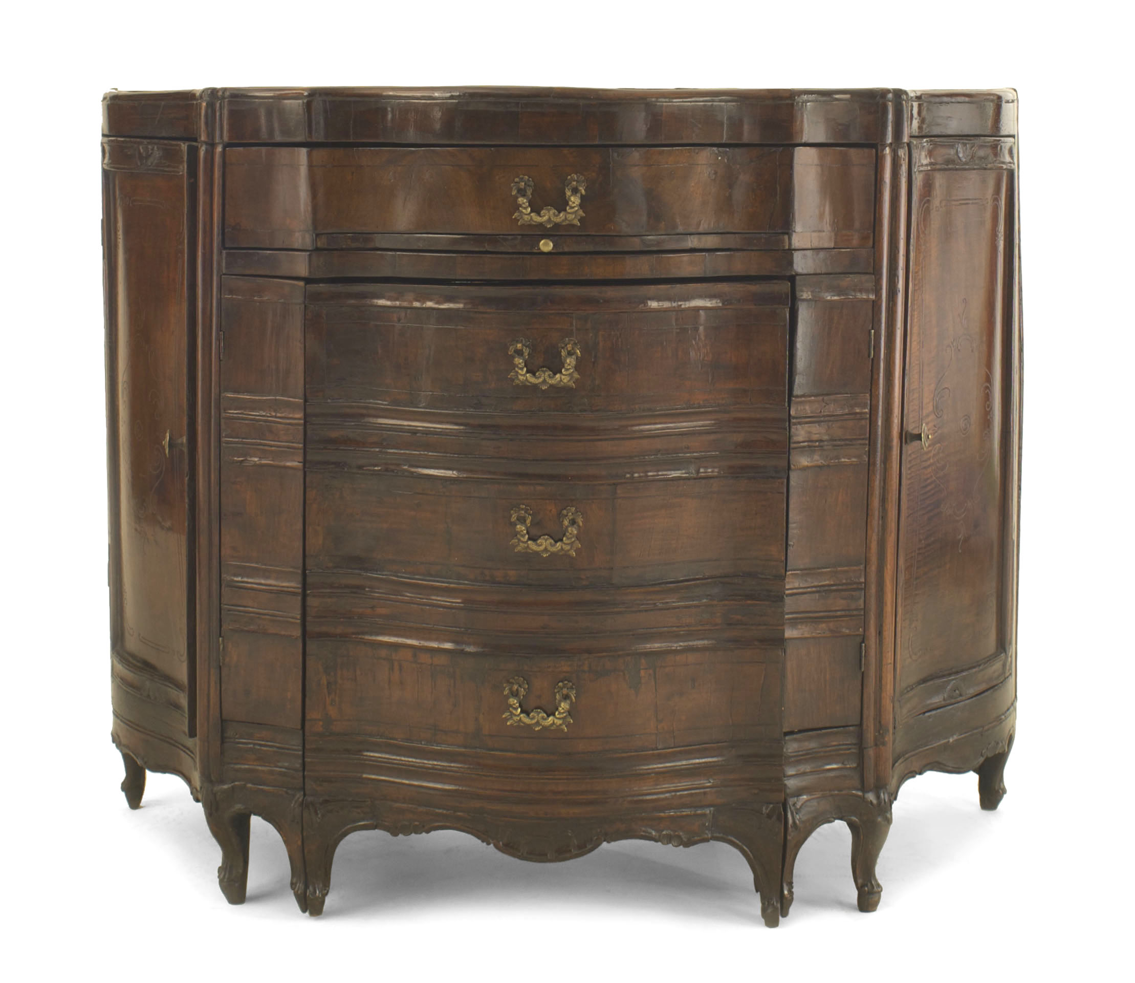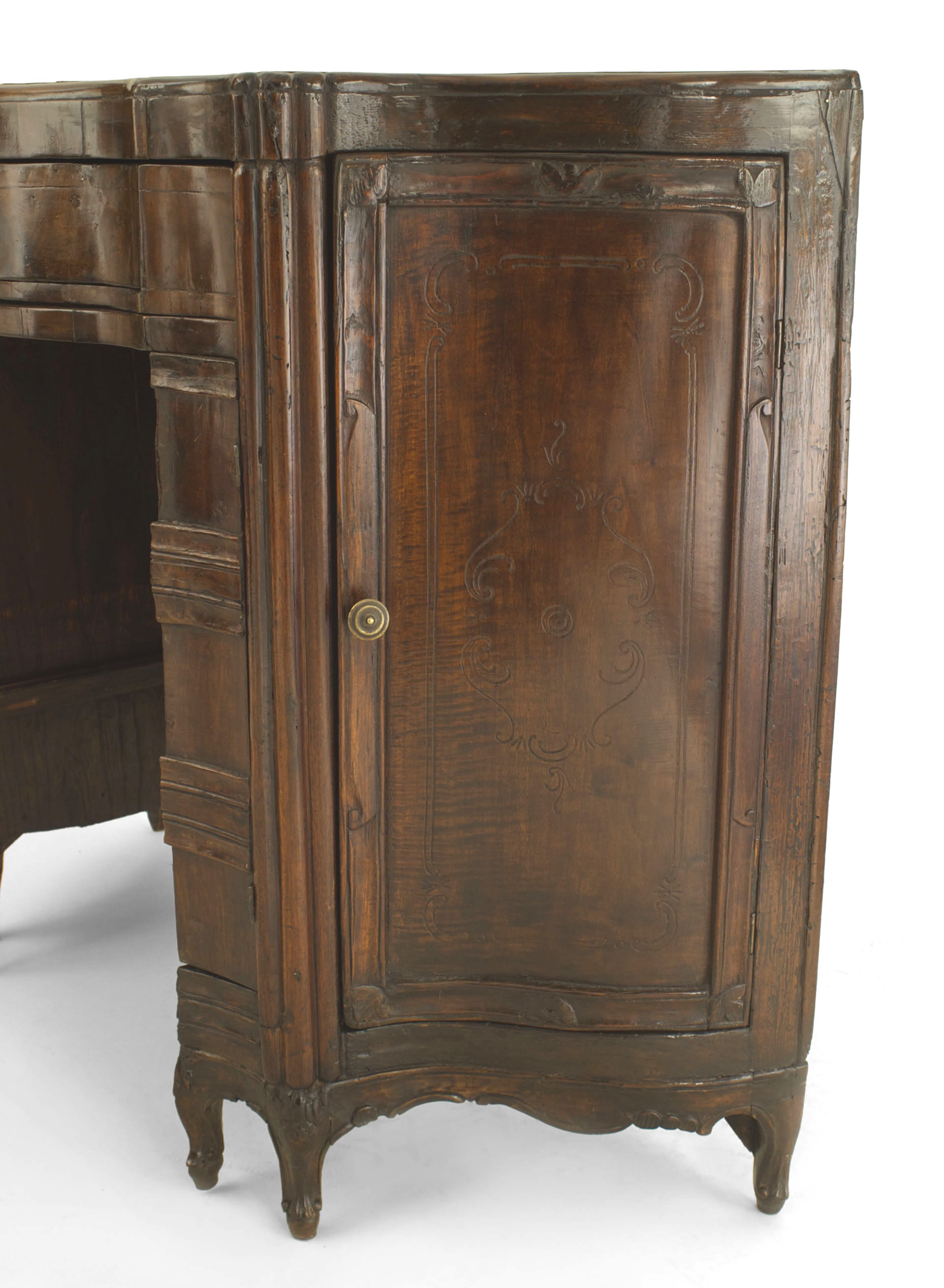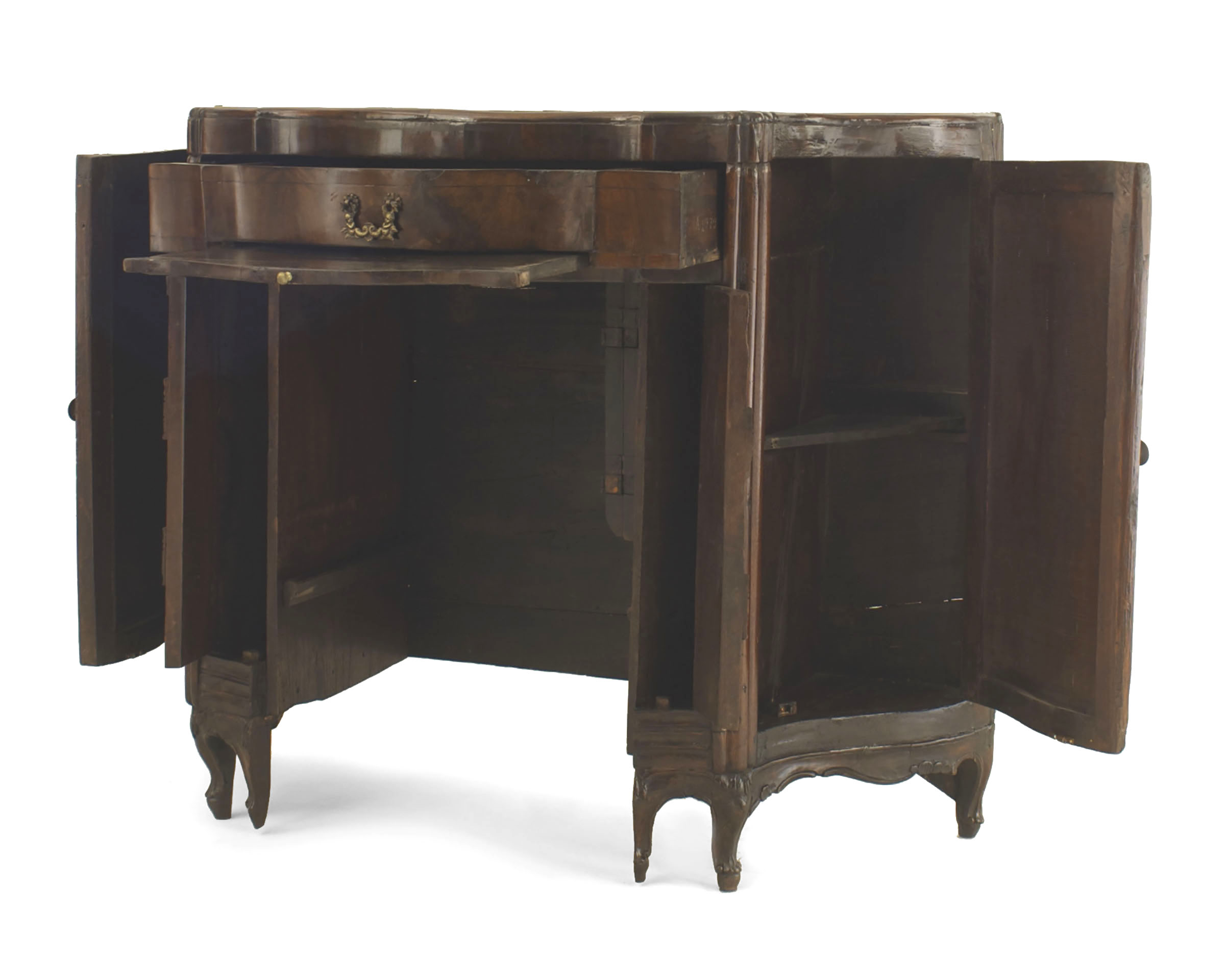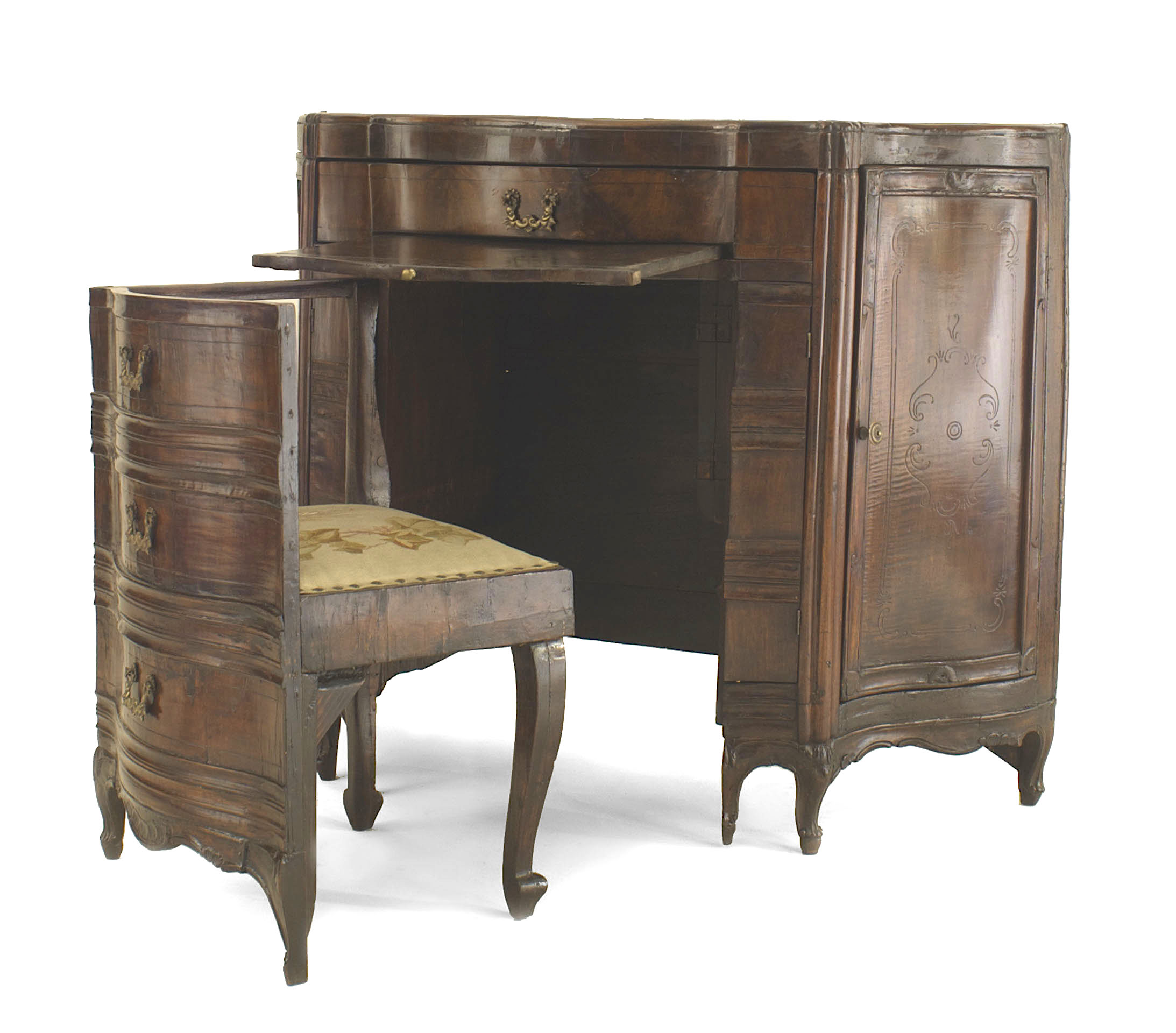 Italian Venetian (18th Century) walnut serpentine shaped desk with 2 side doors and 2 narrow front doors above a drawer with a pull out front interior chair having a left arm..