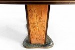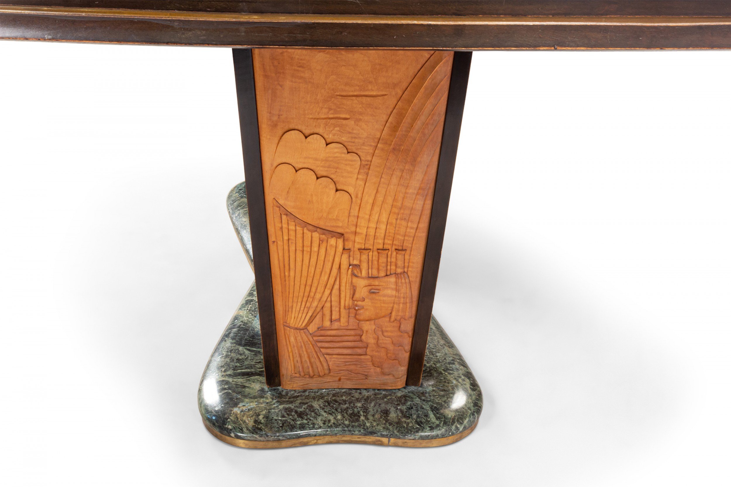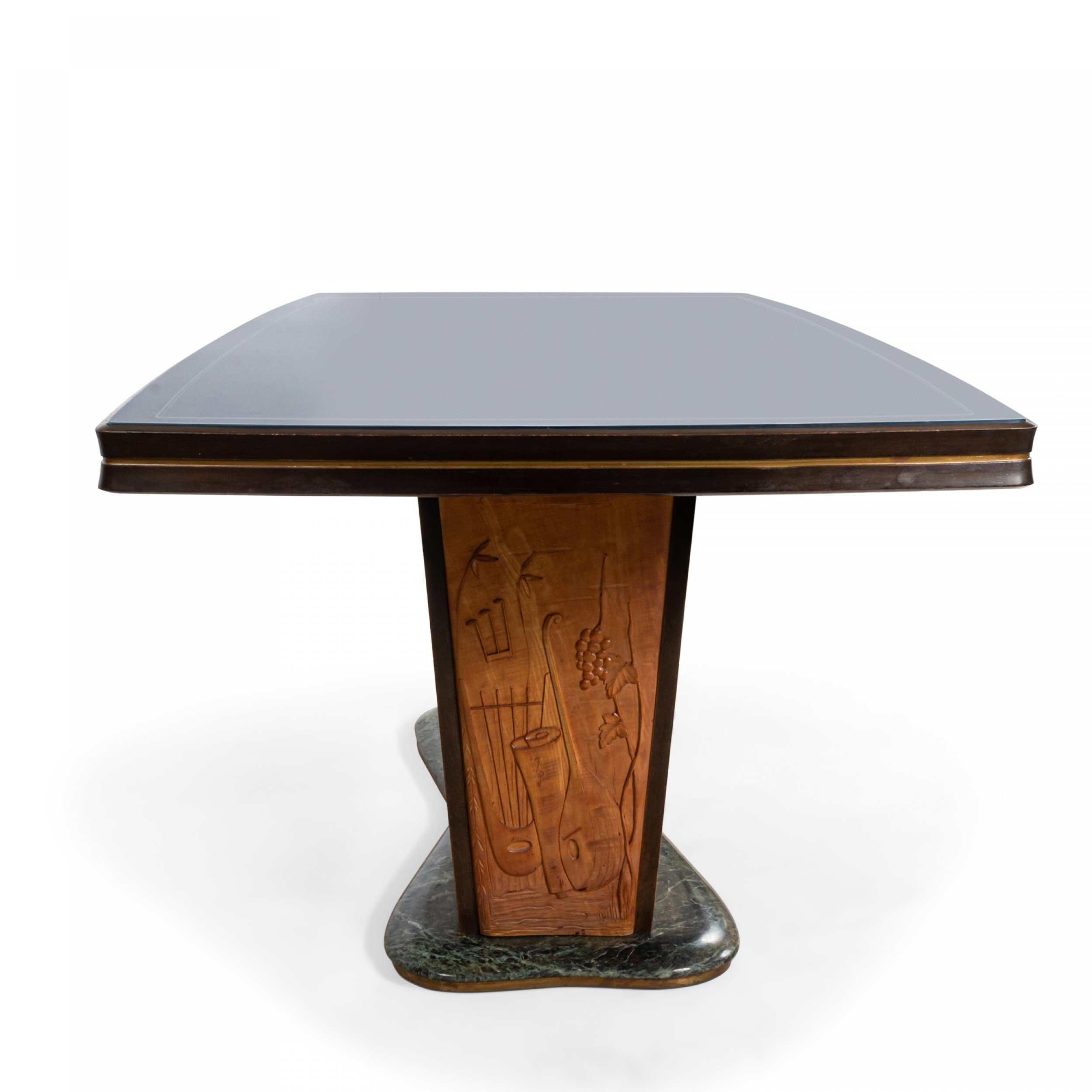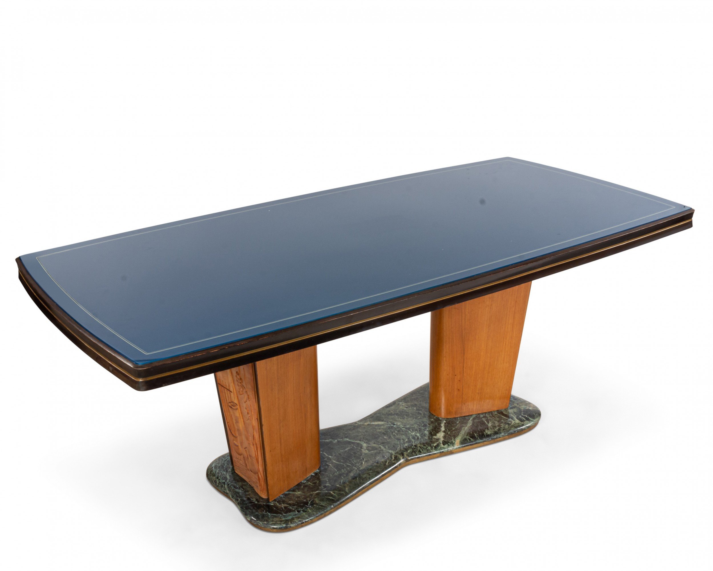 Italian Mid-Century (1950s) walnut & maple dining table with a green free-form marble base supporting 2 carved pedestal bases with relief scene under a blue glass top (Attributed to VITTORIO DASSI / ENZO FERRARI).