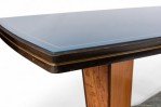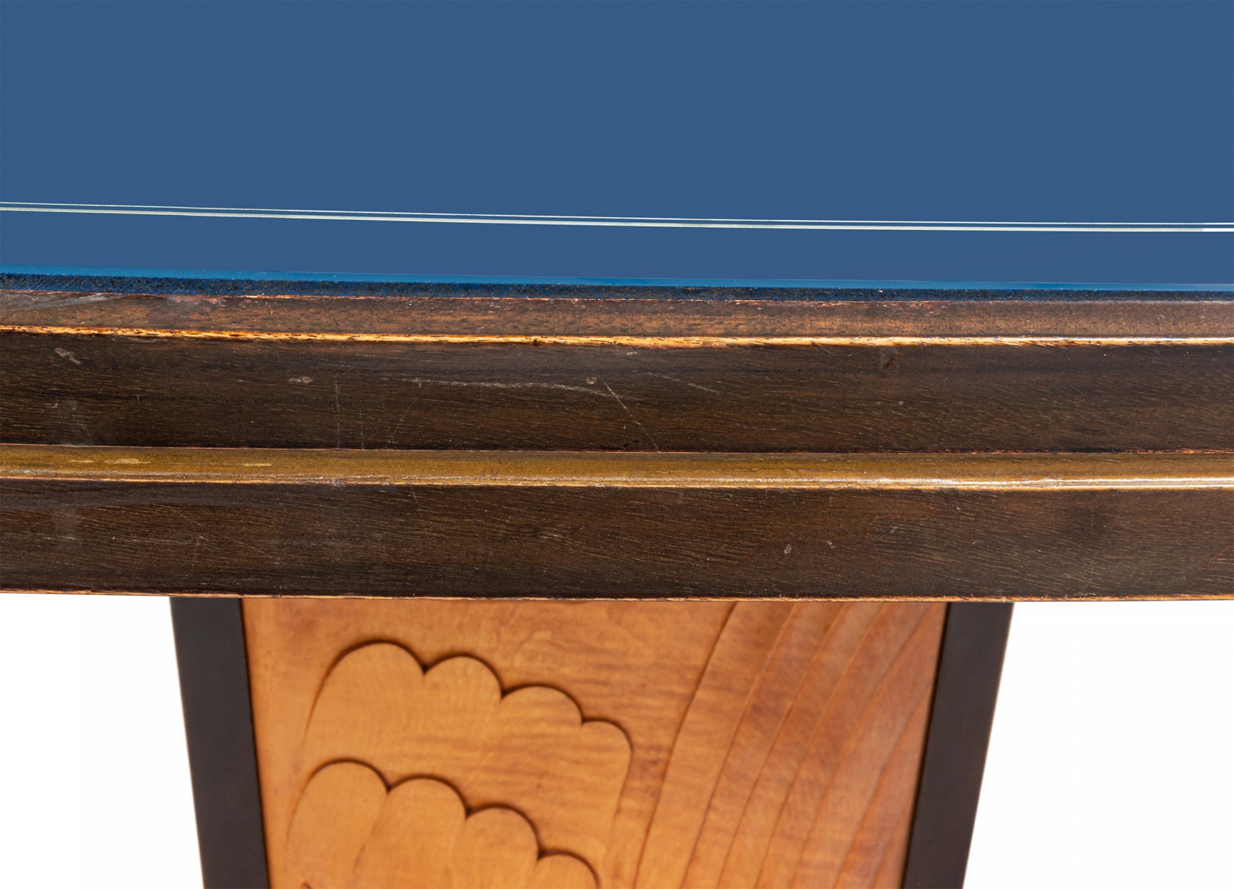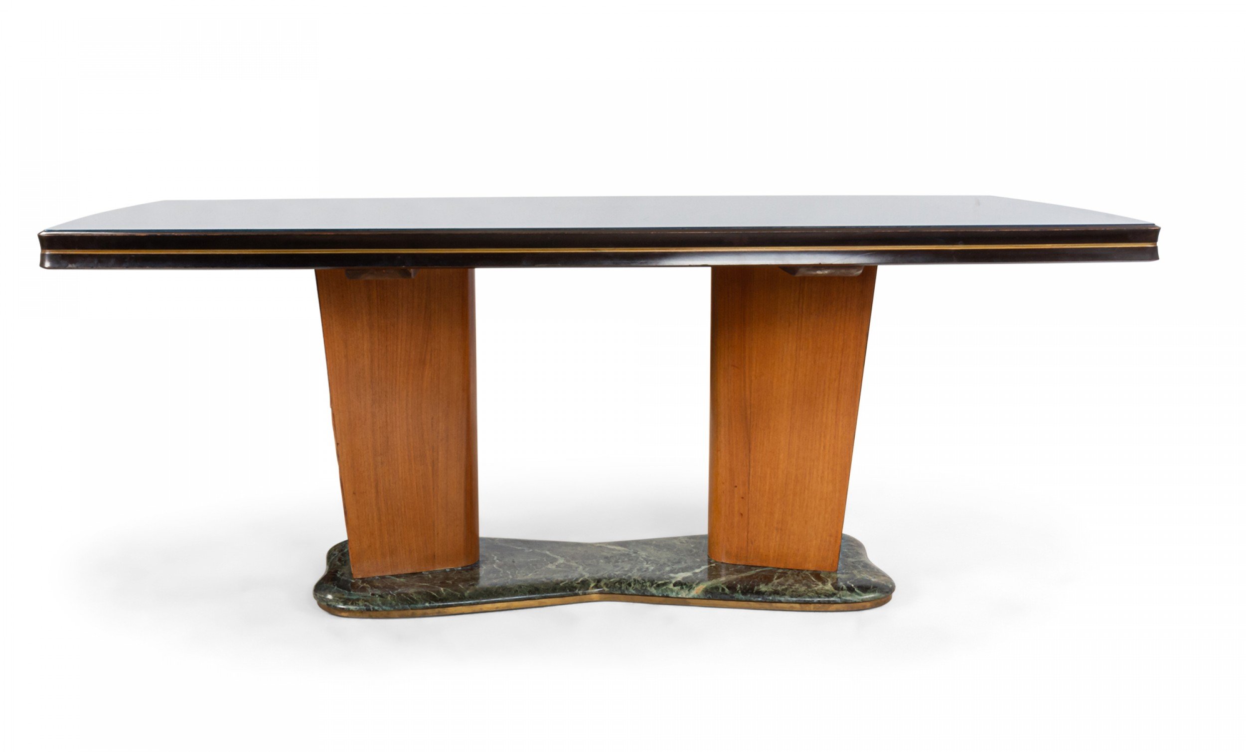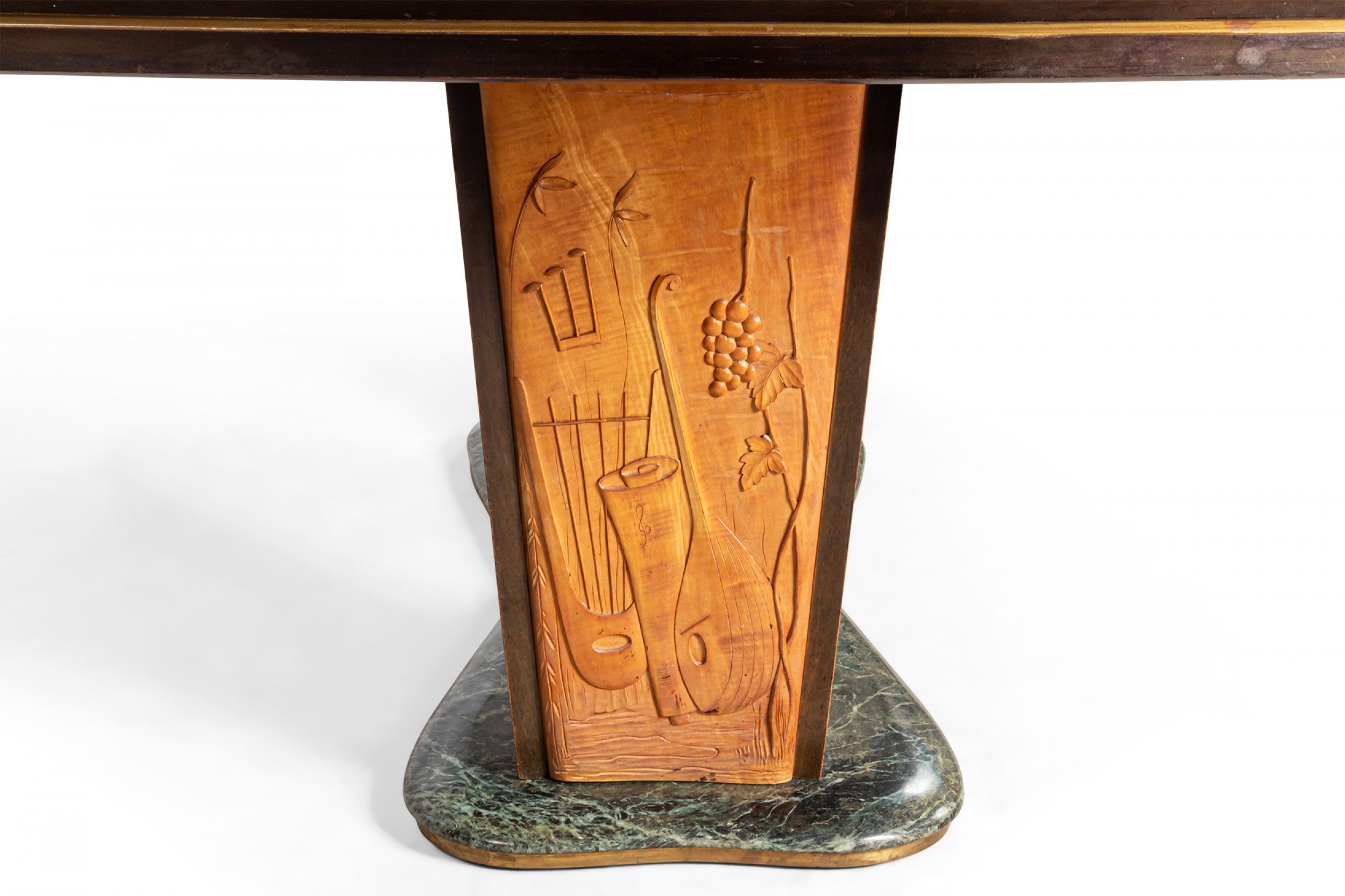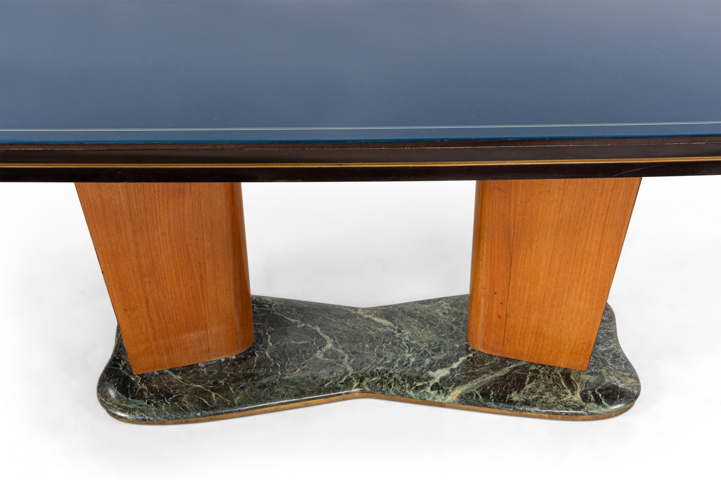 Italian Mid-Century (1950s) walnut & maple dining table with a green free-form marble base supporting 2 carved pedestal bases with relief scene under a blue glass top (Attributed to VITTORIO DASSI / ENZO FERRARI).