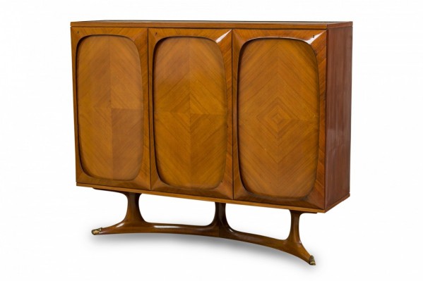 Style: Mid-Century Materials & Techniques: Arch, veneer, walnut Category: Cabinets & Case Goods, Dining Room Condition: The sideboard has minor peeling on the parchment veneer