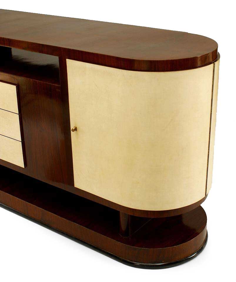 Italian Mid-Century (1930s) walnut sideboard with parchment veneered 2 doors & 3 drawers with rounded end and raised top & platform base with ebonized trim (Manner of A. BERDOLINI)