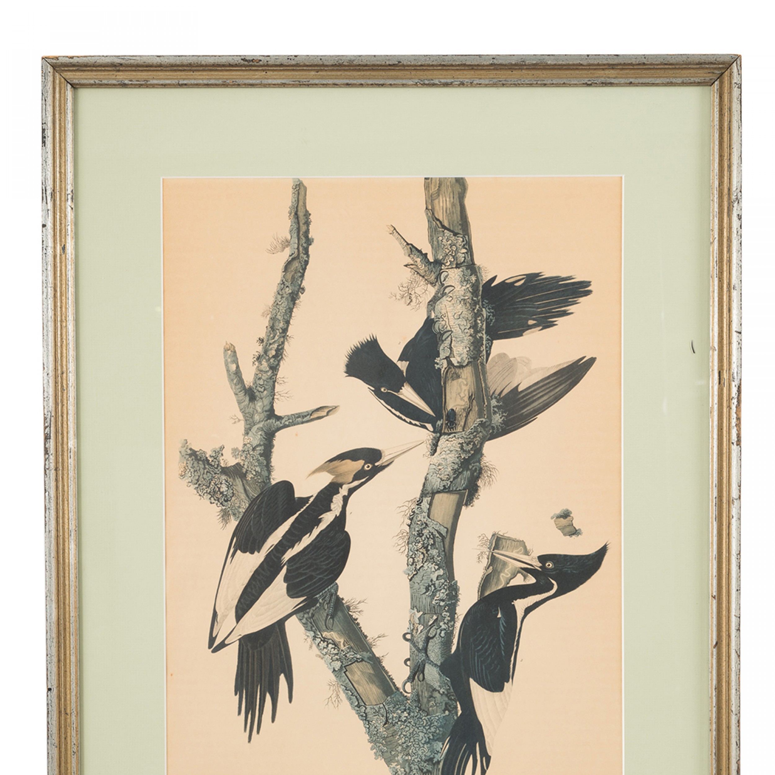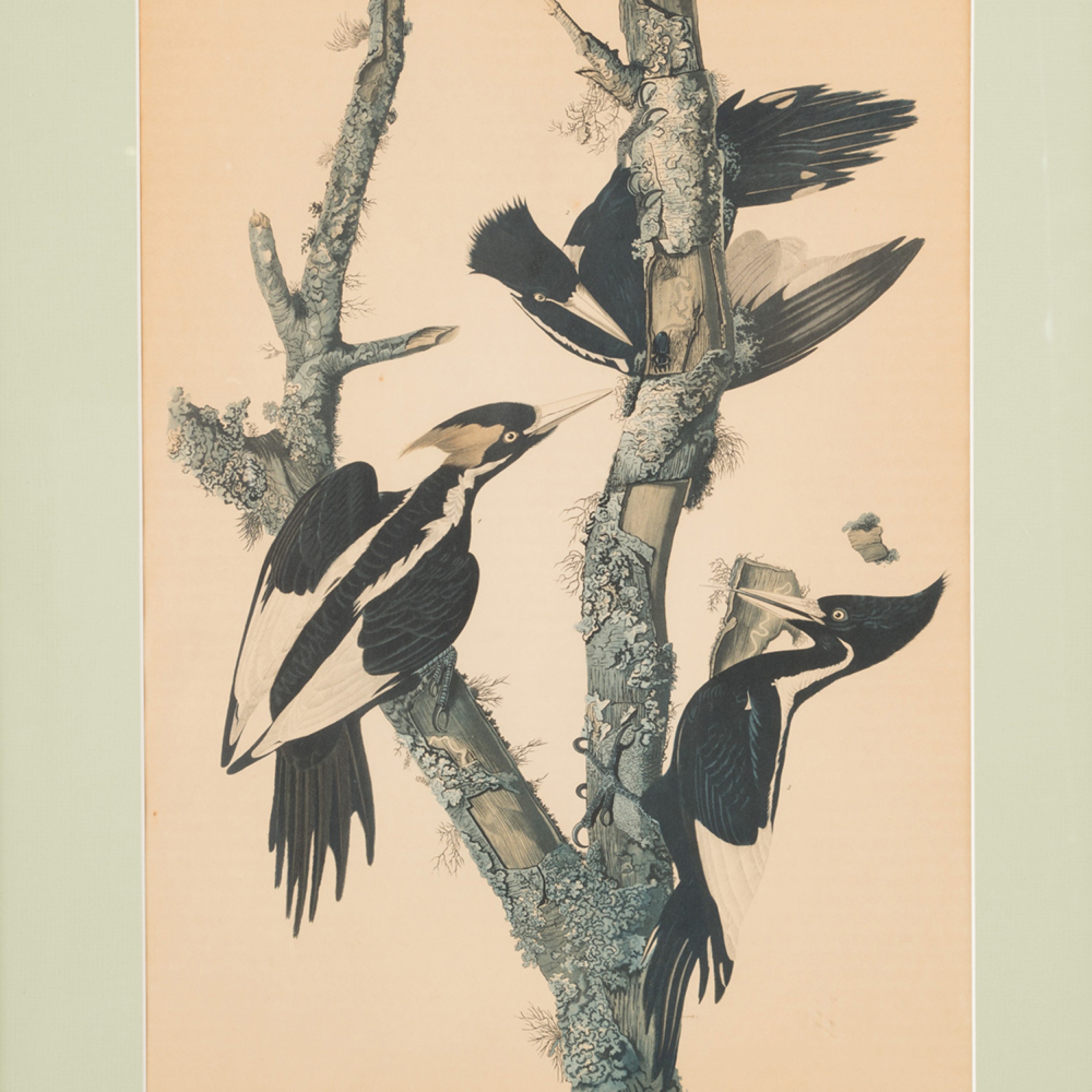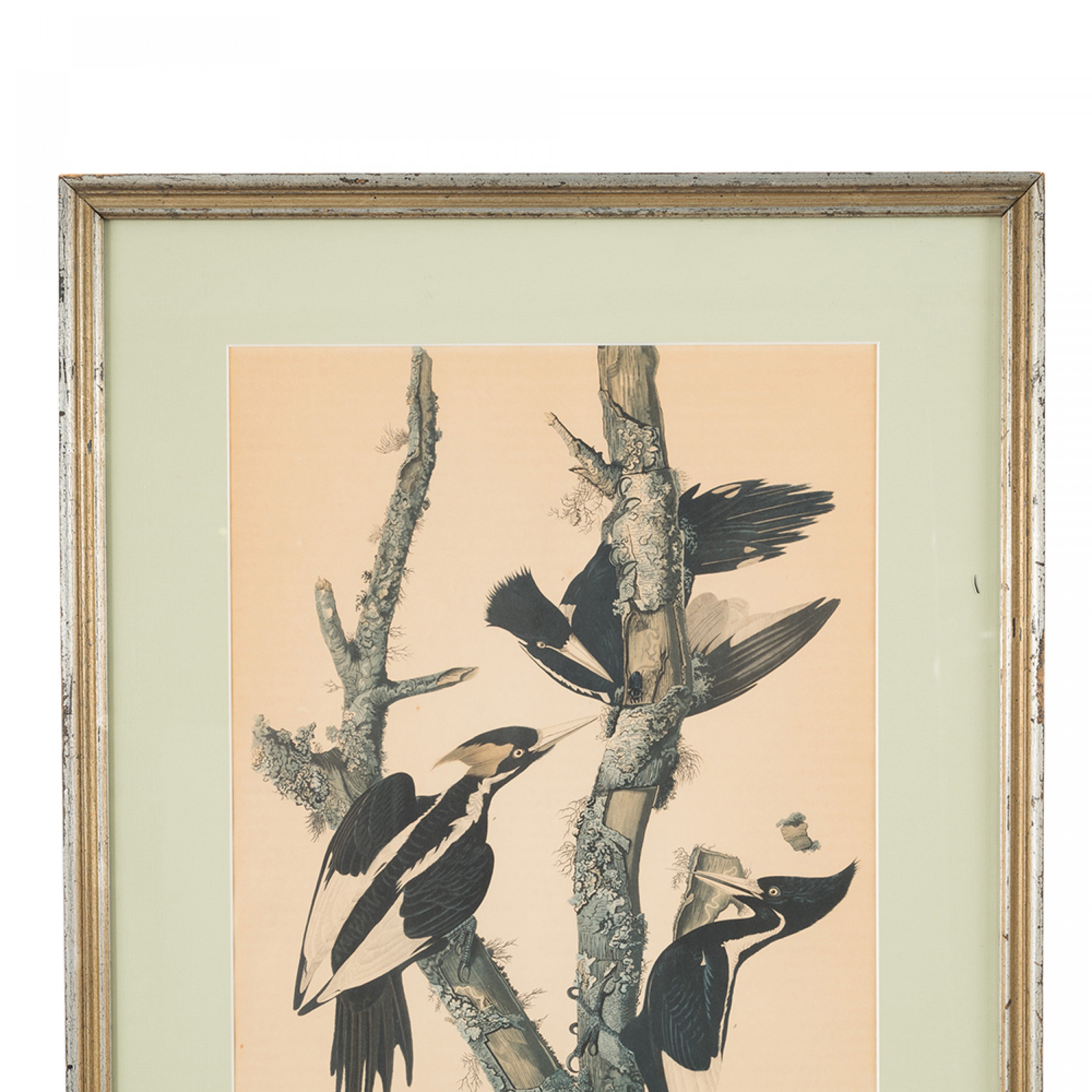 Vintage J.J. Audubon color print of three ivory-billed woodpeckers under clear plexiglass in sage green matting and a gray painted rectangular wooden frame