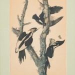 Vintage J.J. Audubon color print of three ivory-billed woodpeckers under clear plexiglass in sage green matting and a gray painted rectangular wooden frame.