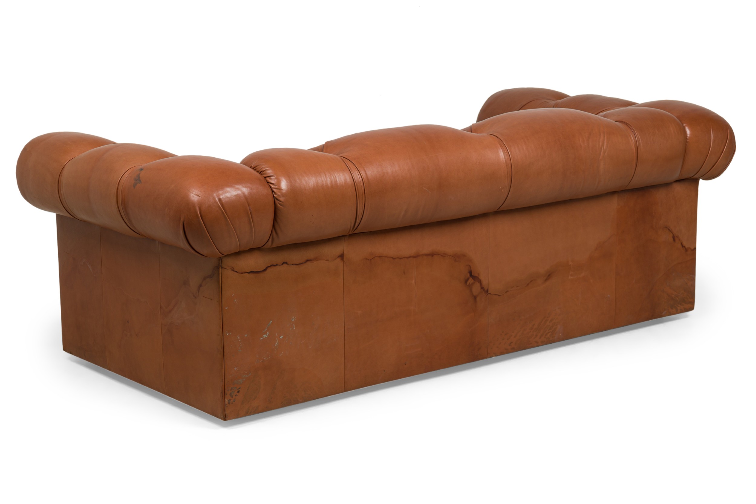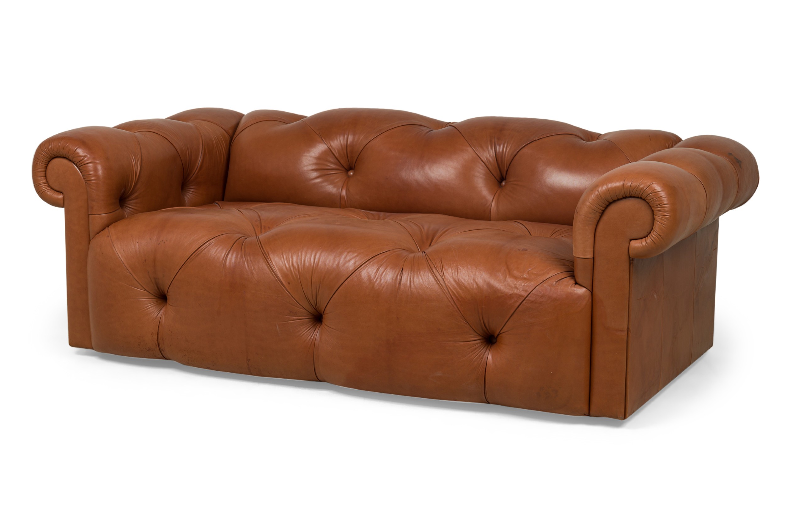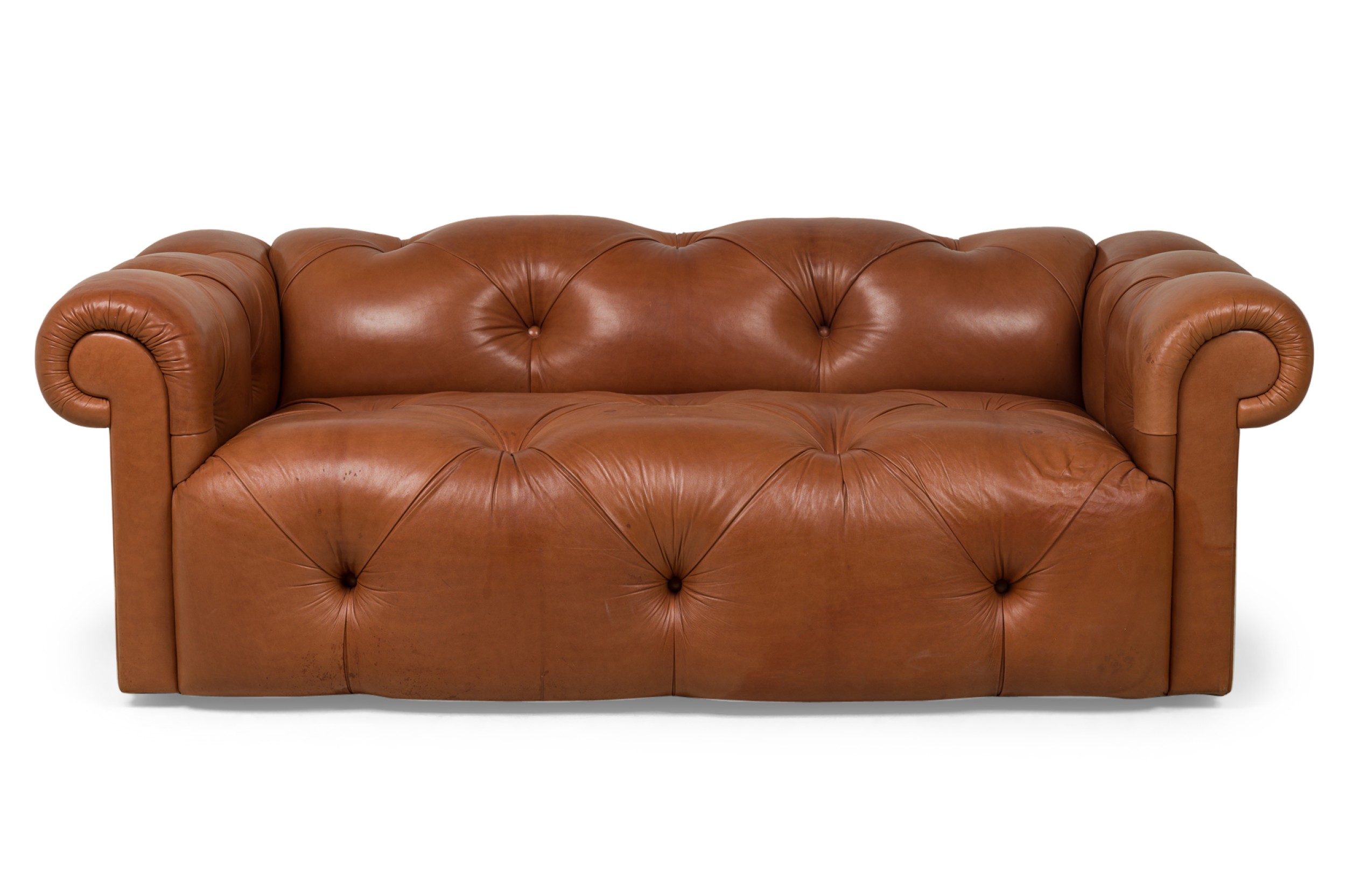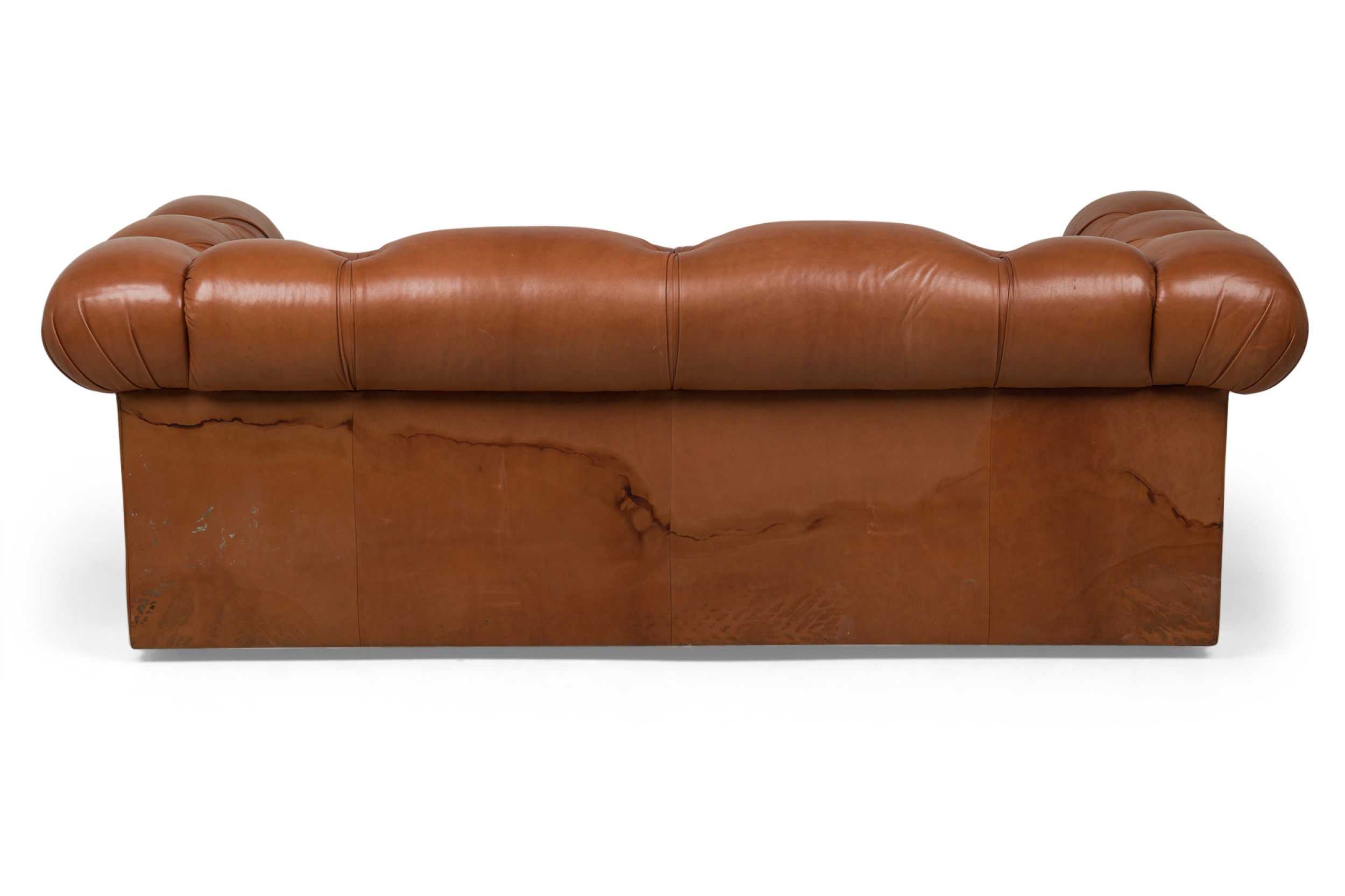 PAIR of American Mid-Century tufted brown / tan tufted leather chesterfield 3 seater sofas (J. ROBERT SCOTT)(PRICED AS PAIR).