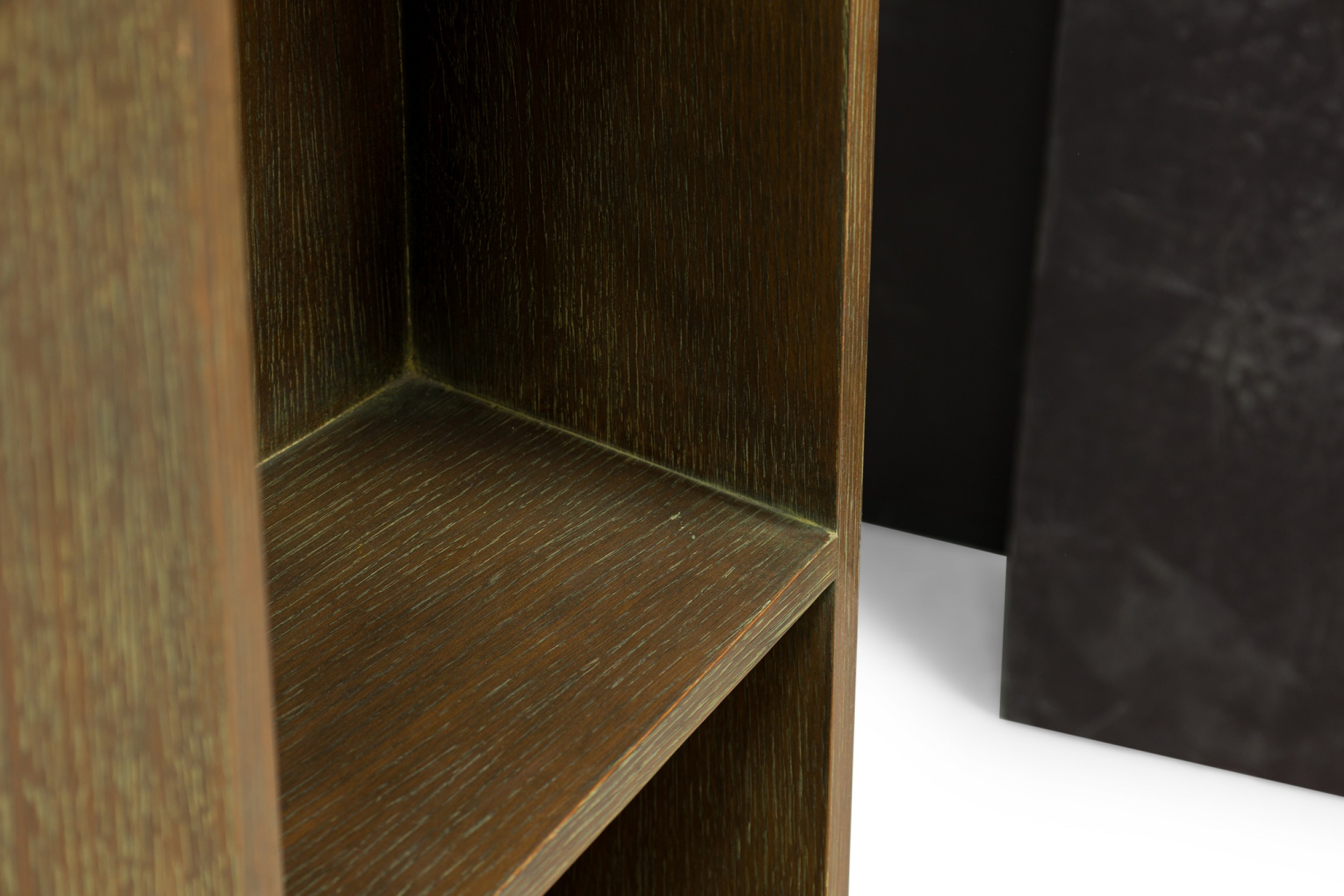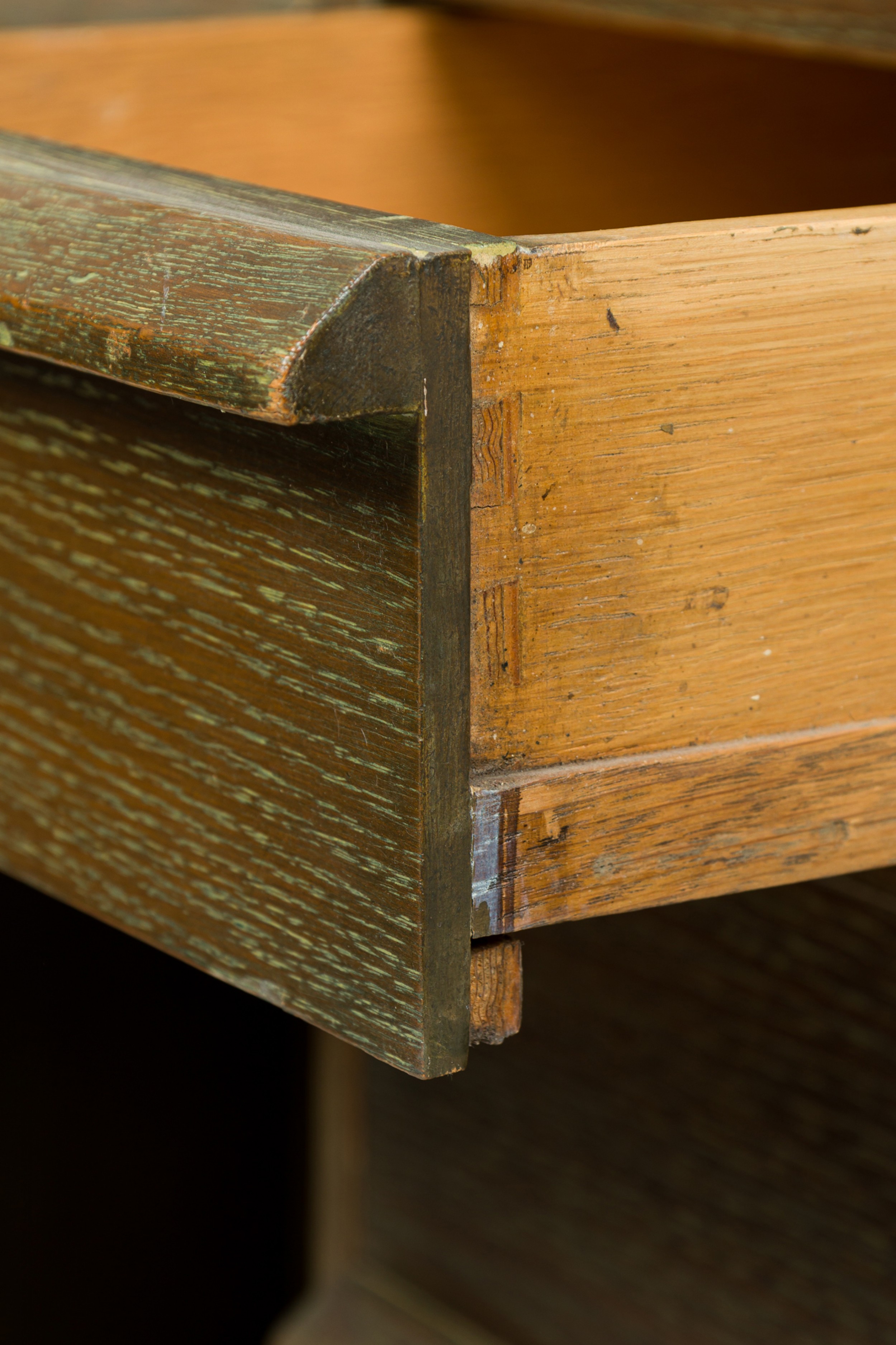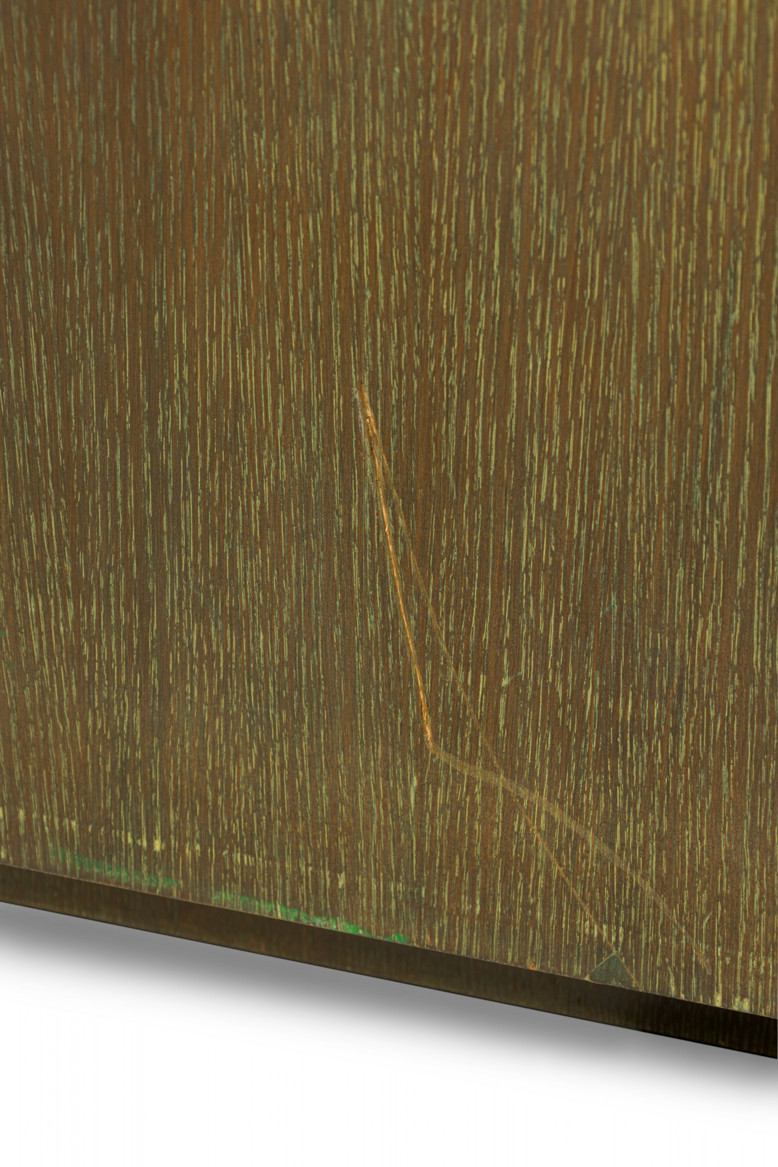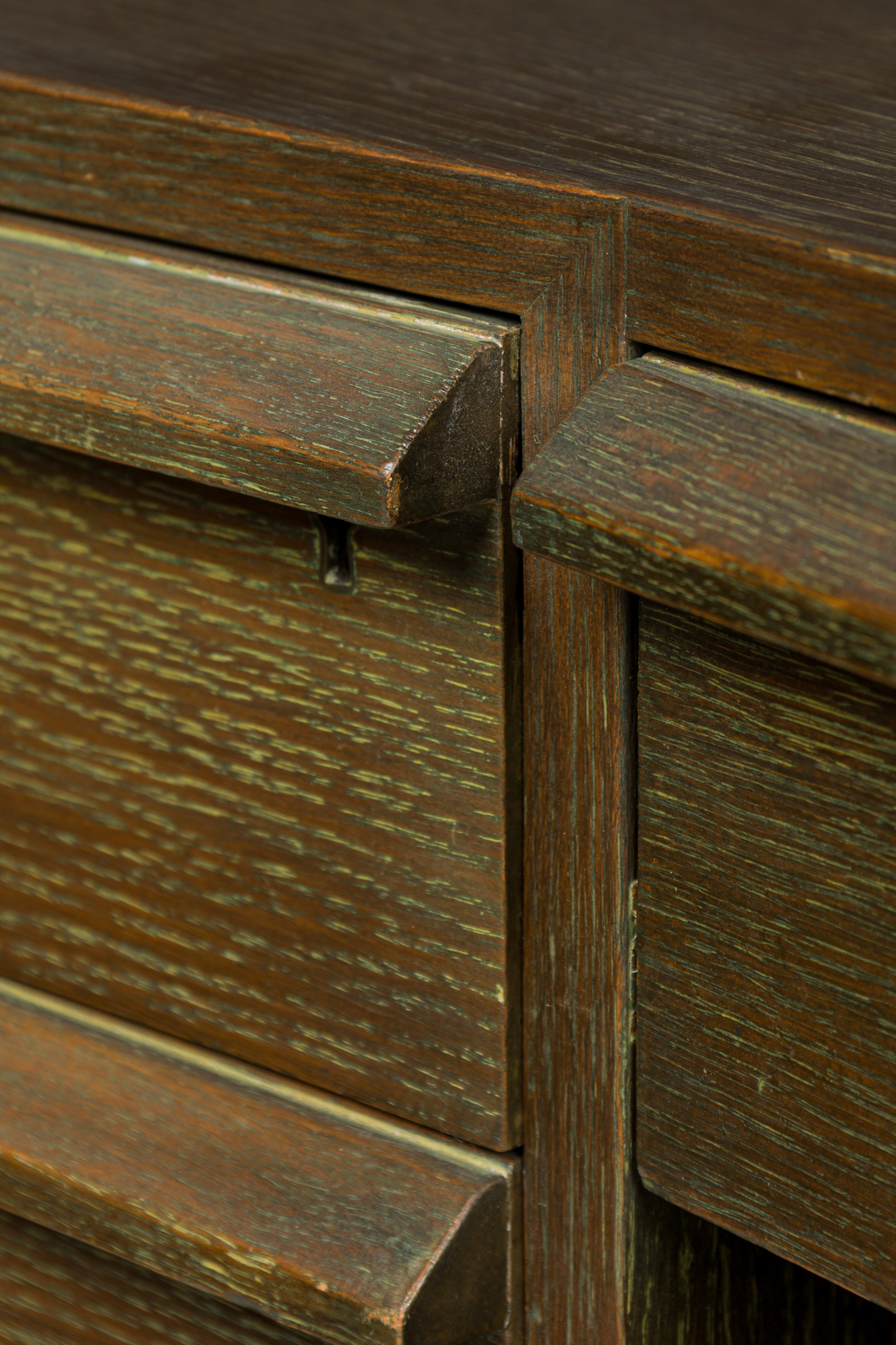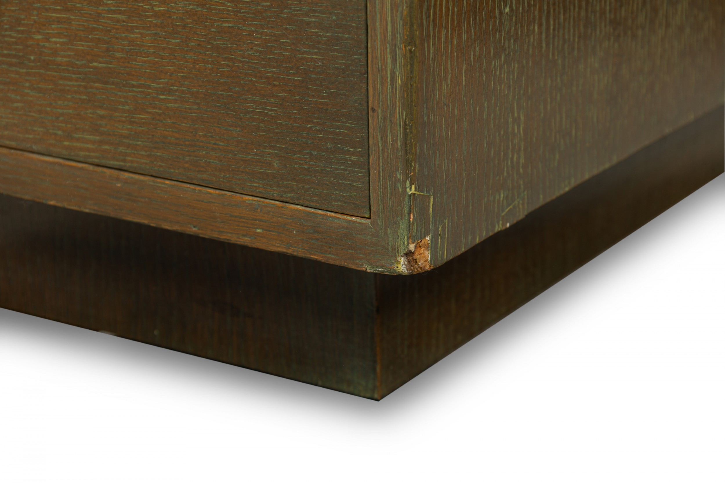 Style: Mid-Century Materials & Techniques: Cerused, oak, wood Category: Office/Library Condition: Scratches and wear to finish, some veneer losses around corners. Good; Wear consistent with age and use