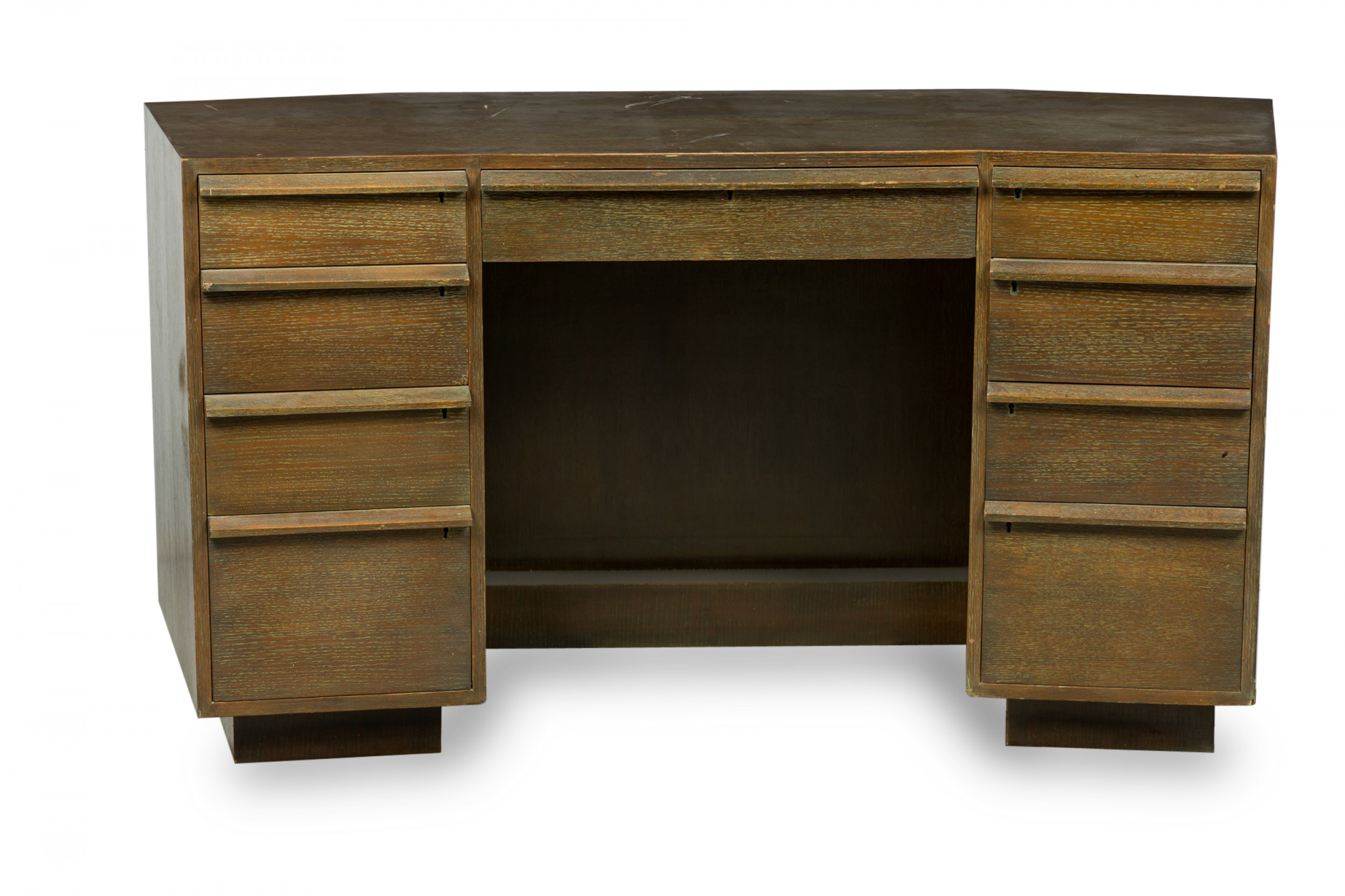 French Mid-Century cerused oak kneehole desk with a central drawer flanked on either side by a column of four drawers, with wooden top-mounted drawer pulls. (JACQUES ADNET)
