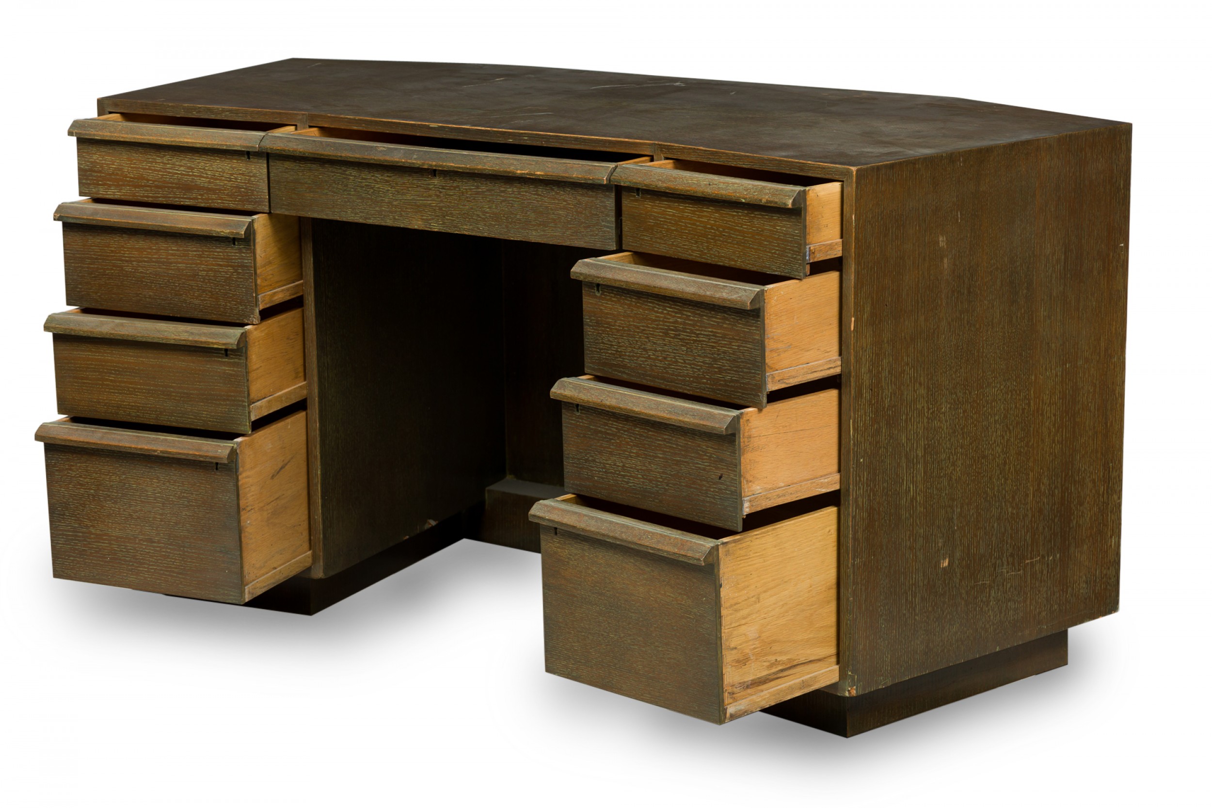 French Mid-Century cerused oak kneehole desk with a central drawer flanked on either side by a column of four drawers, with wooden top-mounted drawer pulls. (JACQUES ADNET).