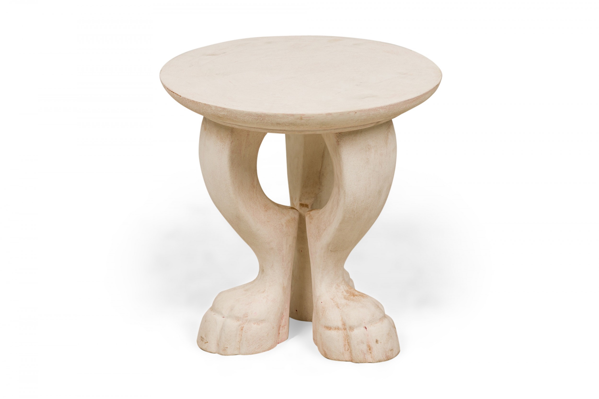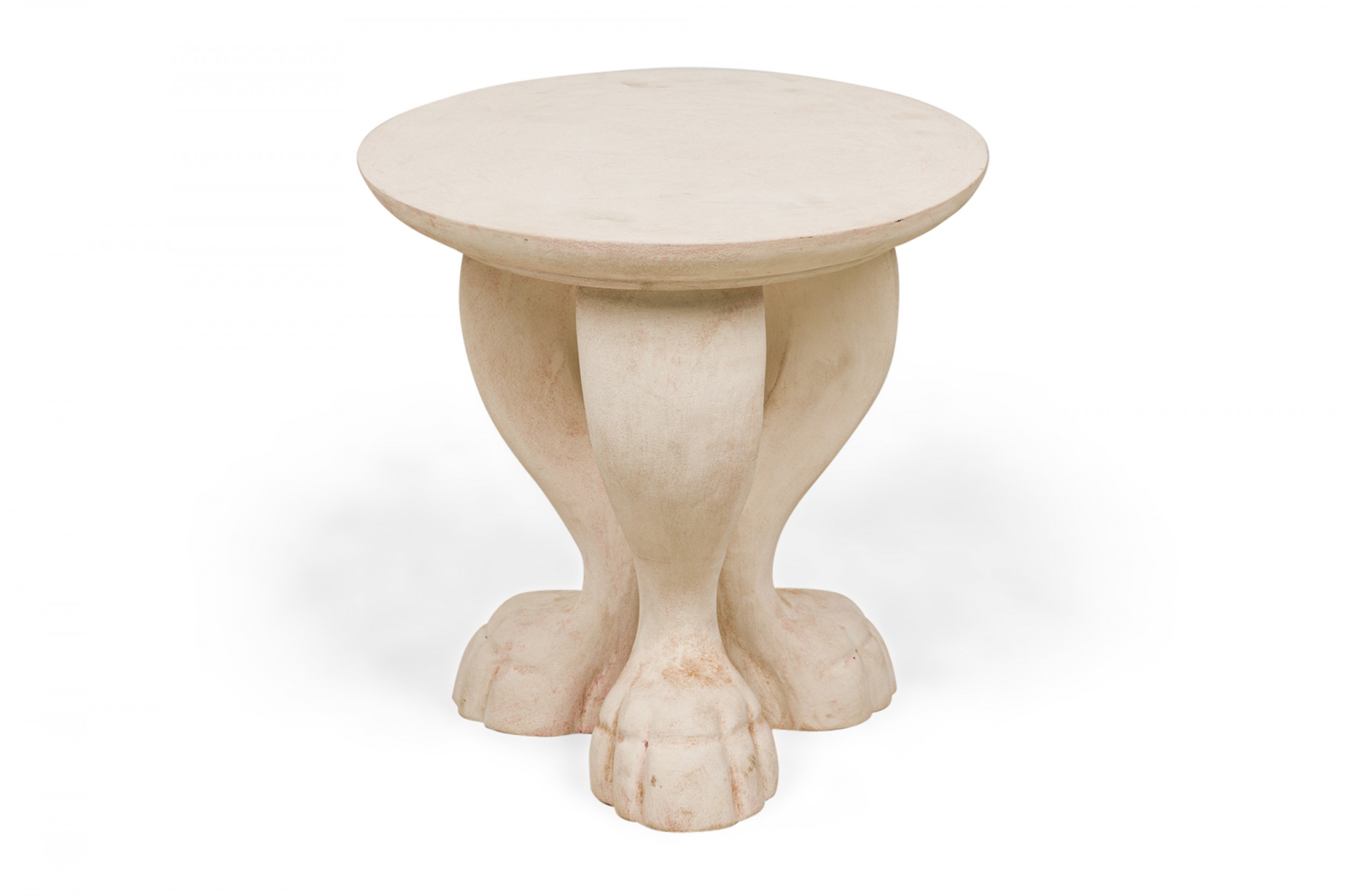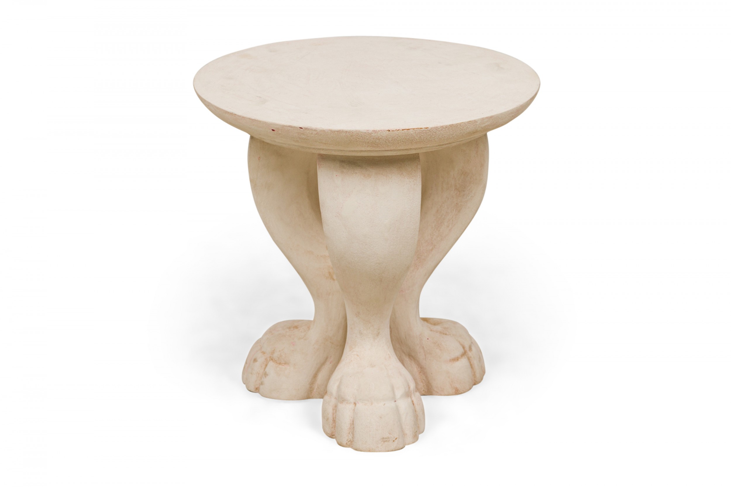 French Mid-Century 'Le Lion' white stone end / side table or stand with a circular top resting on three curved leonine legs ending in three paws. (JACQUES GARCIA FOR BAKER FURNITURE COMPANY)