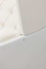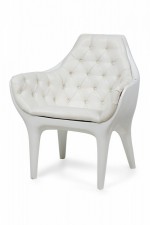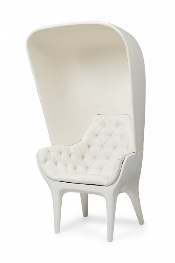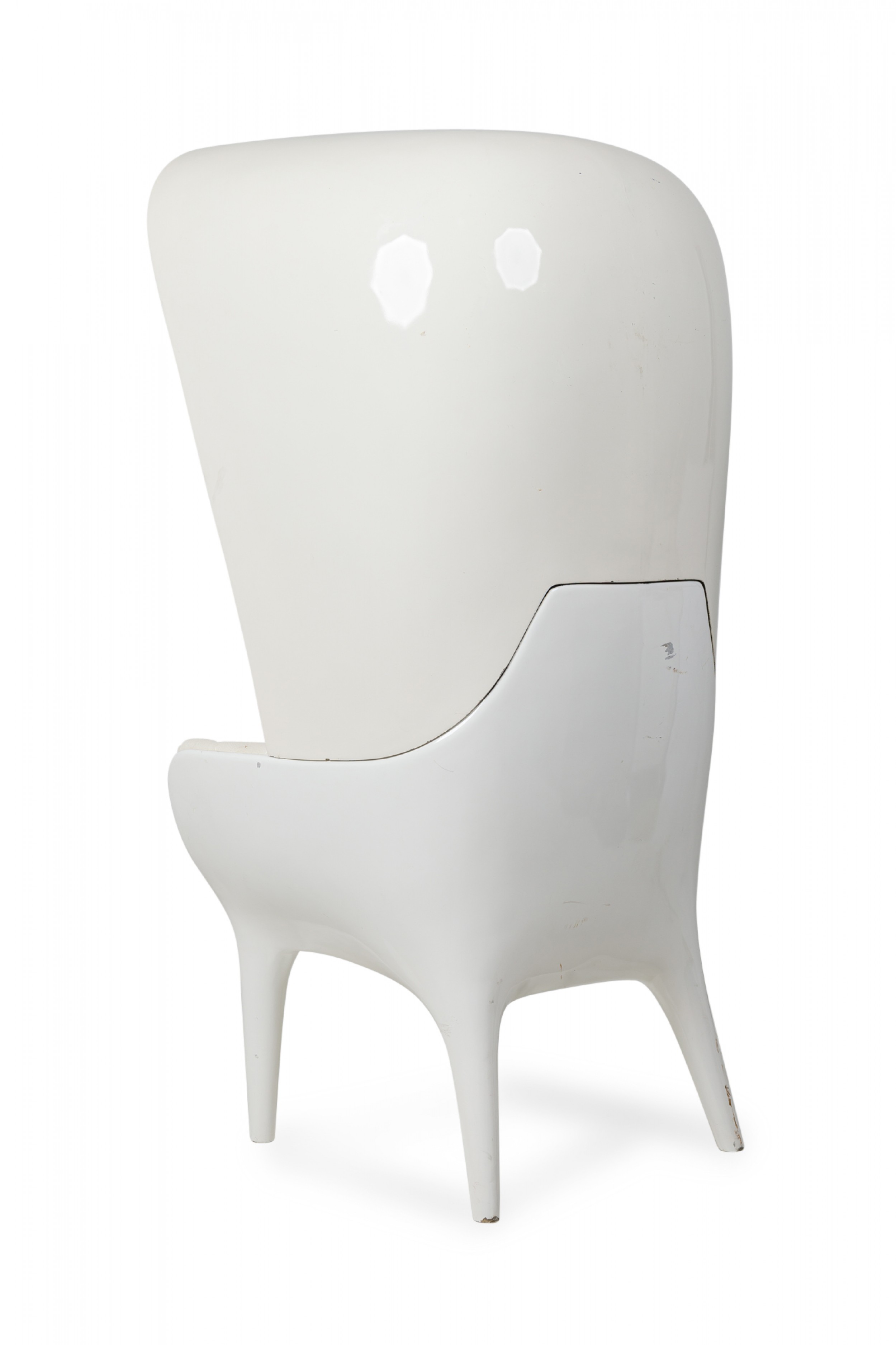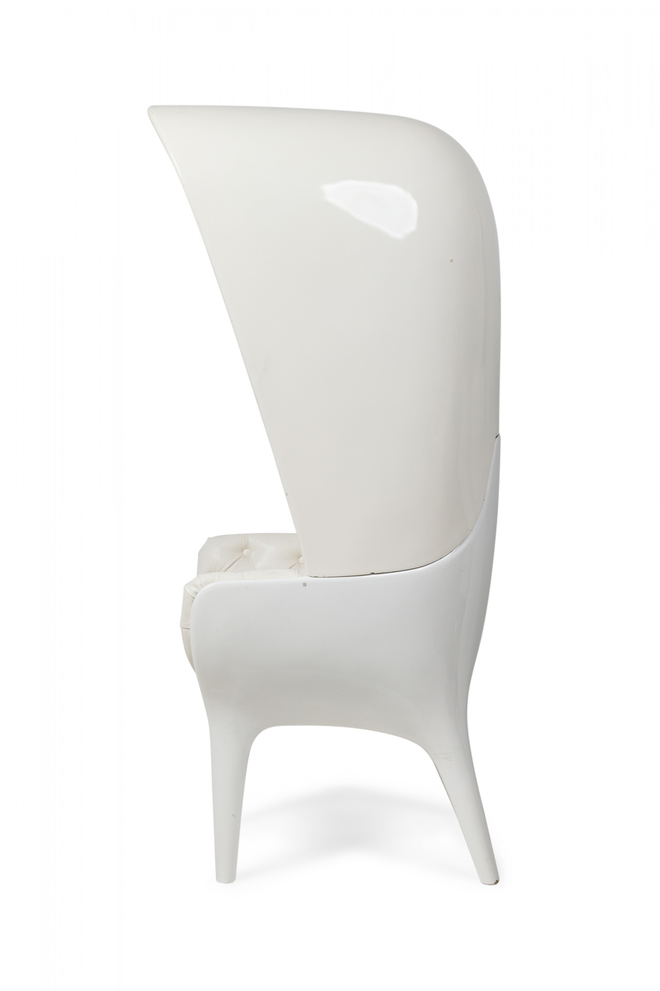 Contemporary Spanish "Showtime" hooded armchair with a removable white lacquered polyethylene cover, button tufted white leather upholstery, standing on sculptural molded feet. (JAIME HAYON).