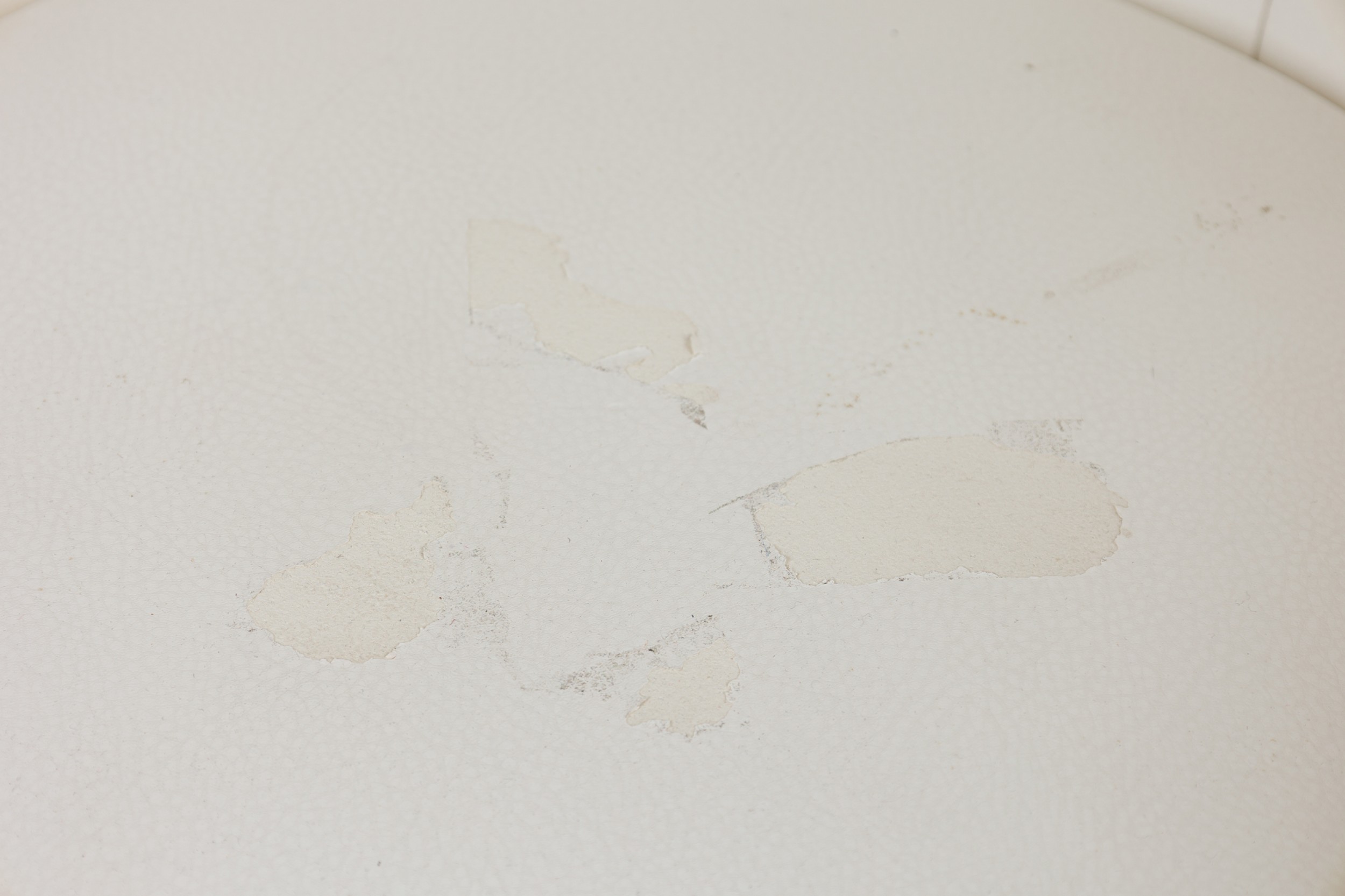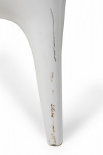 Style: Contemporary/Post-War Design Materials & Techniques: Lacquered, leather, plastic, upholstered Category: Seating Condition: Chair without cover: 31.5" W x 26" D x 37" H x 19.5" SH. Some wear. Leather strip on cover torn & frayed. Good; Wear consistent with age and use