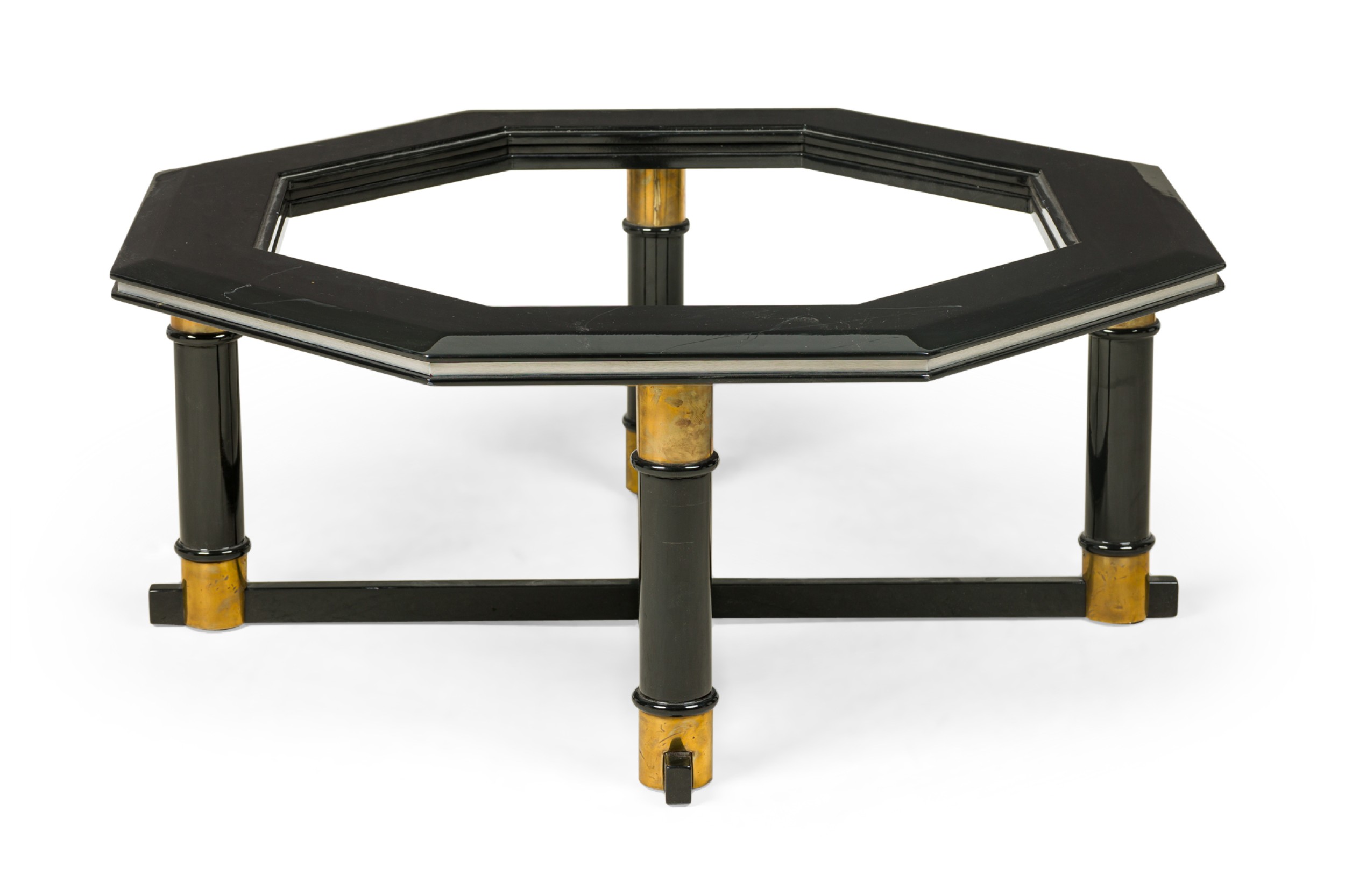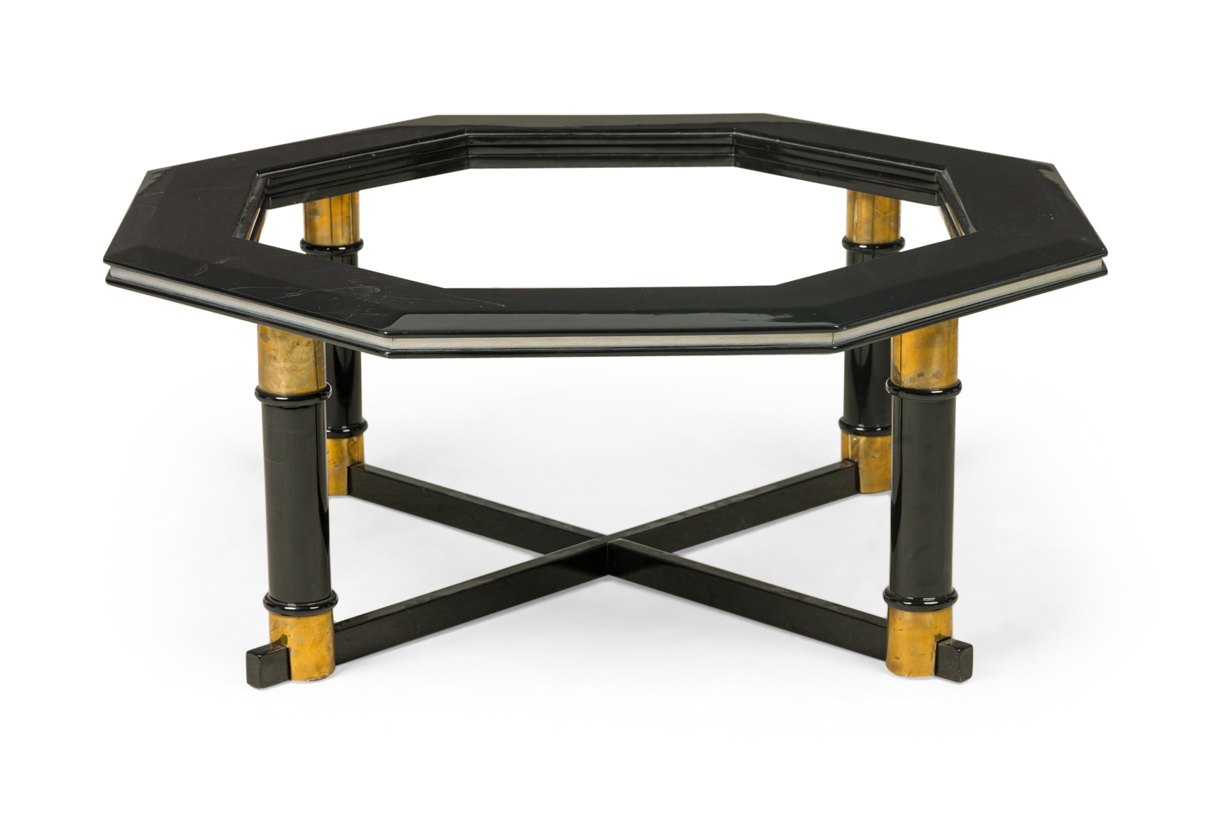 Mid-Century American "Hollywood Regency" style octagonal low coffee table frame, finished in high sheen black lacquer with decorative brass mounts. (JAMES MONT) (glass /or marble top missing but can be made to order)