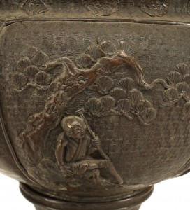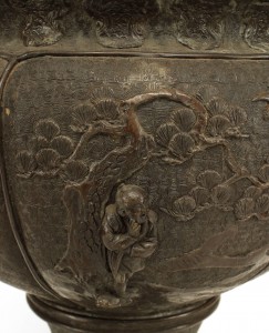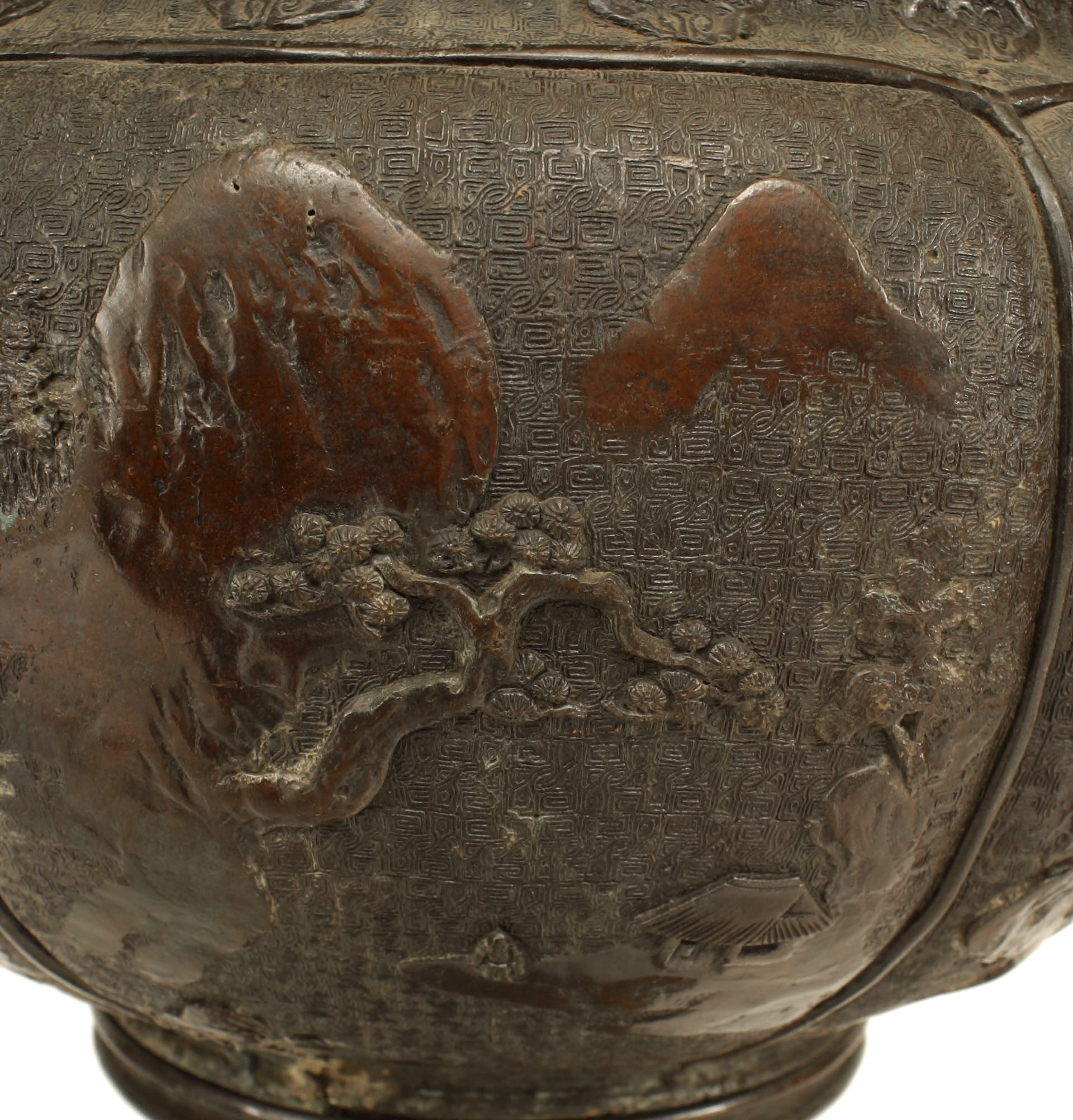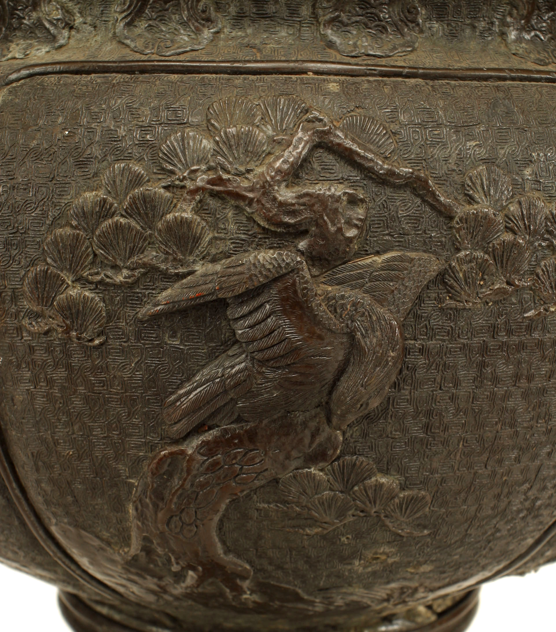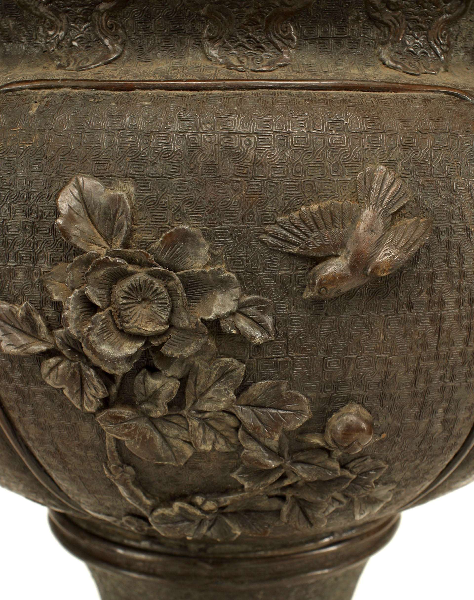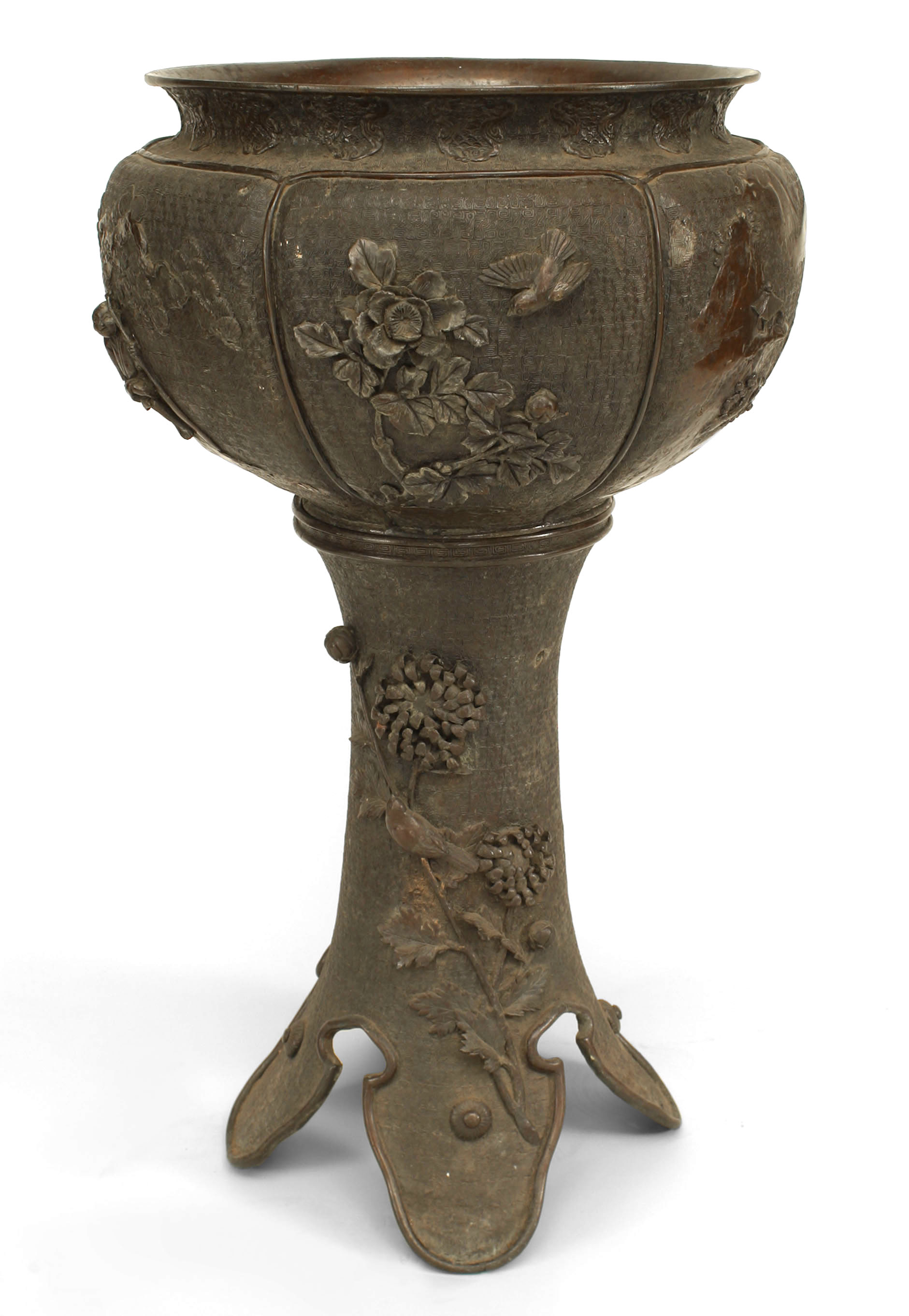 Asian Japanese (19th Century) bronze 2 piece jardiniere with birds and floral design in relief on stand..