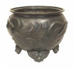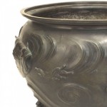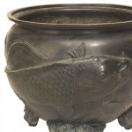 Oriental Japanese (19th Century) bronze large jardiniere with a green patina and carp in relief and raise on 4 cloud form feet (Koyoto School; Meiji Period).