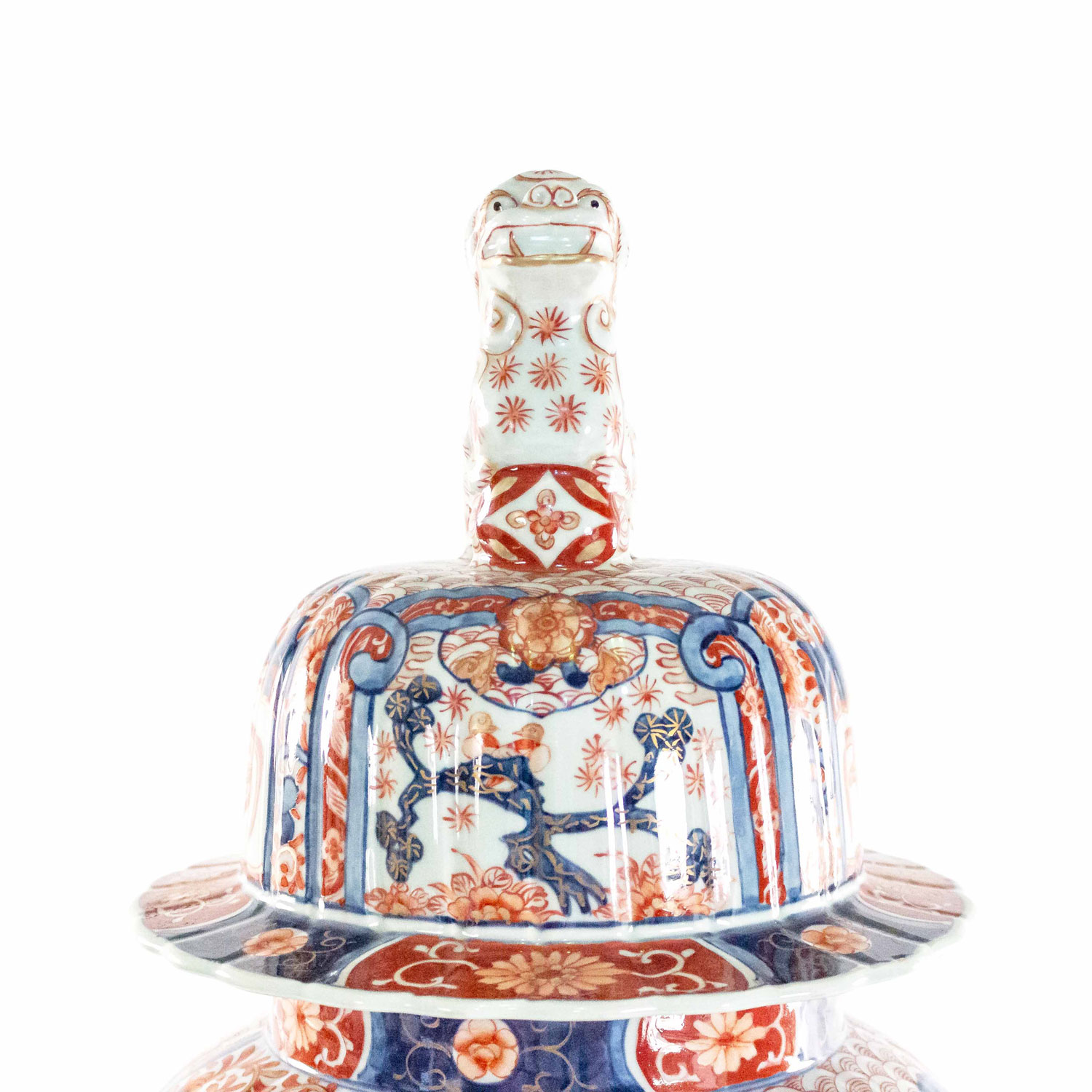 PAIR of Asian Japanese large imari rose porcelain covered baluster-shaped vases (temple jars) with lids having foo dog finials (19/20th Century)