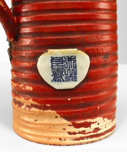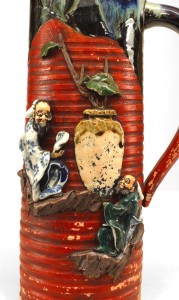 Asian Japanese Meiji period (19/20th Century) red and black glazed terra cotta pitcher with figures of scholars in high relief (signed Sumida Gawa)