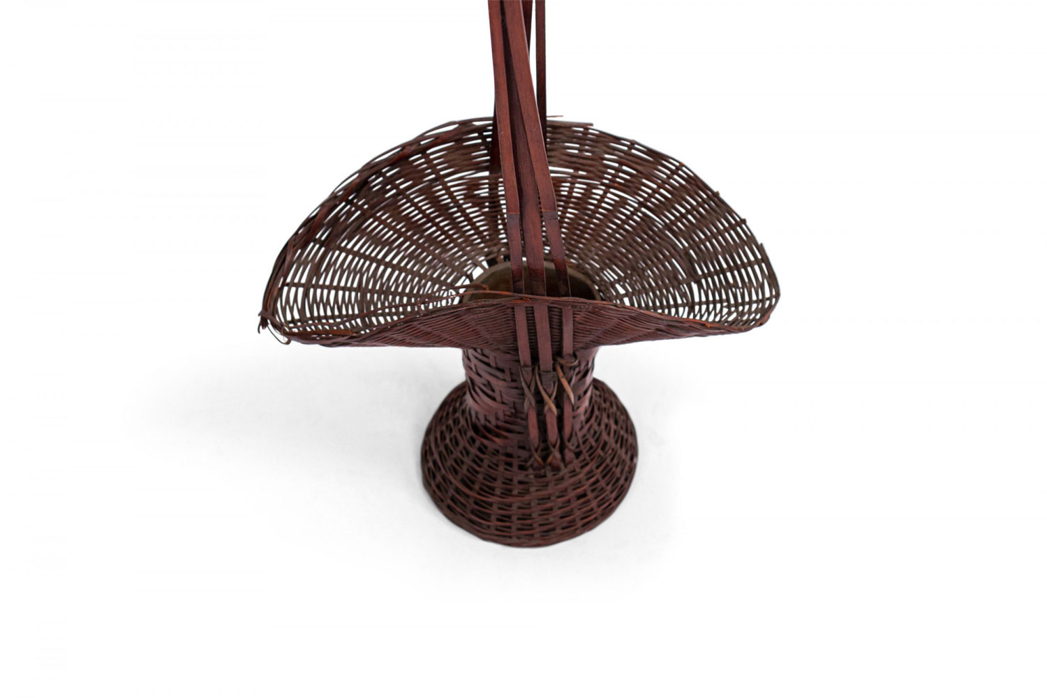Asian Japanese (Mission) natural wicker flower basket shaped vase with tall hoop handle..