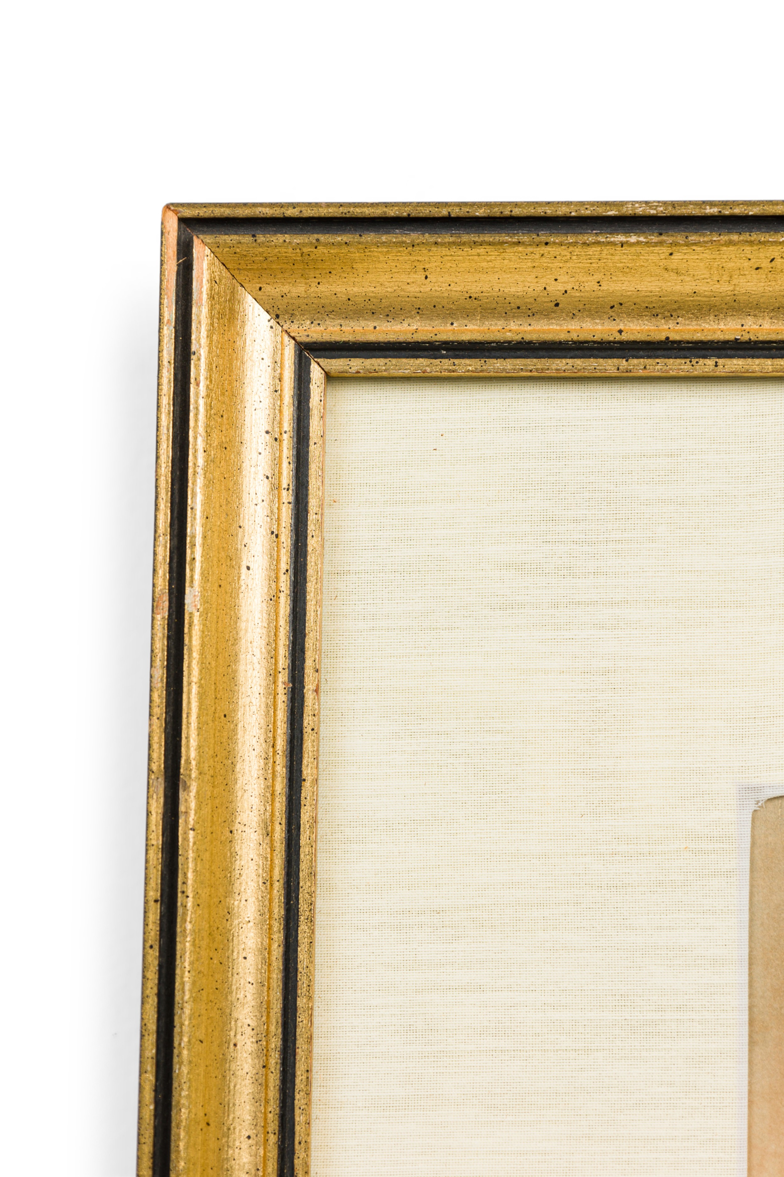 Vintage Asian Japanese style picture in a gold frame of a peacock standing on a branch having flowers with coligraphy and signed in a gold frame
